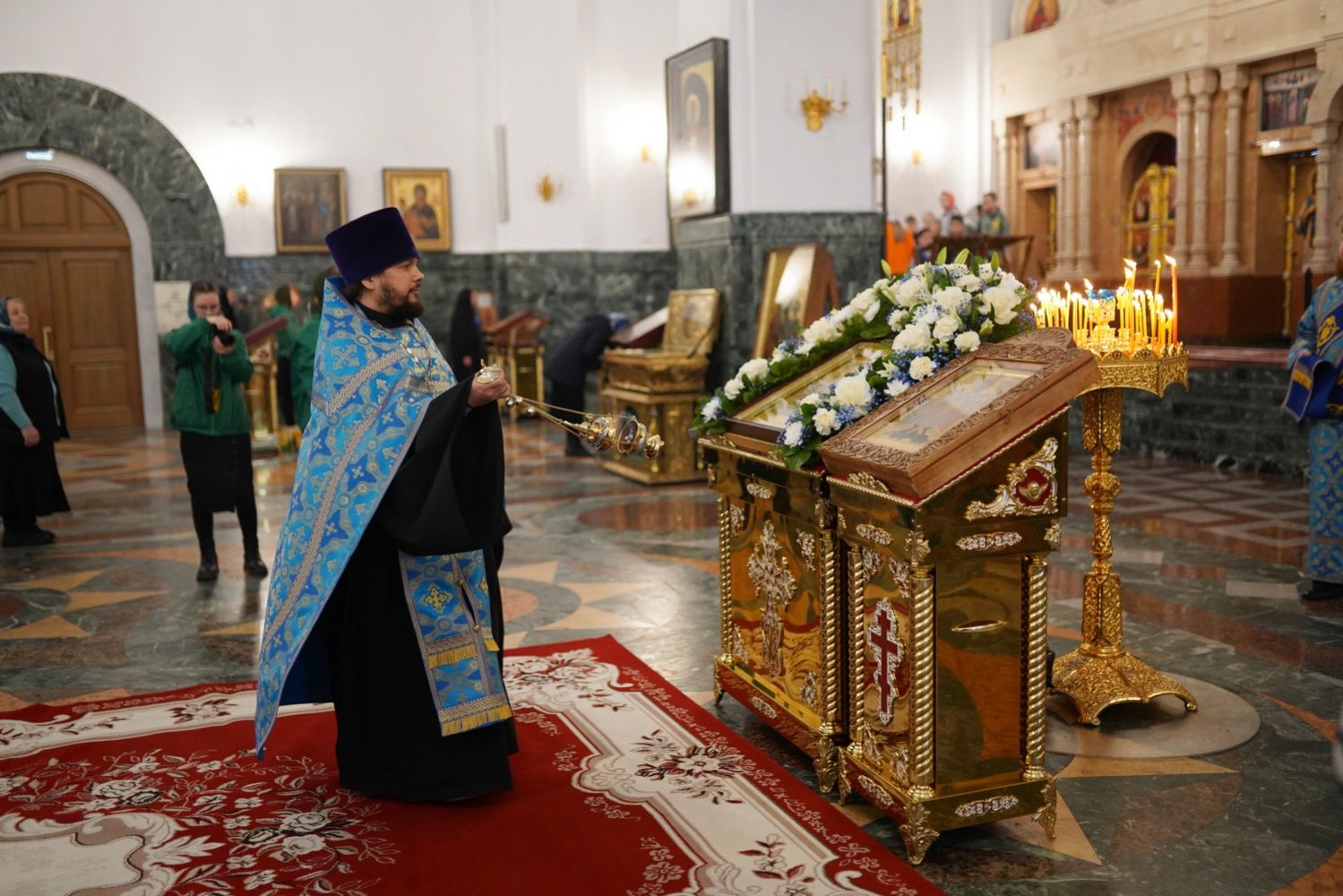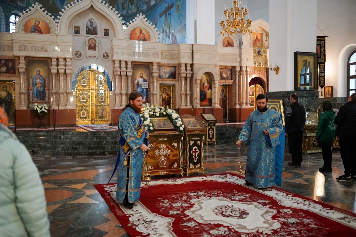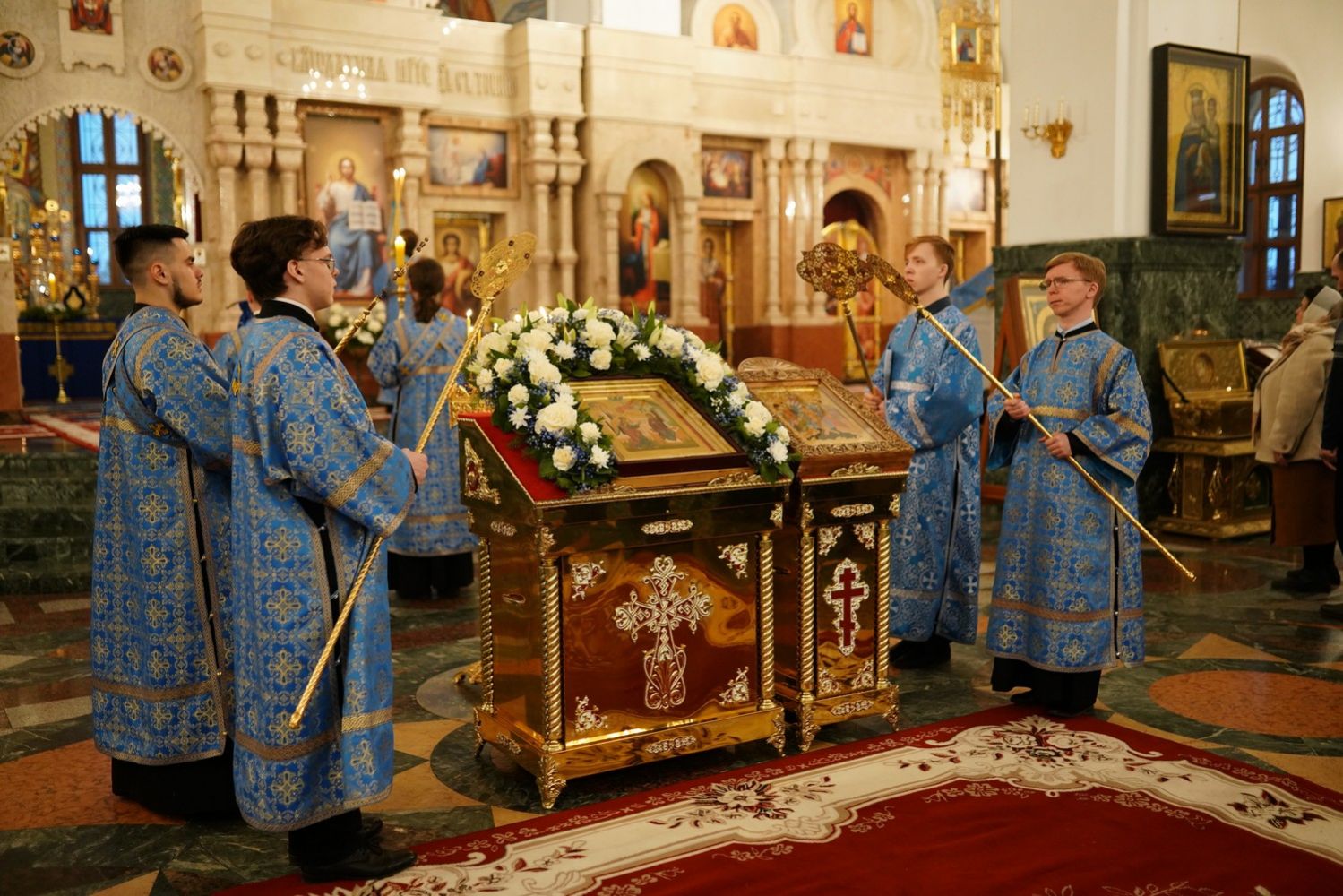 Архипастырю сослужили секретарь Йошкар-Олинского епархиального управления архимандрит Серафим (Пасанаев), ключарь собора протоиерей Сергий Поглазов, клирики собора и протодиакон Михаил Козловский. Пели старший и младший составы детско-юношеского хора «Благовест» под руководством регентов Татьяны Черновой и Софии Андреевой. Часть песнопений звучала в исполнении хора церковно- и священнослужителей Йошкар-Олинской епархии под управлением иерея Евгения Самойлова.