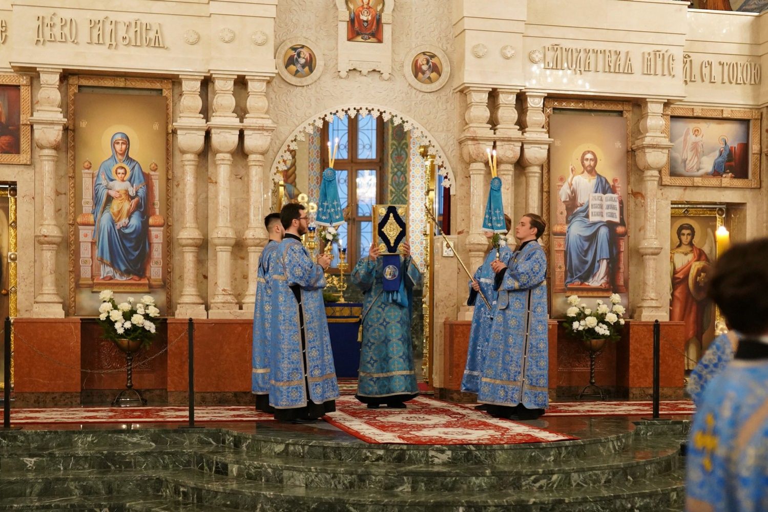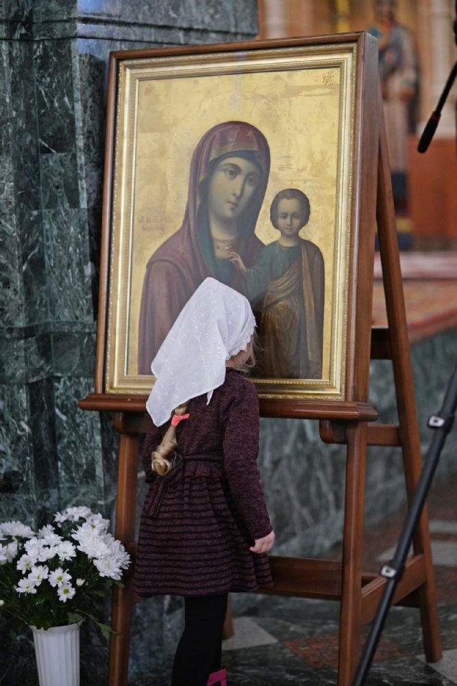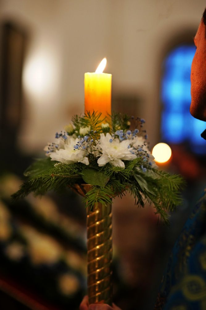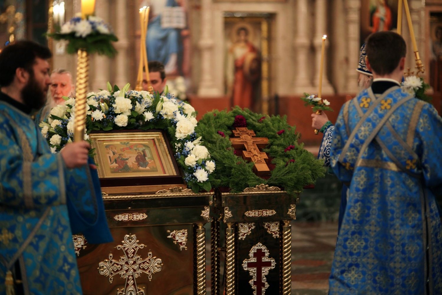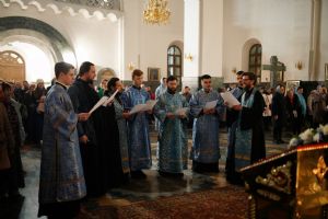 На утрене звучал канон, составленный преподобным Иоанном Дамаскиным в форме диалога Архангела Гавриила и Девы Марии.