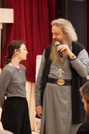 Отец Лука поведал учащимся о таинствах Церкви, о грехах и раскаянии на примере Евангелия от Иоанна (Ин. 8, 3-11), где говорится о грешнице, которую хотели побить камнями, и о великом милосердии Божием.