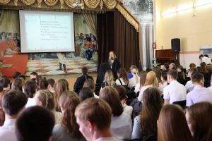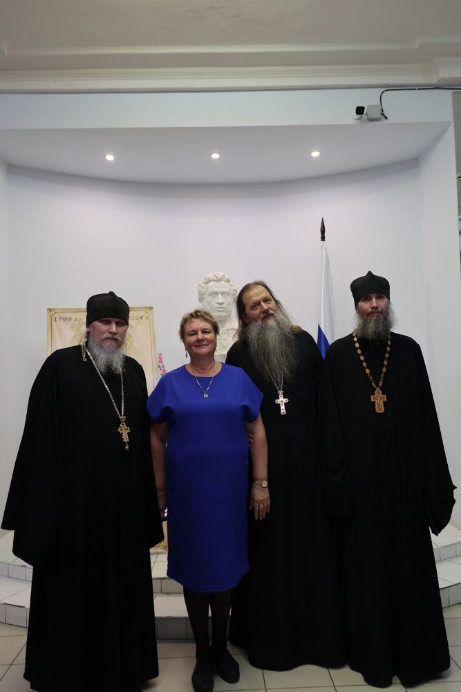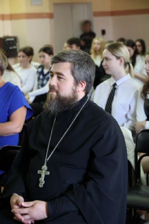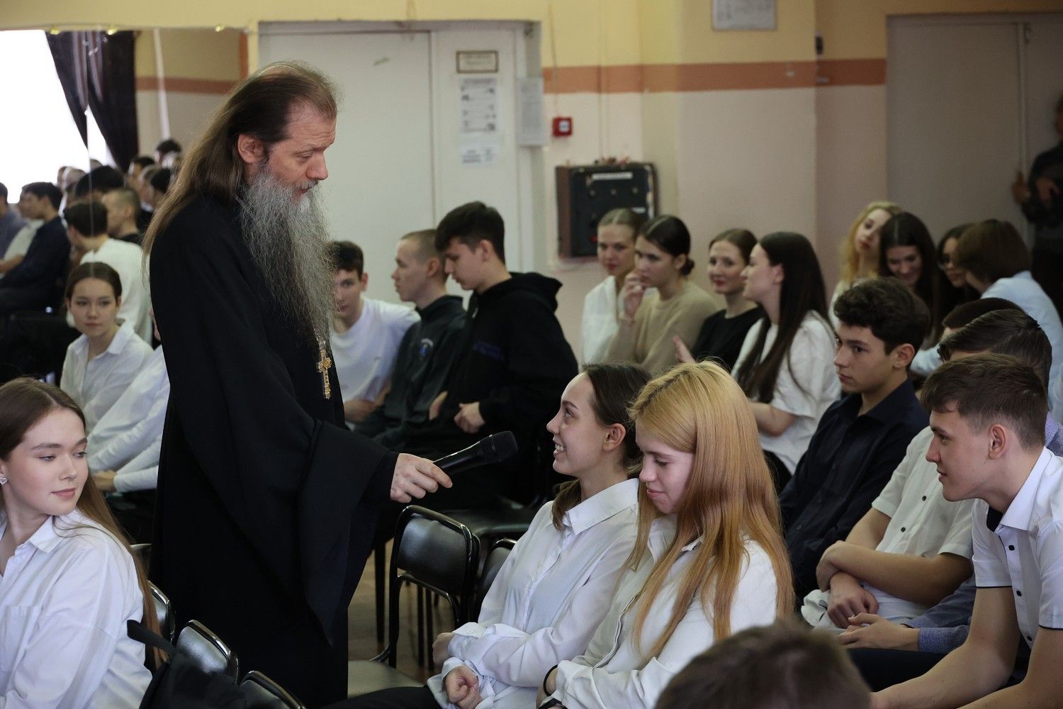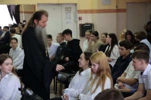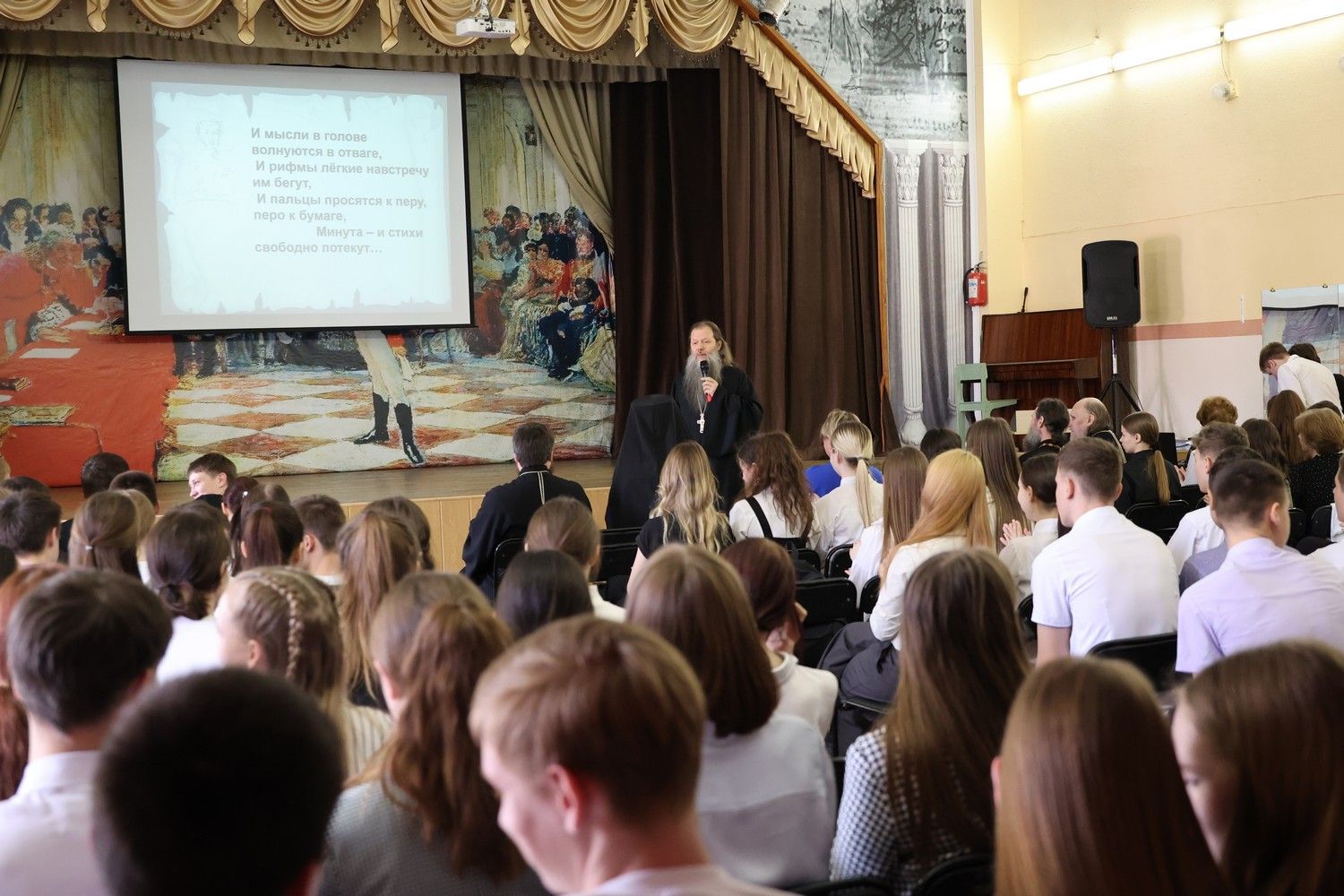 Первую беседу гость провел со старшеклассниками средней школы № 9 им. А.С. Пушкина г. Волжска. На встрече присутствовал владыка Феофан. Тема беседы: «А.С. Пушкин и Н.Н. Гончарова». В начале встречи учащиеся представили вниманию собравшихся литературную страничку, прочитав стихи А.С. Пушкина. Далее отец Артемий перенес слушателей в XIX век, раскрыв нравственную красоту, духовное воспитание и обаятельные свойства кроткого характера Натальи Гончаровой, призвав молодое поколение следовать этим качествам. «Девичья честь, чистота, нетронутость, незлобие были и остаются, по сути, главными внутренними требованиями совести», – резюмировал батюшка.