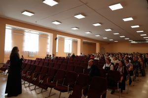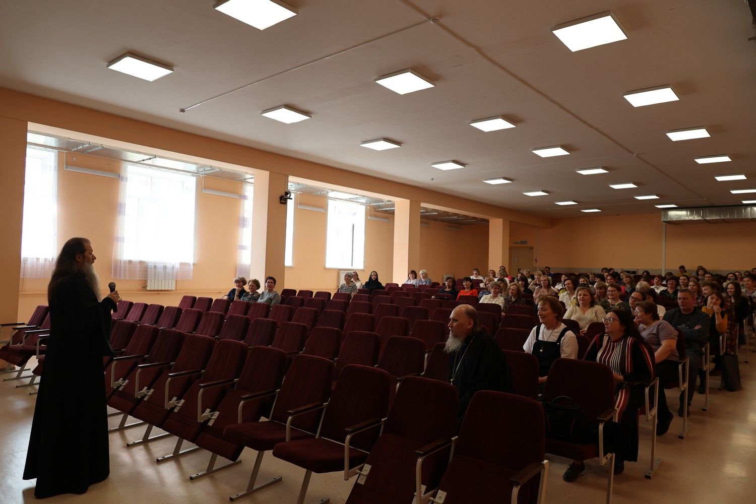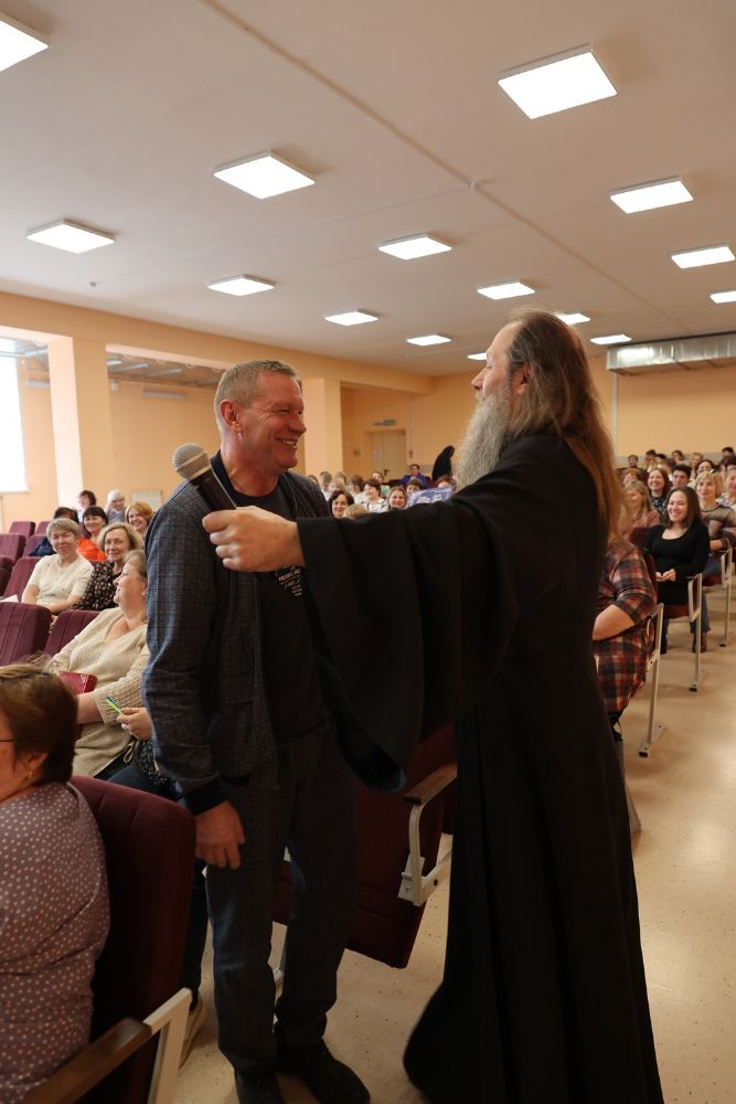 Вторая встреча протоиерея Артемия Владимирова состоялась в средней школе №5 с директорами школ, заведующими детских дошкольных учреждений, педагогами по направлению духовно-нравственного воспитания. Здесь была представлена тема: «Об источнике вдохновения для педагогической деятельности и творчества». Общение прошло в доброй душевной обстановке, со свойственным батюшке юмором, и в то же время с духовной глубиной и высоким поэтическим слогом.