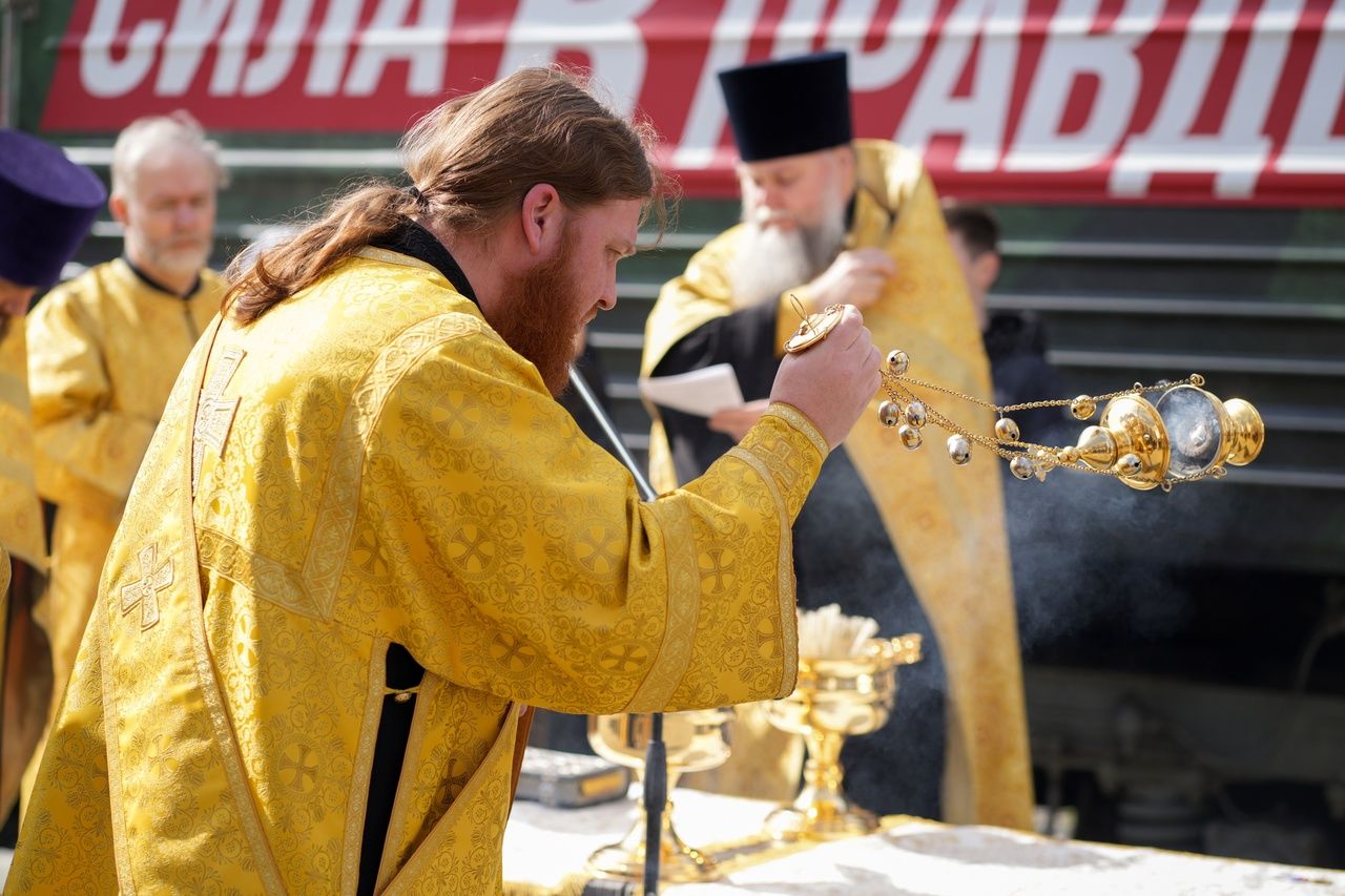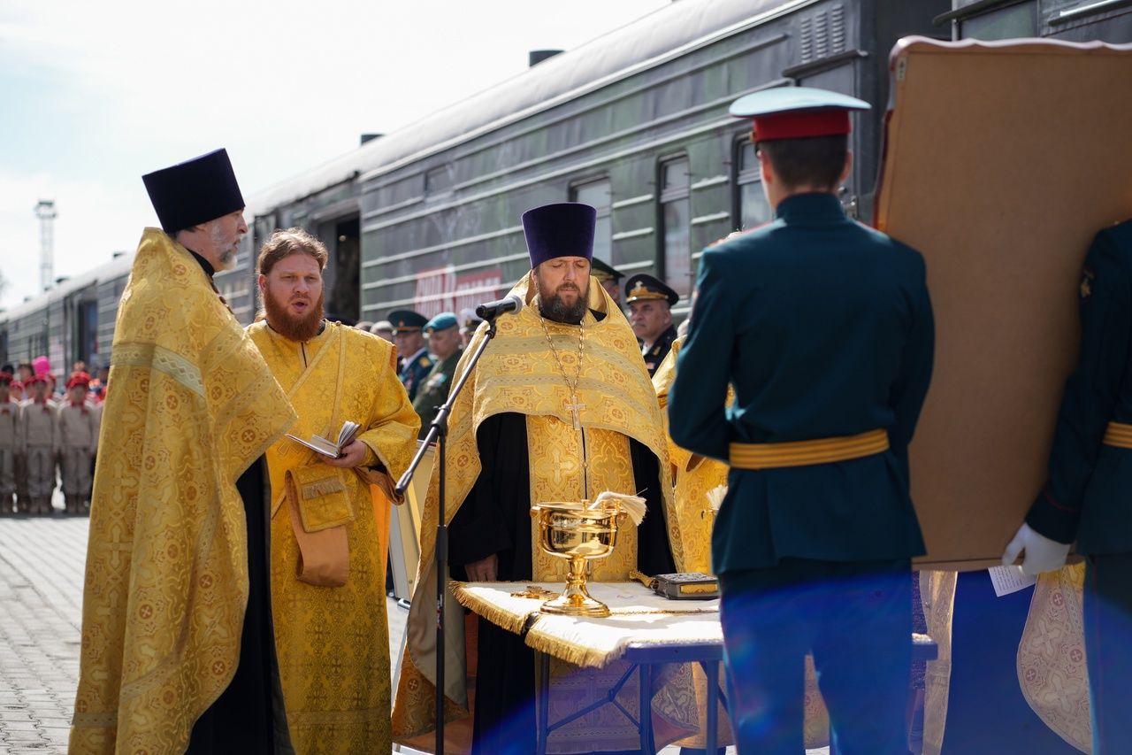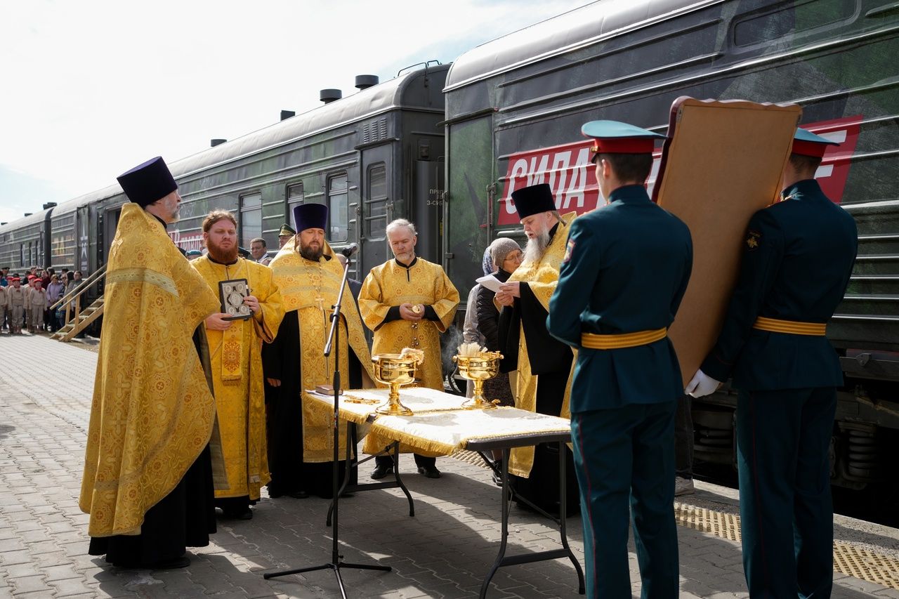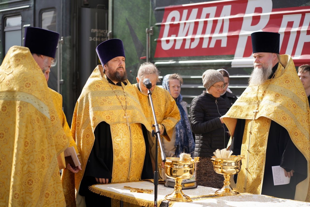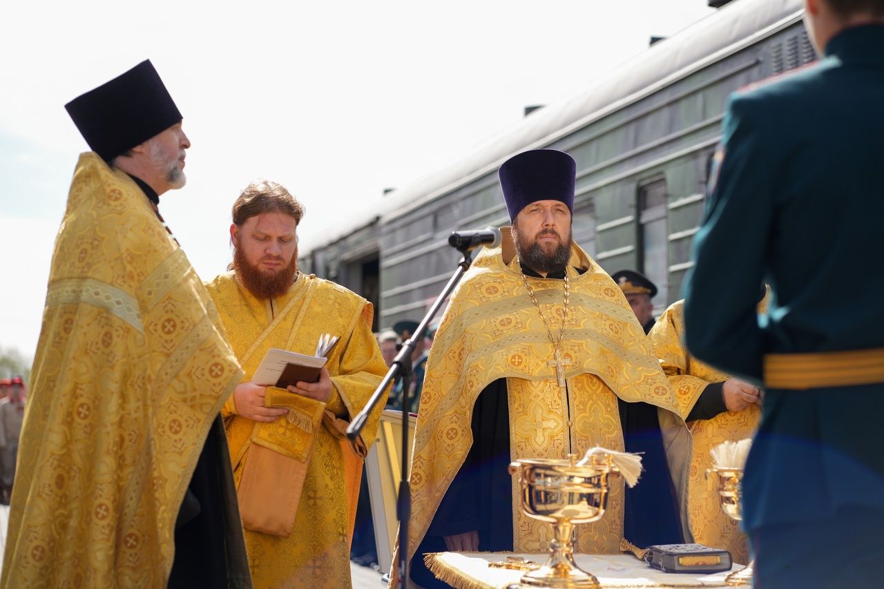 По прибытии поезда был отслужен молебен о Победе, возглавил который благочинный Йошкар-Олинского церковного округа протоиерей Андрей Норкин. Ему сослужили руководитель епархиального отдела по взаимодействию с правоохранительными органами и Вооруженными силами протоиерей Александр Бачурин, полковой священник Георгий Колотов и клирик Благовещенского кафедрального собора диакон Андрей Дружинин. Песнопения молебна исполнял хор «Благовест» под управлением регента Татьяны Черновой.