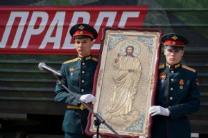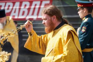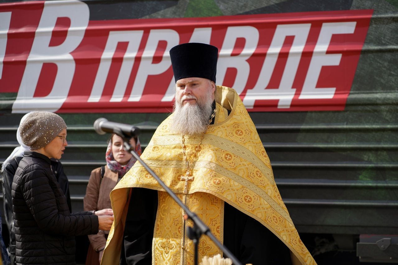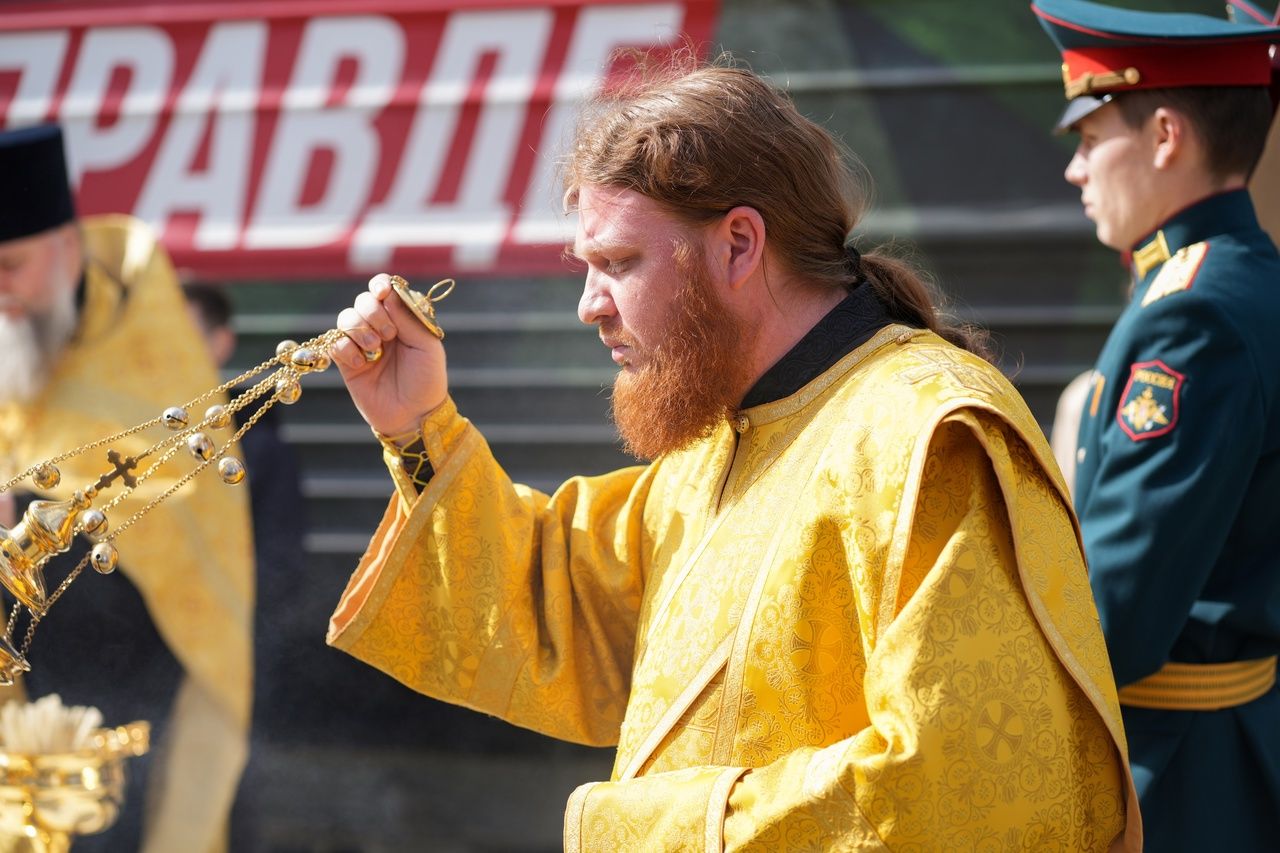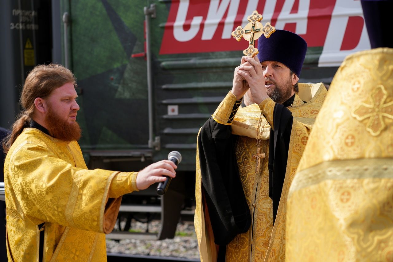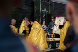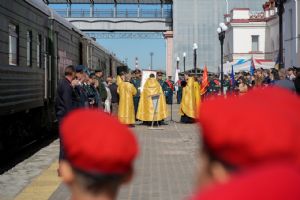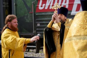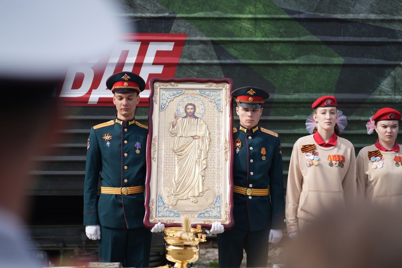 По прибытии поезда был отслужен молебен о Победе, возглавил который благочинный Йошкар-Олинского церковного округа протоиерей Андрей Норкин. Ему сослужили руководитель епархиального отдела по взаимодействию с правоохранительными органами и Вооруженными силами протоиерей Александр Бачурин, полковой священник Георгий Колотов и клирик Благовещенского кафедрального собора диакон Андрей Дружинин. Песнопения молебна исполнял хор «Благовест» под управлением регента Татьяны Черновой.