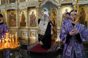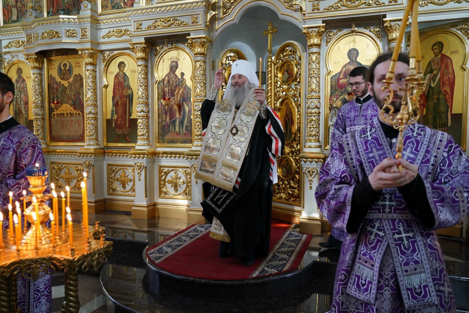 На великом повечерии в центре храма митрополит Иоанн прочитал канон из трех песен, посвященный событиям евангельских зачал, читаемых на службах Страстных понедельника и вторника.