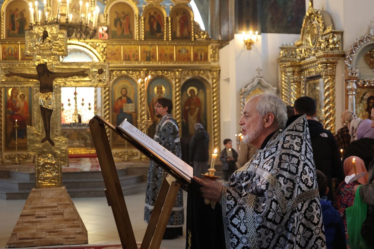 2 мая вечером епископ Волжский и Сернурский Феофан совершил утреню Великого Пятка с чтением двенадцати Евангелий Святых Страстей Господа нашего Иисуса Христа в Никольском кафедральном соборе г. Волжска.