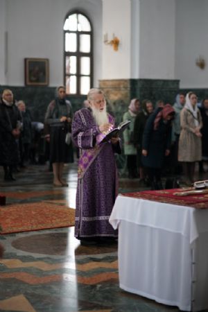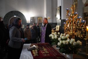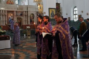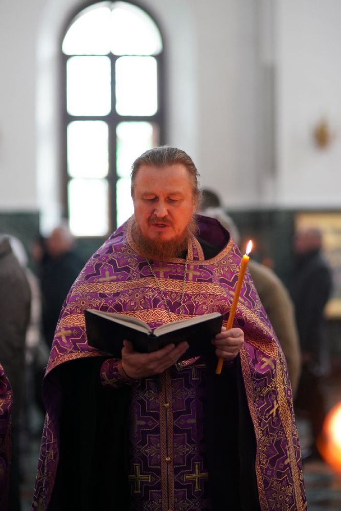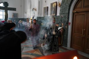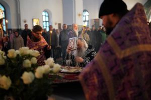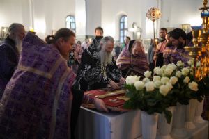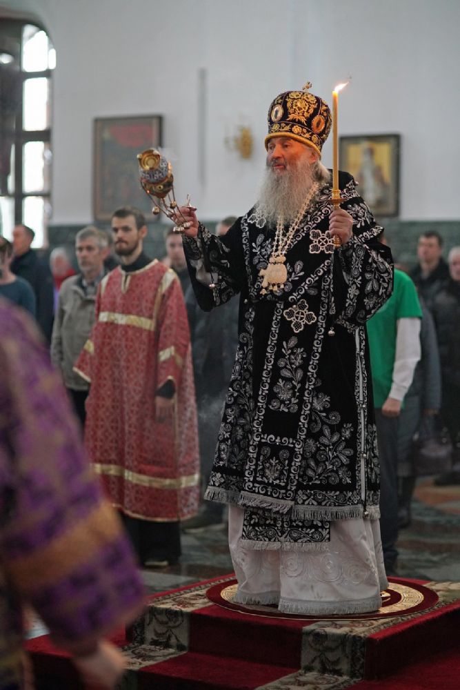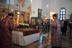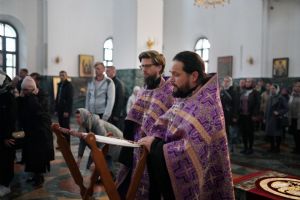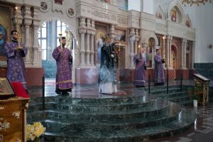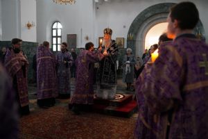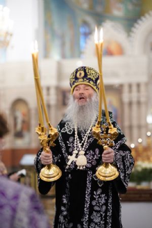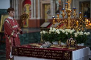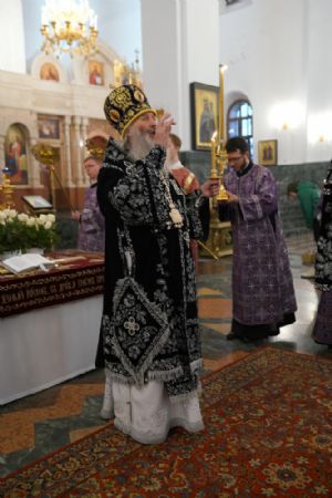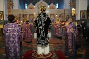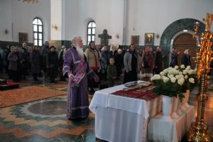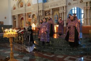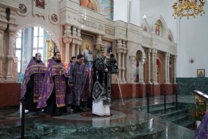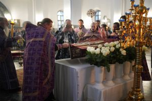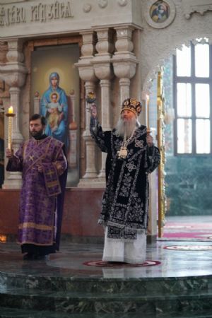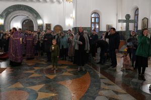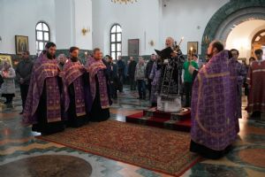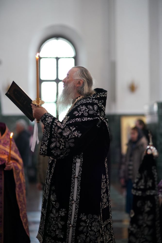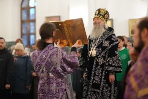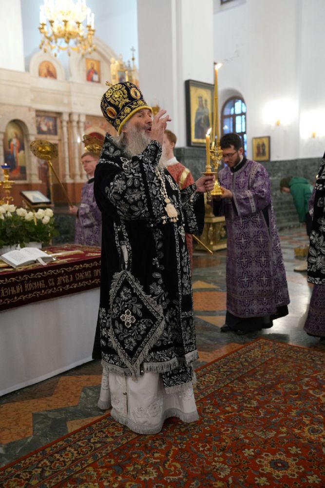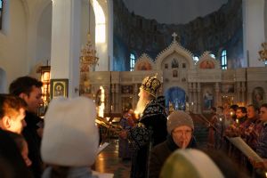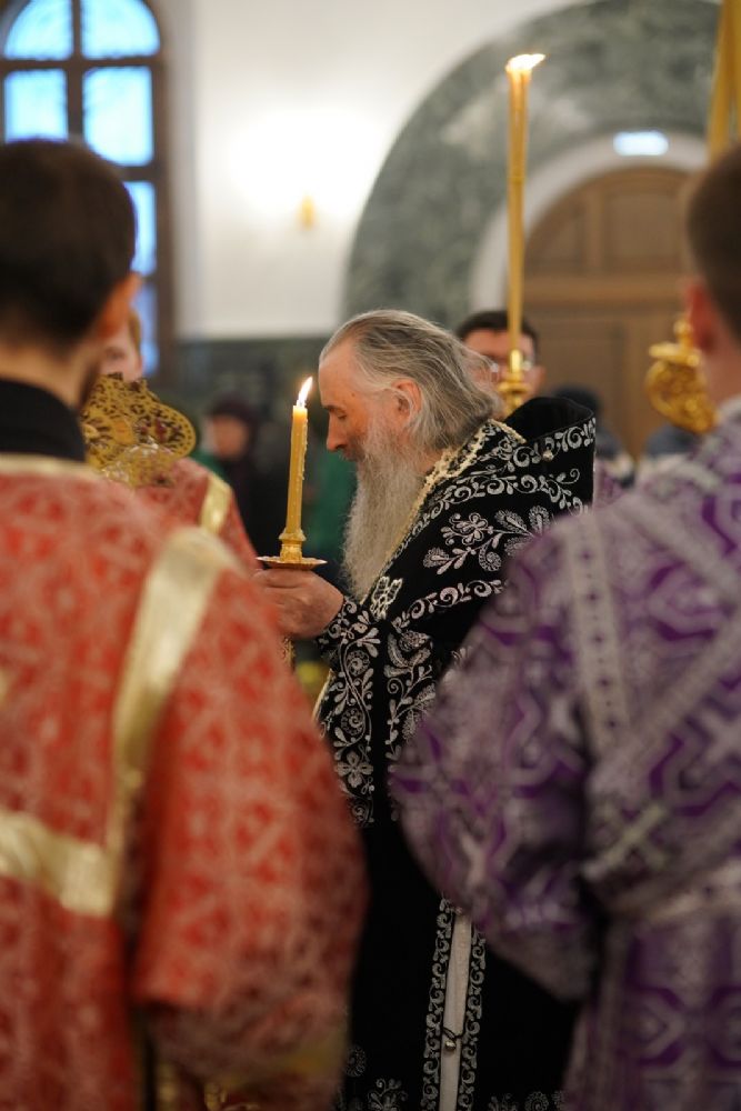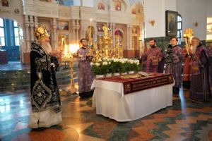 Его Высокопреосвященству сослужили ключарь кафедрального собора протоиерей Сергий Поглазов, клирики собора и протодиакон Михаил Козловский. Песнопения исполнял хор «Благовест» под руководством регента Татьяны Черновой.