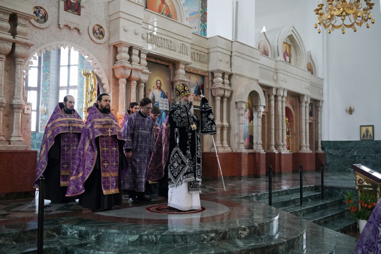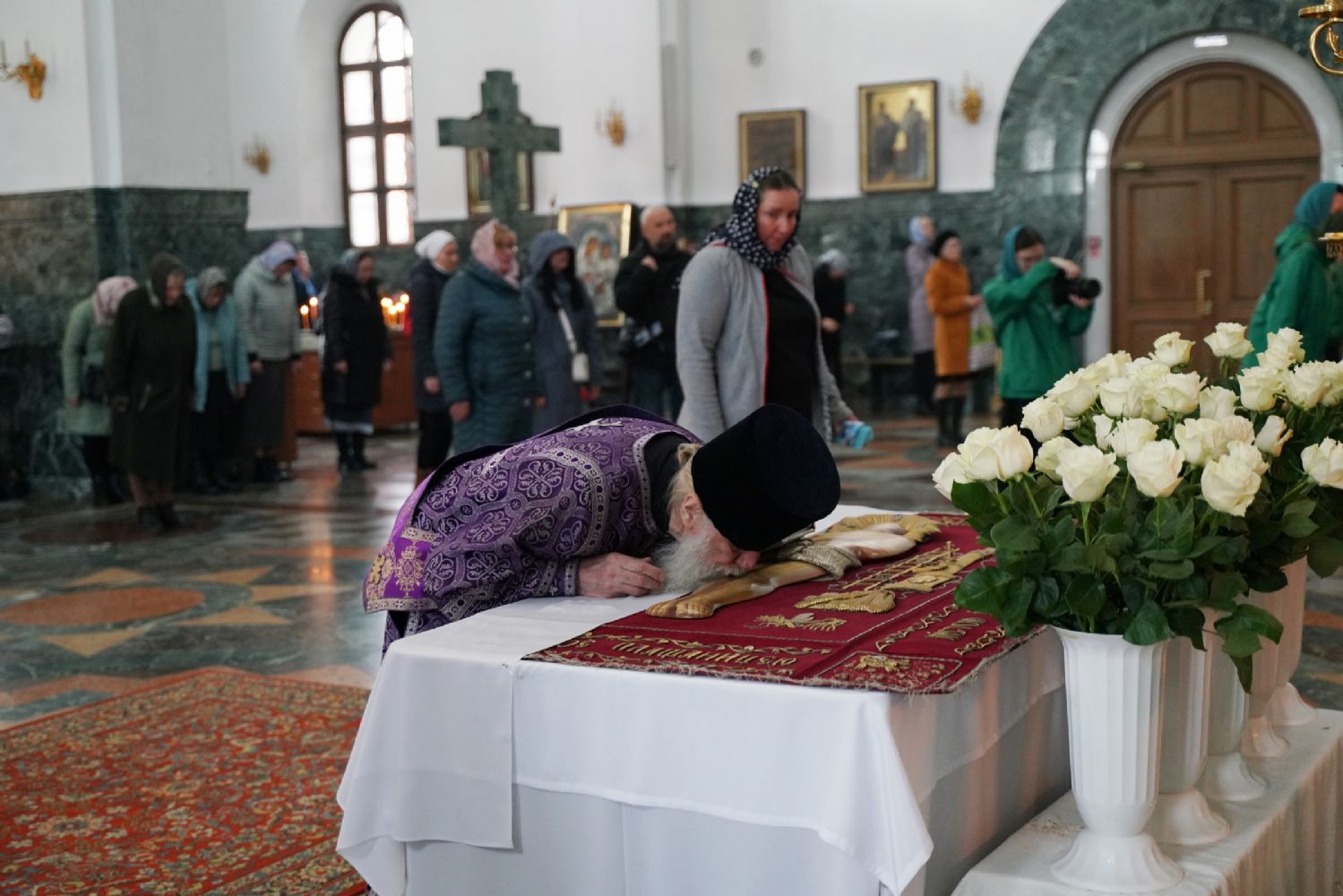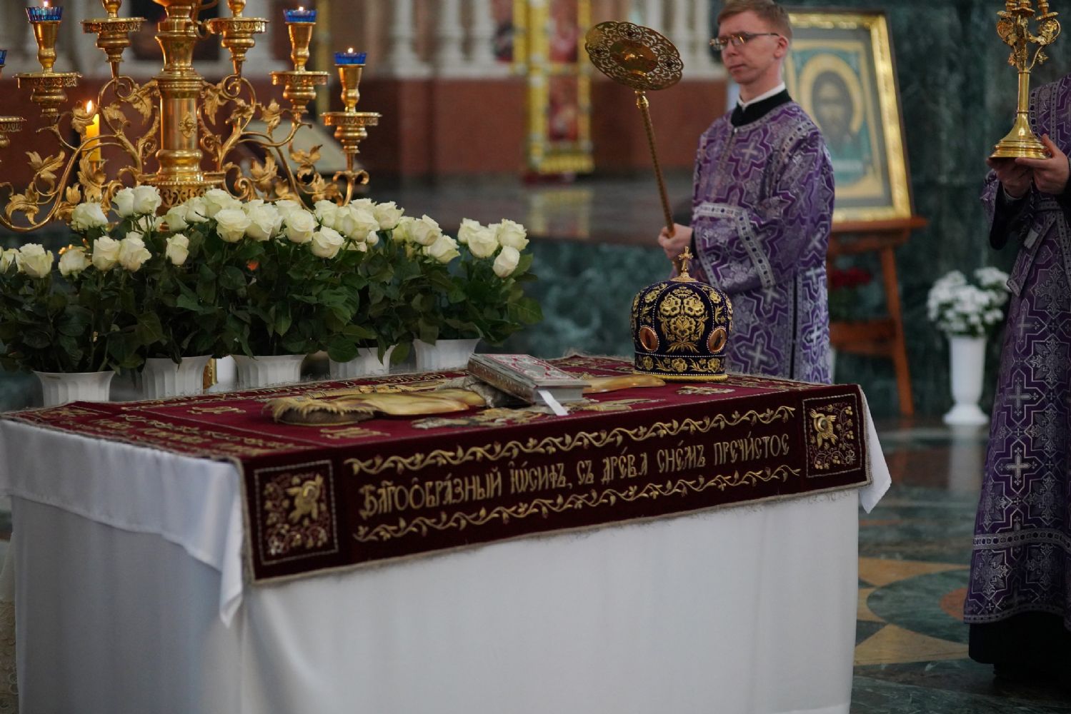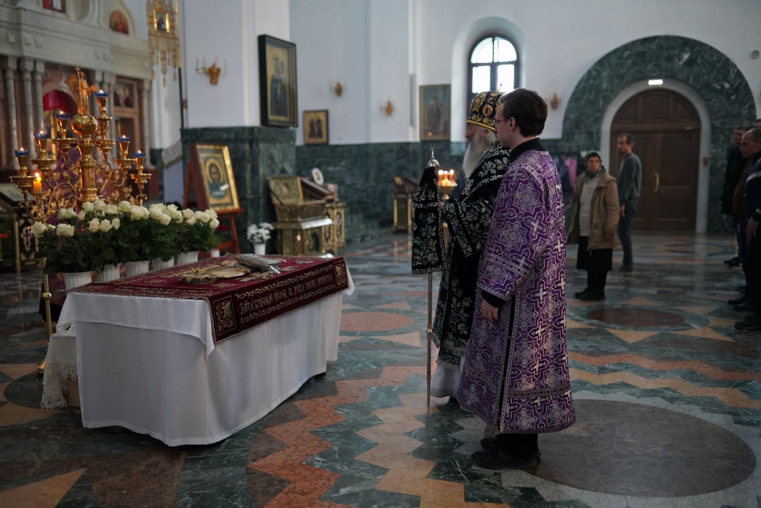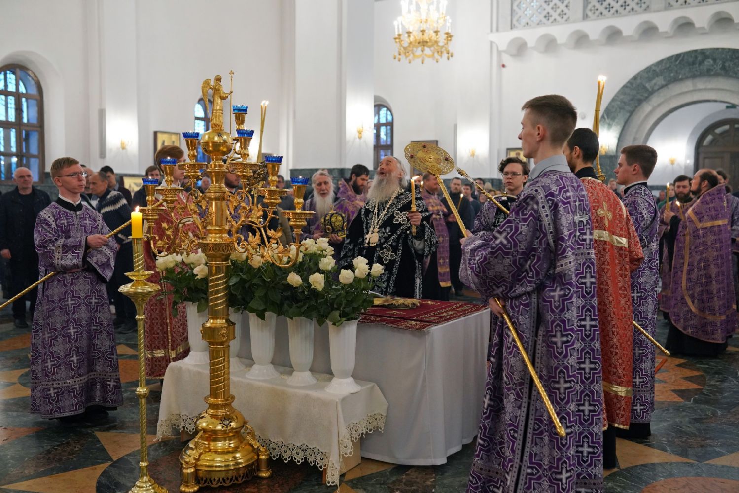 Его Высокопреосвященству сослужили ключарь кафедрального собора протоиерей Сергий Поглазов, клирики собора и протодиакон Михаил Козловский. Песнопения исполнял хор «Благовест» под руководством регента Татьяны Черновой.