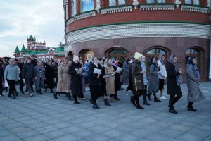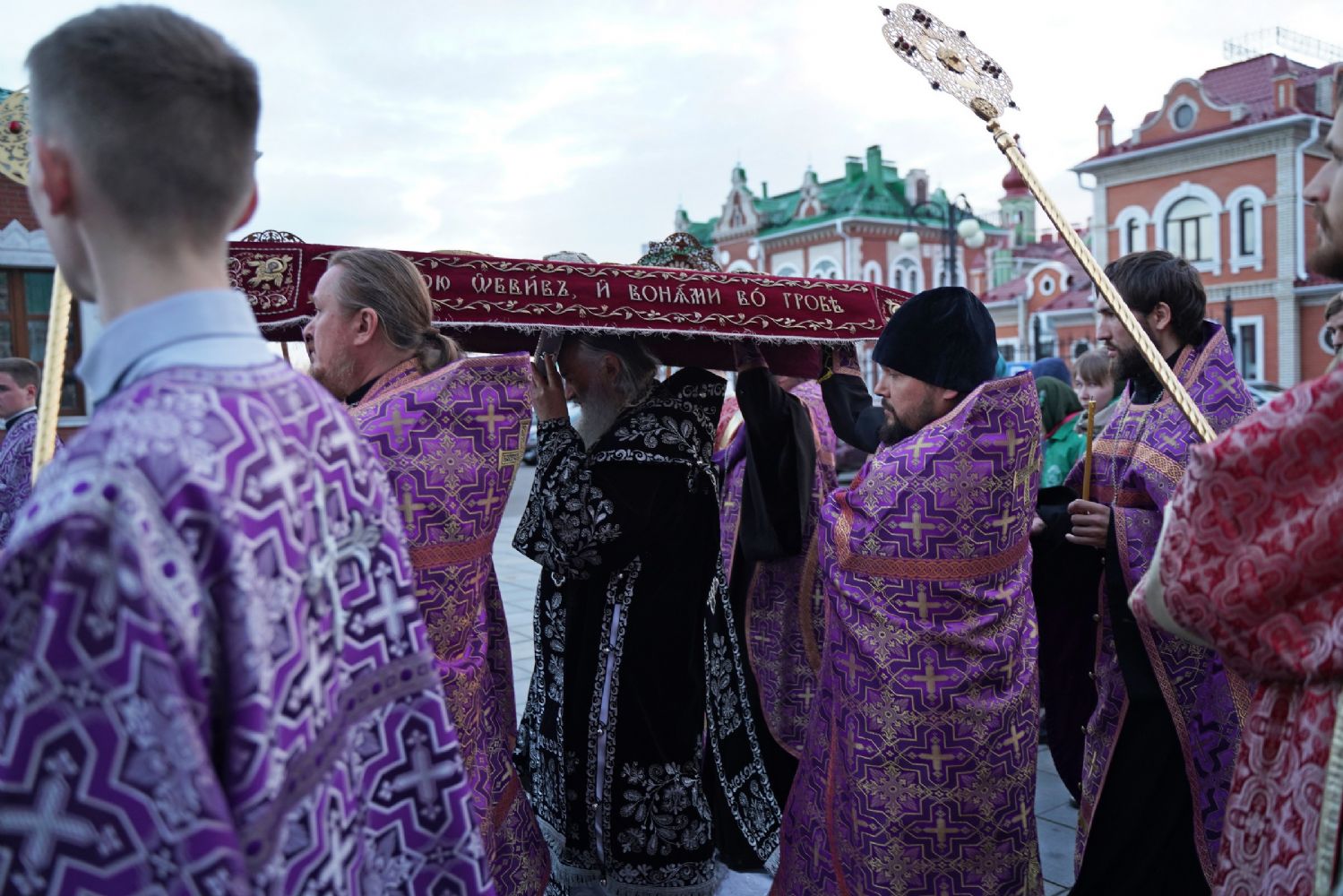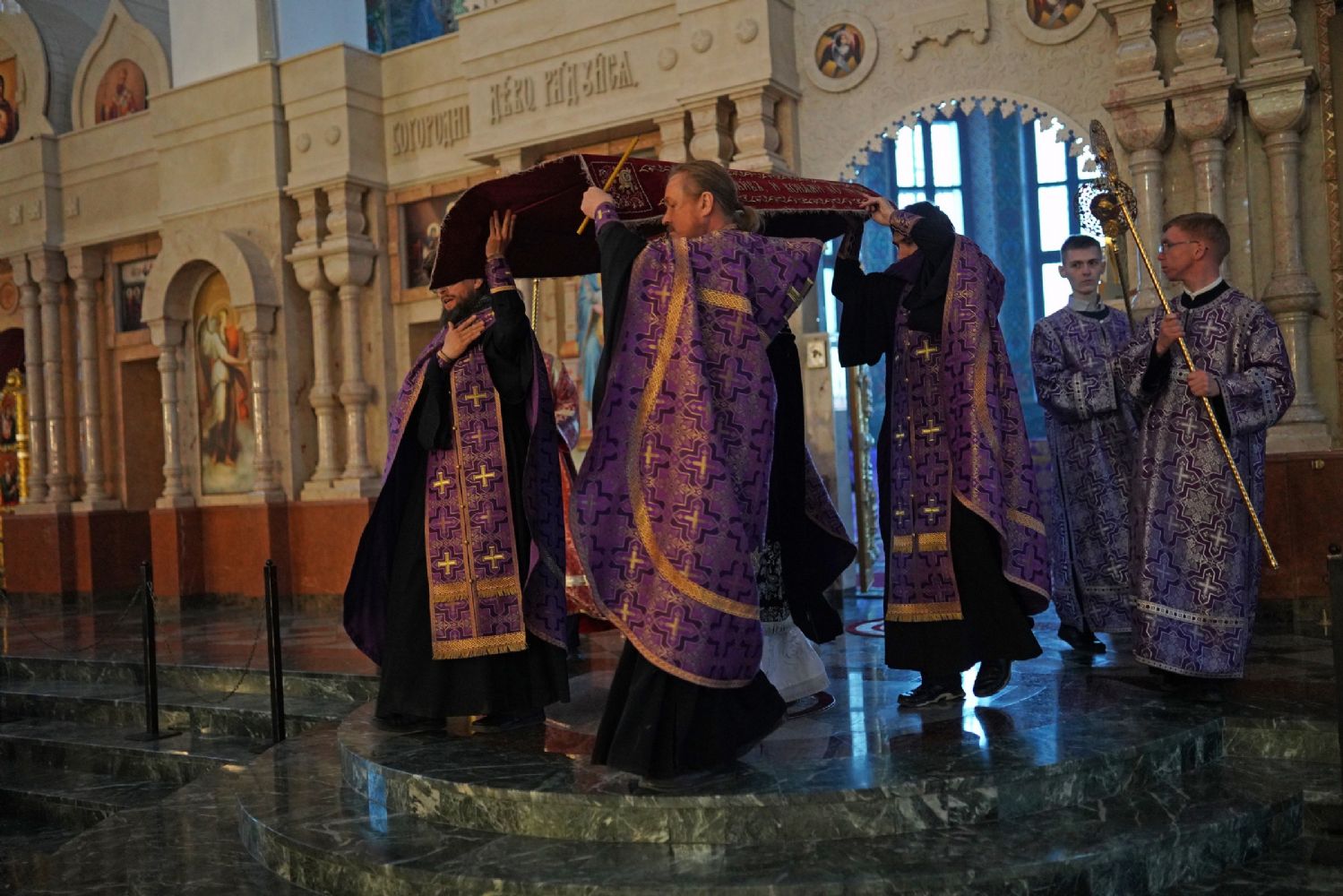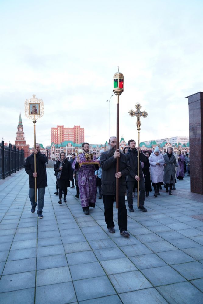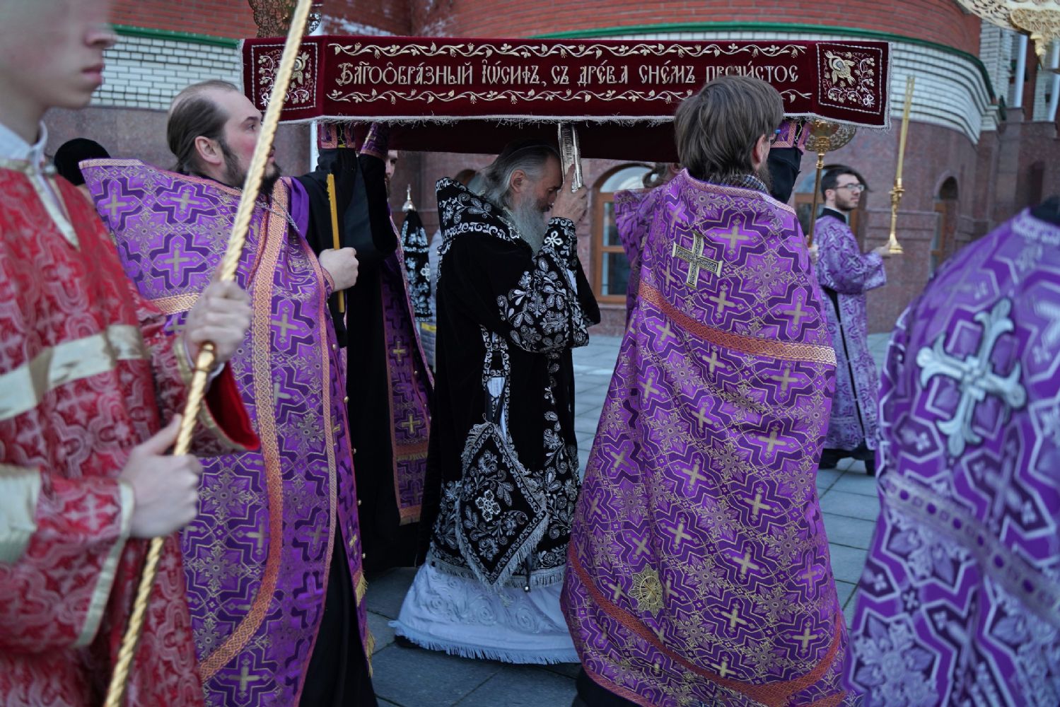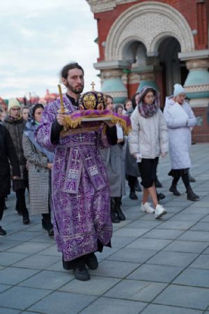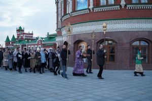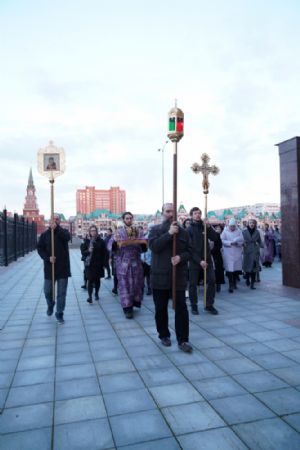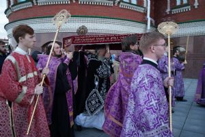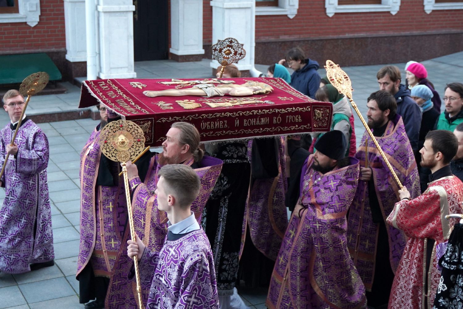 После канона и великого славословия при пении «Святый Боже» и погребальном перезвоне колоколов Плащаница крестным ходом была обнесена вокруг храма в воспоминание погребения Христова, сошествия Его во ад и победы над смертью.