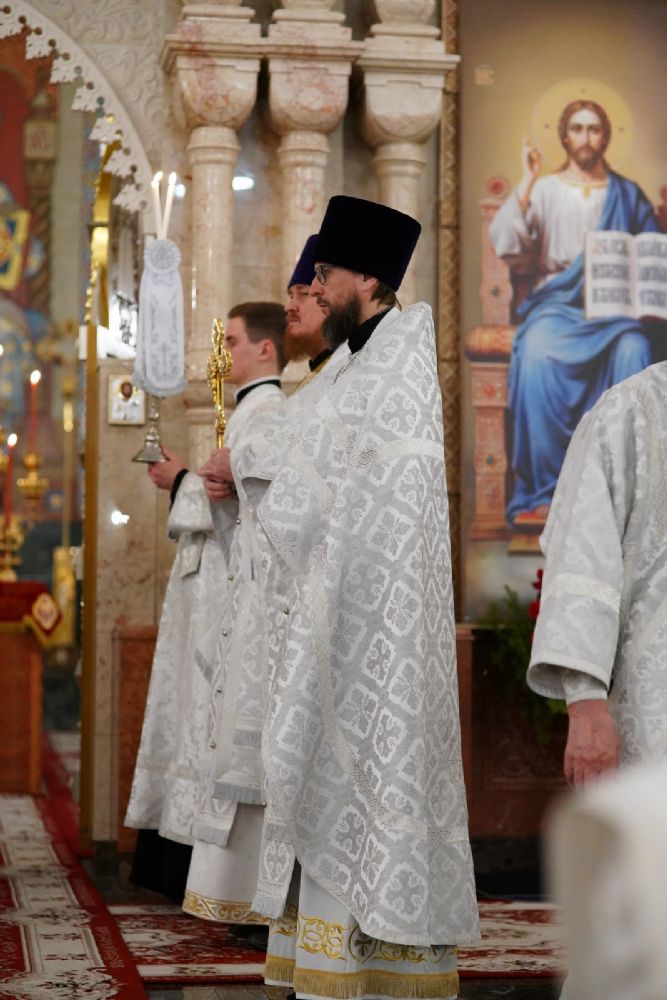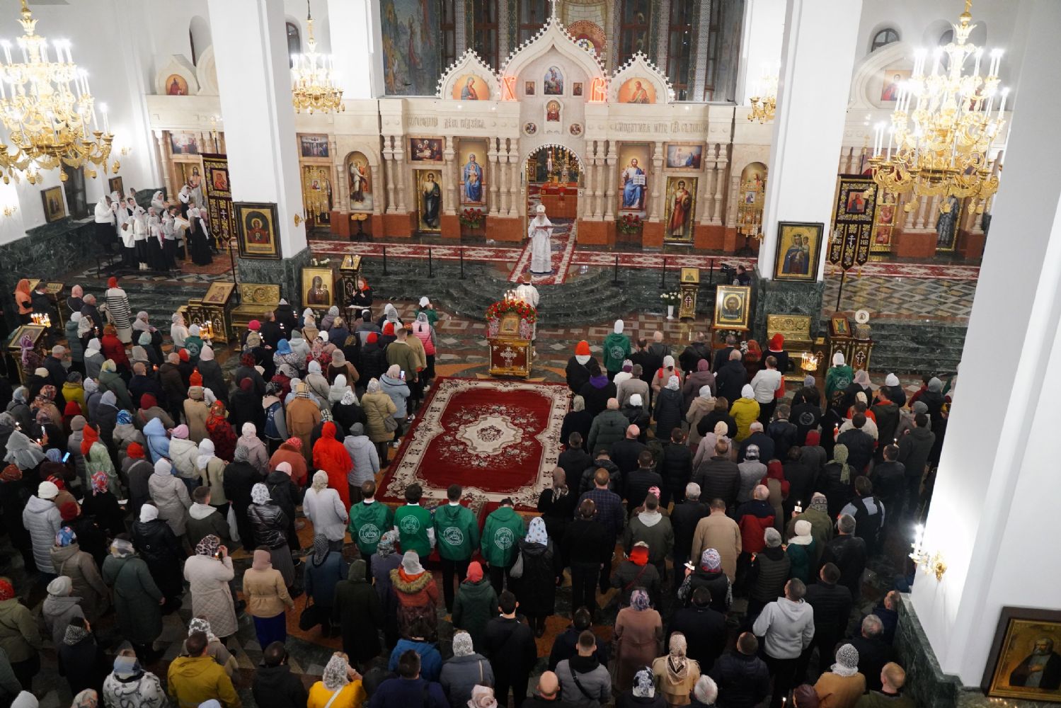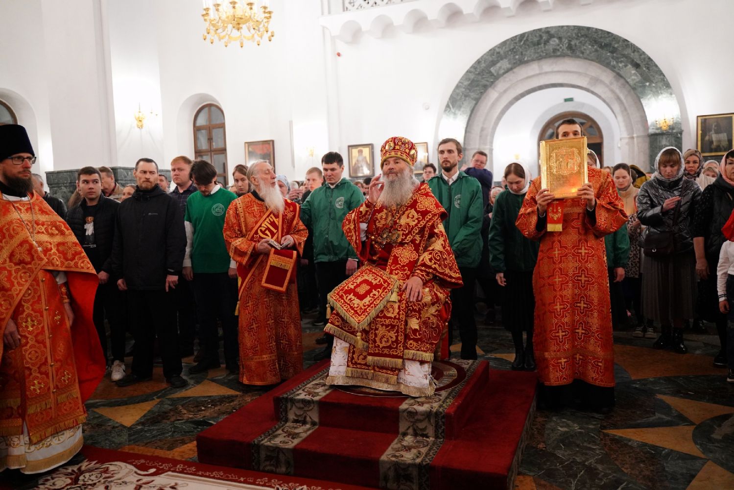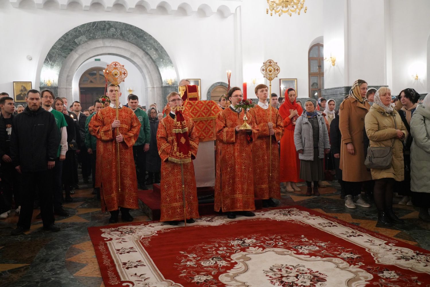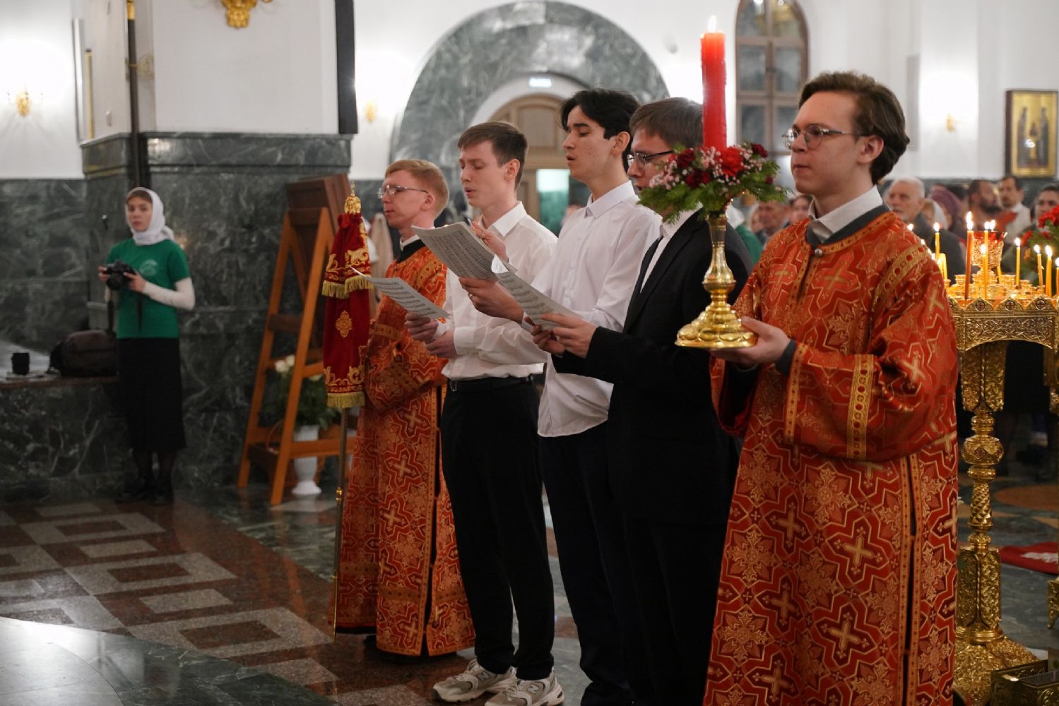 Владыке сослужили ключарь собора протоиерей Сергий Поглазов, клирики собора и протодиакон Михаил Козловский. Богослужебные песнопения исполняли старший и младший составы детско-юношеского хора «Благовест» под управлением регентов Татьяны Черновой и Надежды Поздеевой. Часть песнопений звучала в исполнении хора священно- и церковнослужителей под управлением иерея Евгения Самойлова.