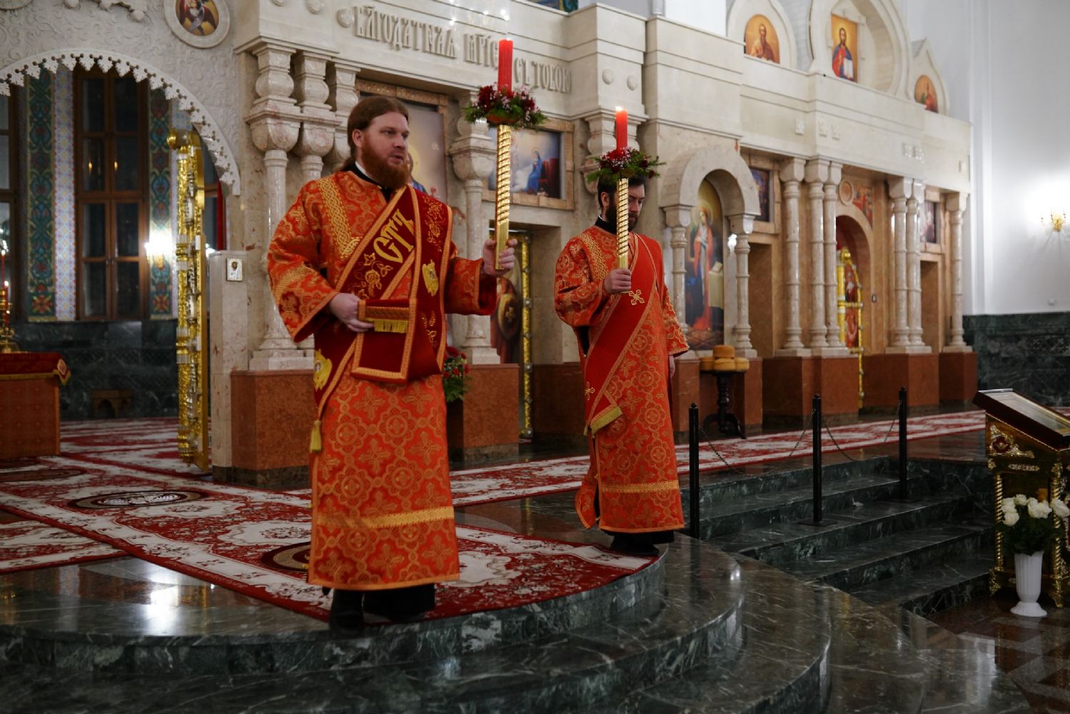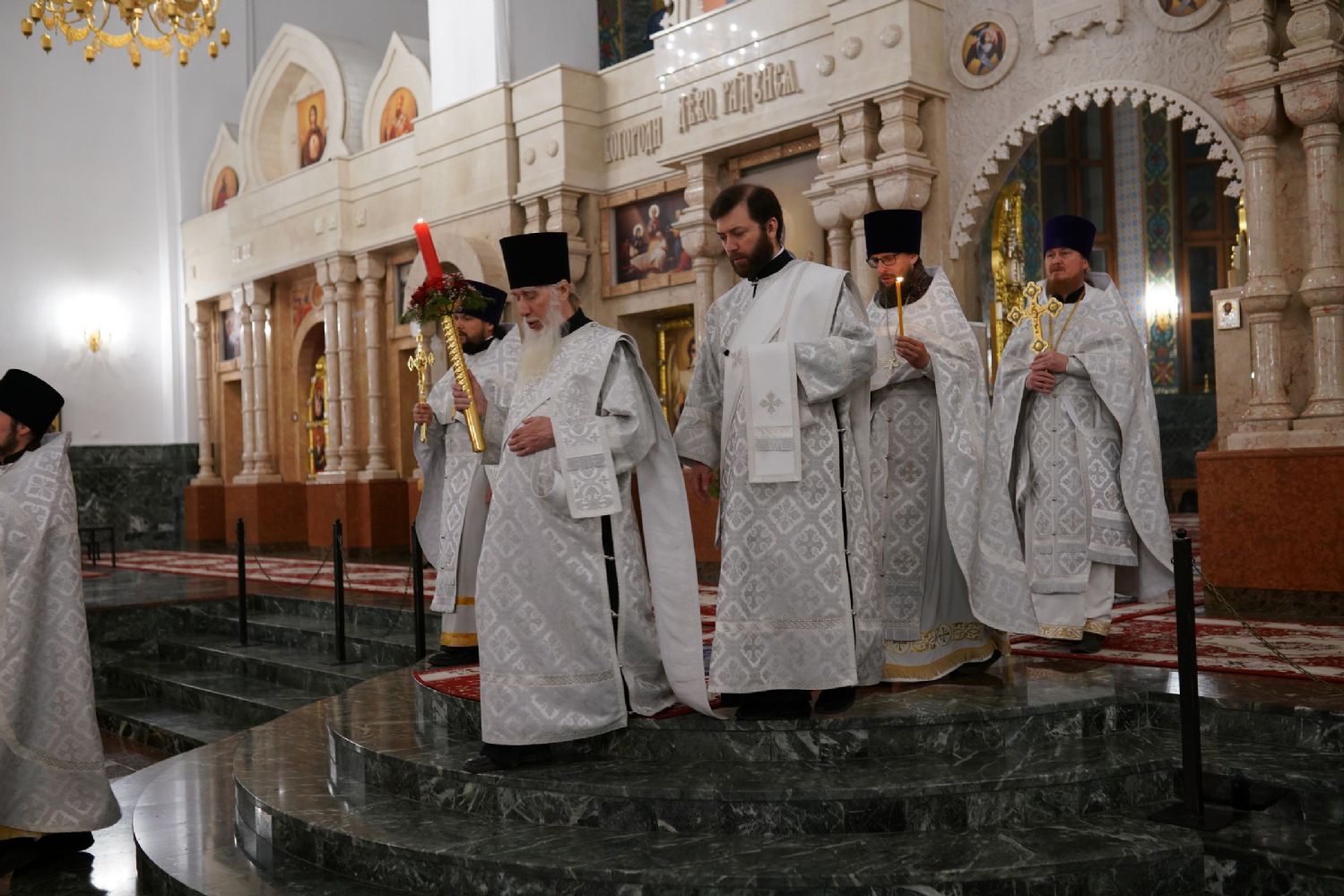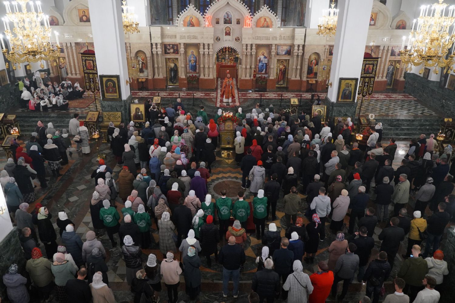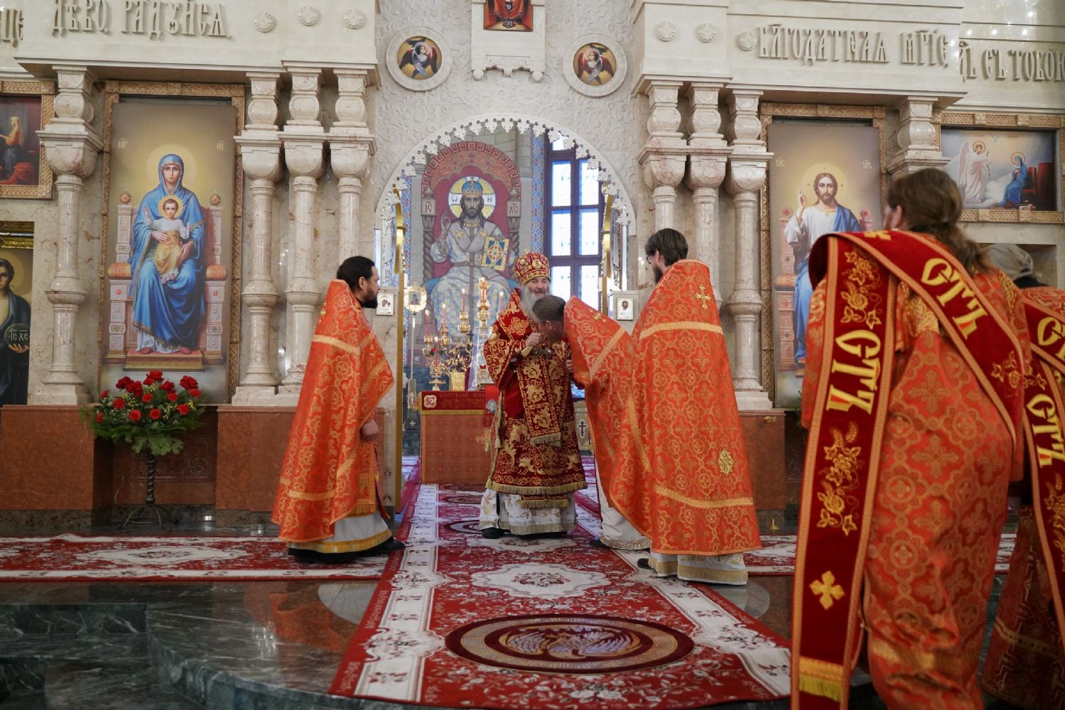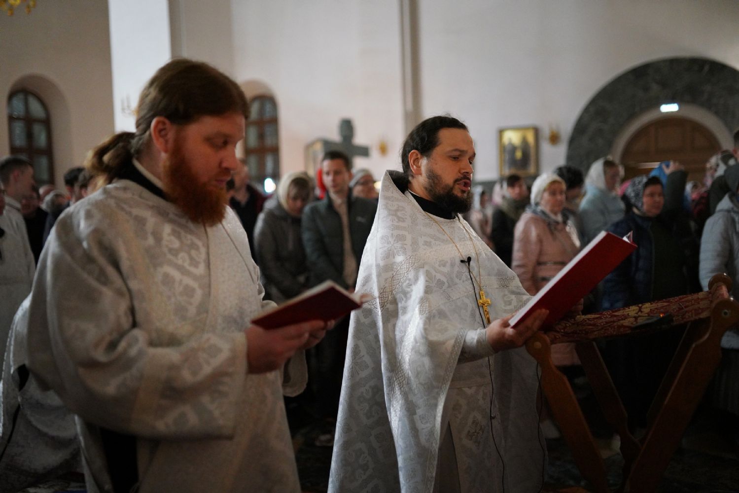Владыке сослужили ключарь собора протоиерей Сергий Поглазов, клирики собора и протодиакон Михаил Козловский. Богослужебные песнопения исполняли старший и младший составы детско-юношеского хора «Благовест» под управлением регентов Татьяны Черновой и Надежды Поздеевой. Часть песнопений звучала в исполнении хора священно- и церковнослужителей под управлением иерея Евгения Самойлова.