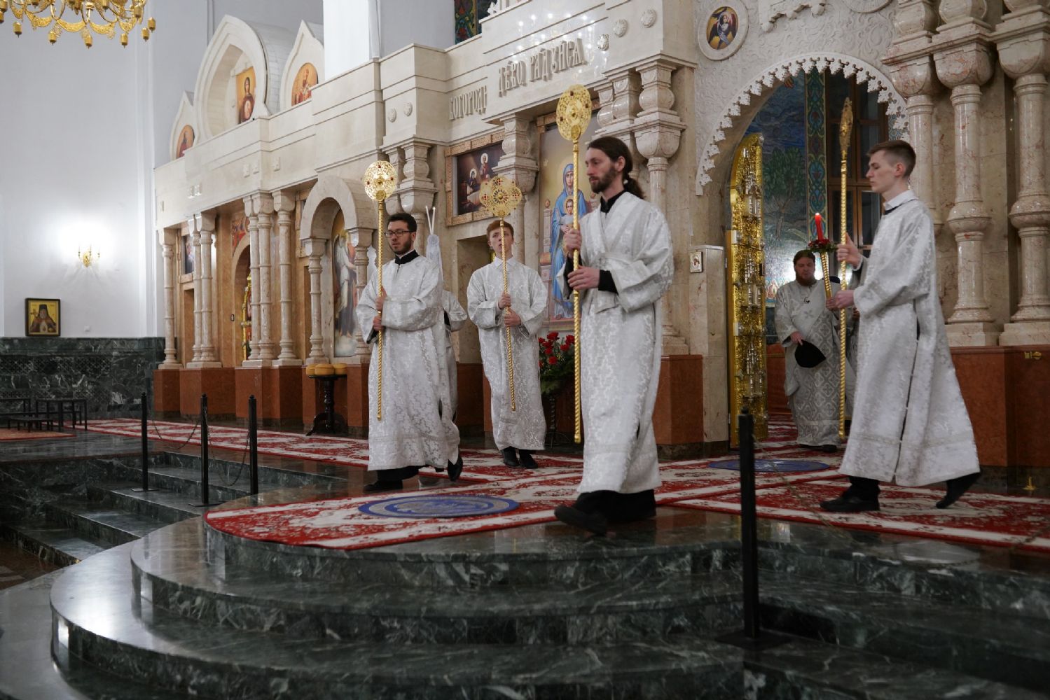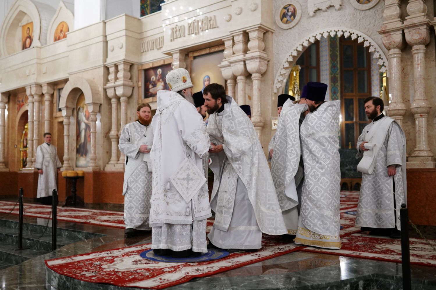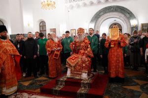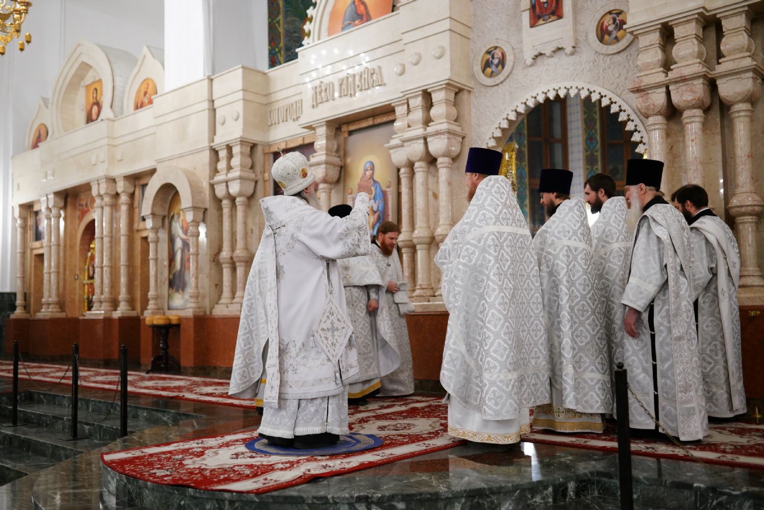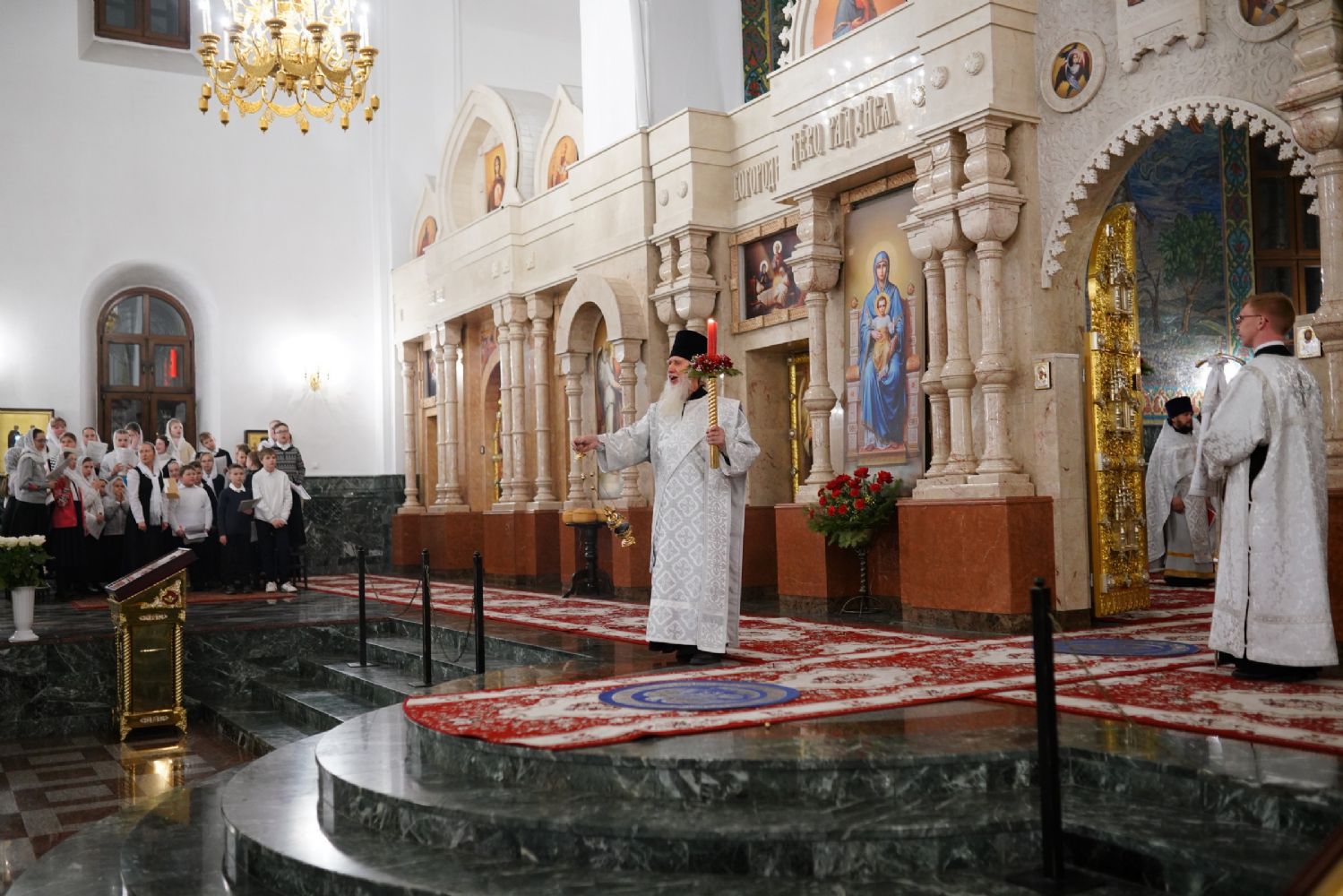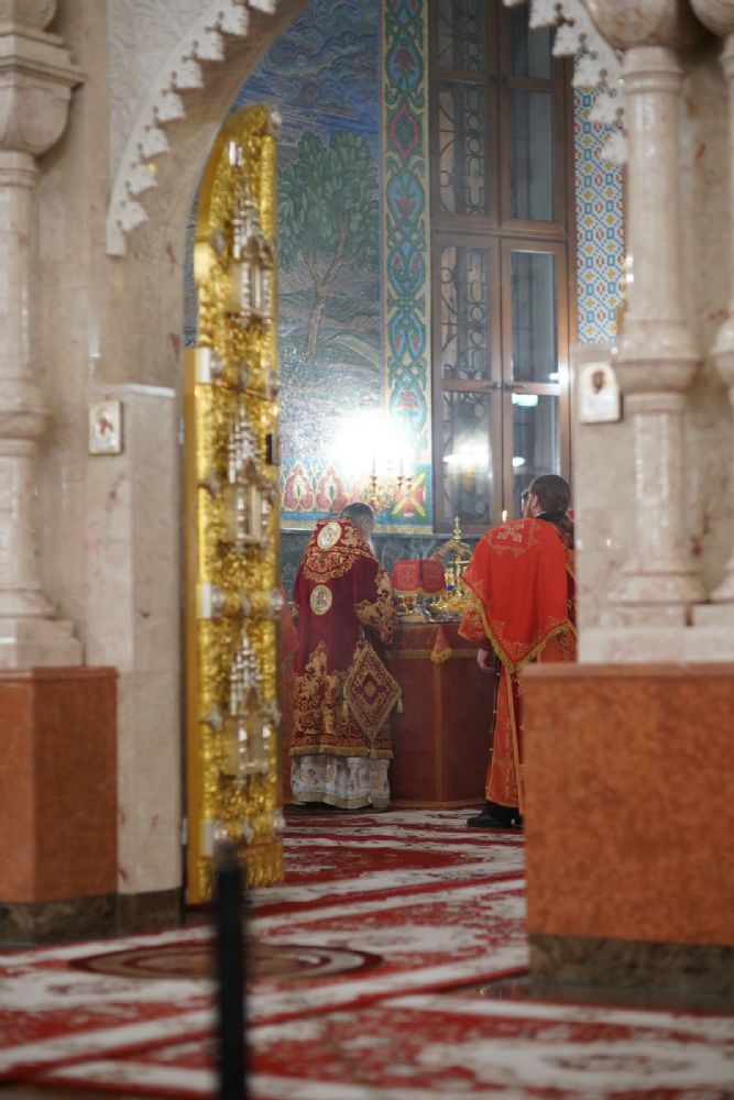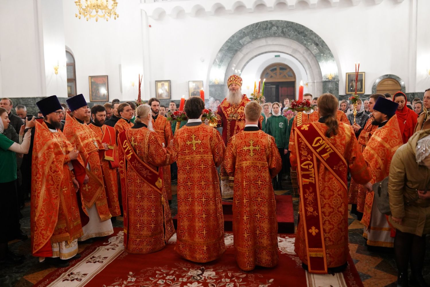 Владыке сослужили ключарь собора протоиерей Сергий Поглазов, клирики собора и протодиакон Михаил Козловский. Богослужебные песнопения исполняли старший и младший составы детско-юношеского хора «Благовест» под управлением регентов Татьяны Черновой и Надежды Поздеевой. Часть песнопений звучала в исполнении хора священно- и церковнослужителей под управлением иерея Евгения Самойлова.