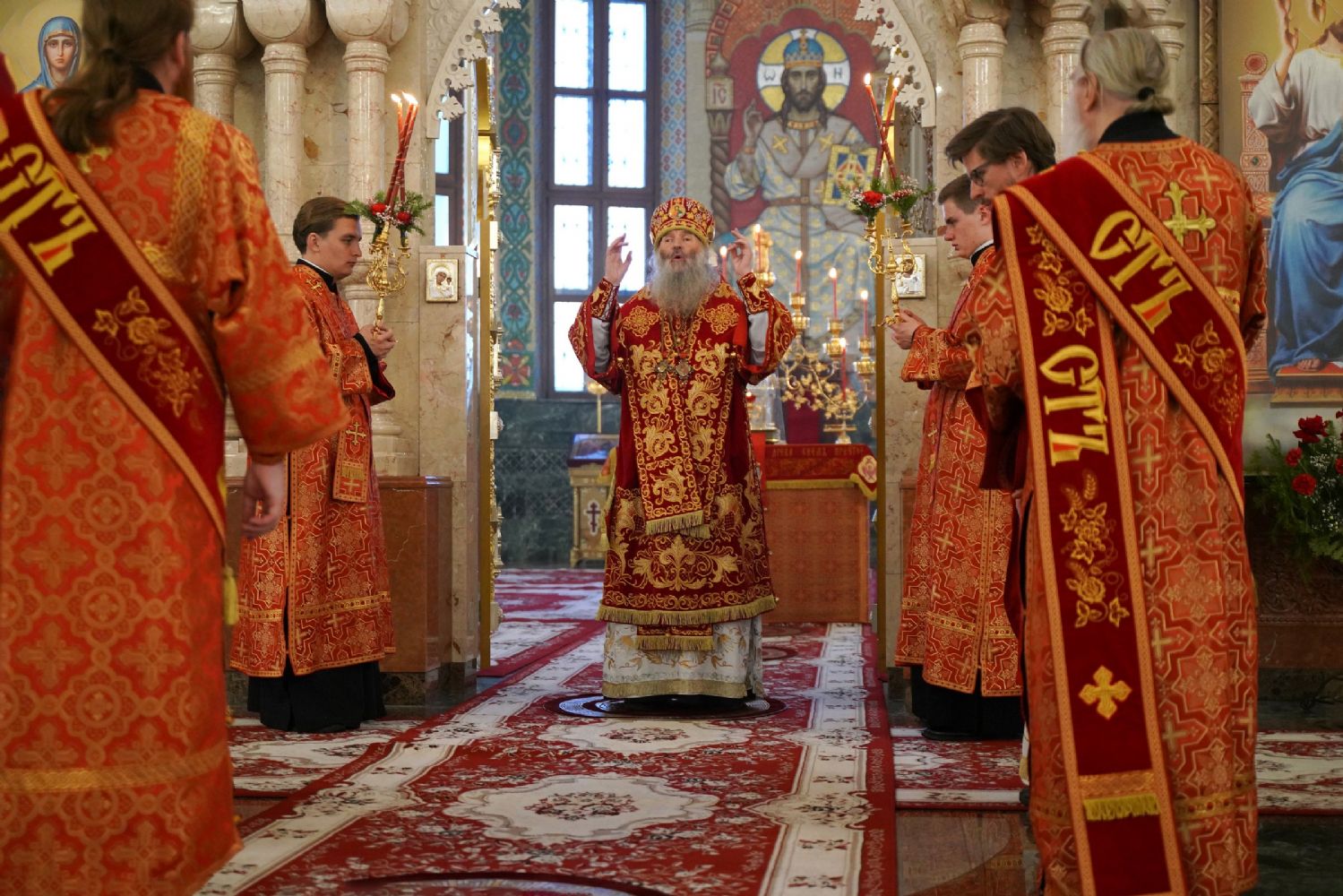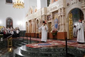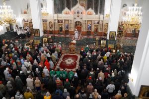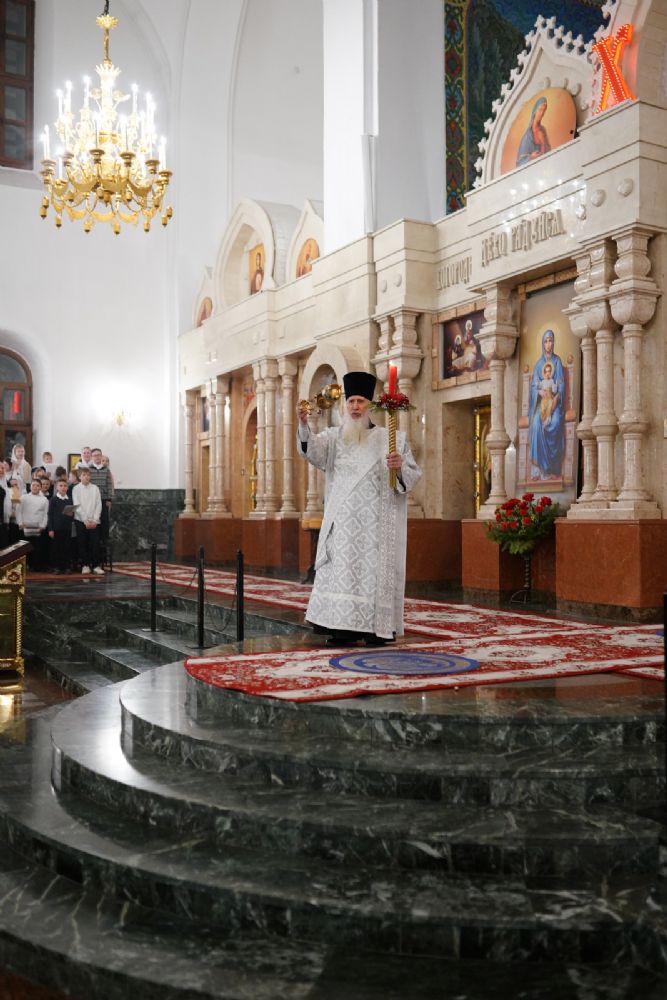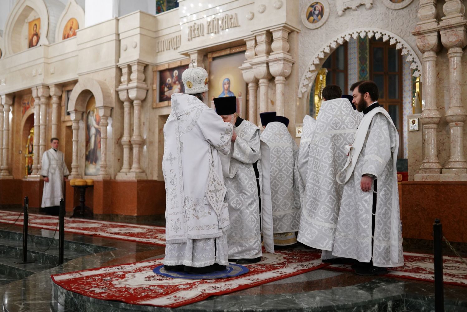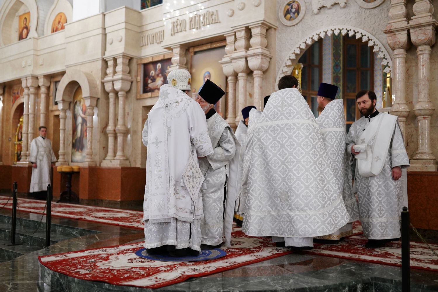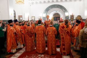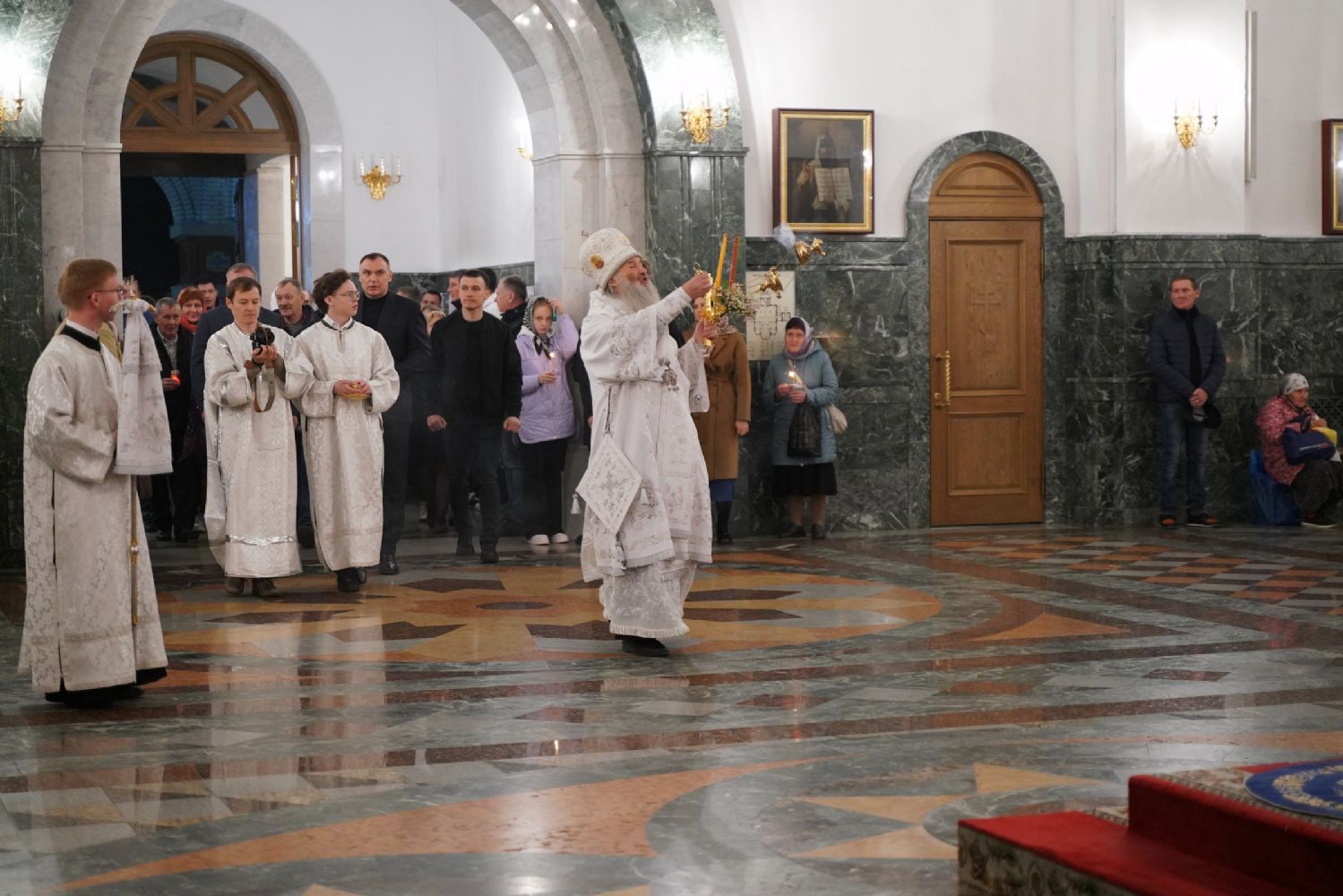 Владыке сослужили ключарь собора протоиерей Сергий Поглазов, клирики собора и протодиакон Михаил Козловский. Богослужебные песнопения исполняли старший и младший составы детско-юношеского хора «Благовест» под управлением регентов Татьяны Черновой и Надежды Поздеевой. Часть песнопений звучала в исполнении хора священно- и церковнослужителей под управлением иерея Евгения Самойлова.