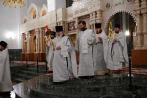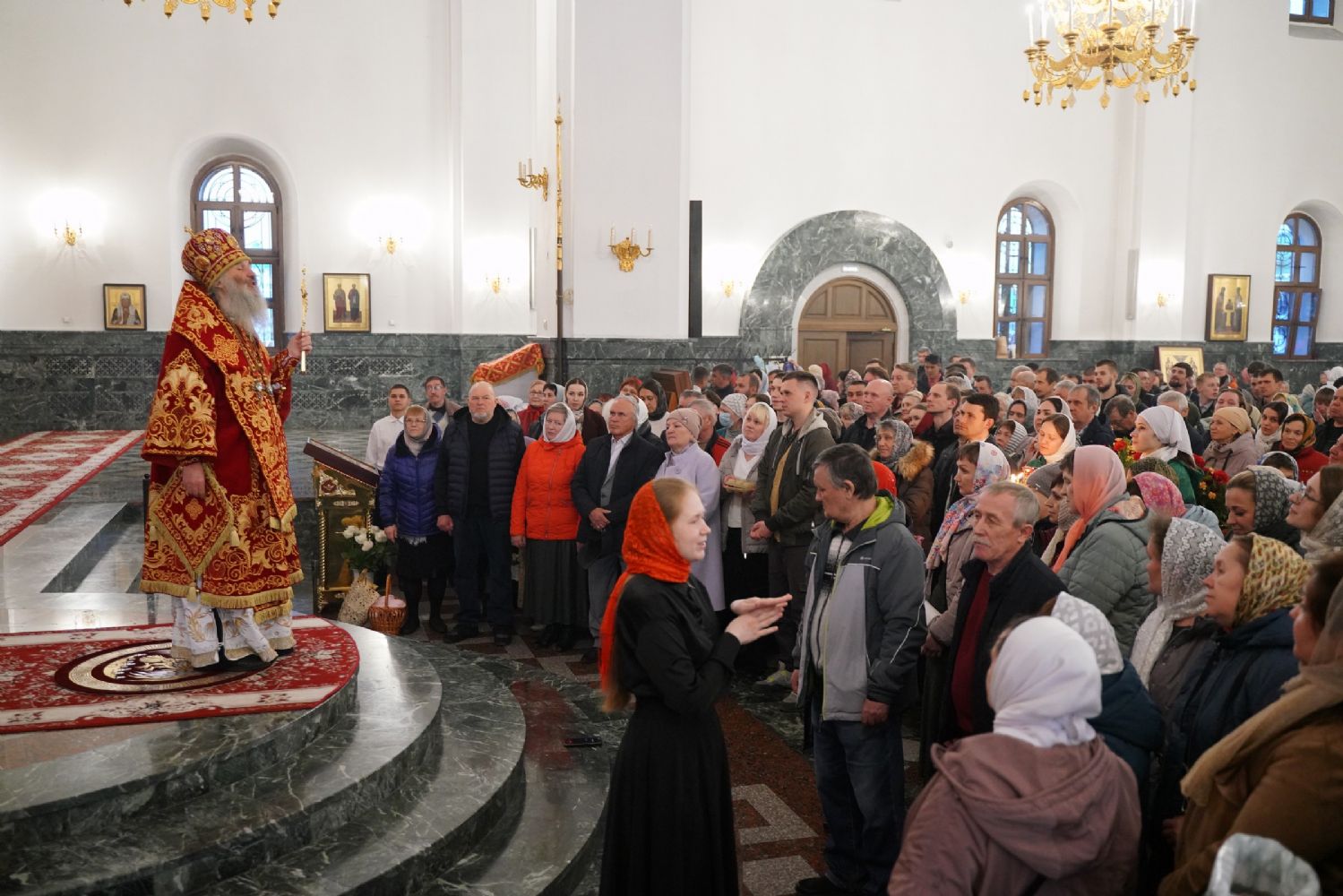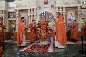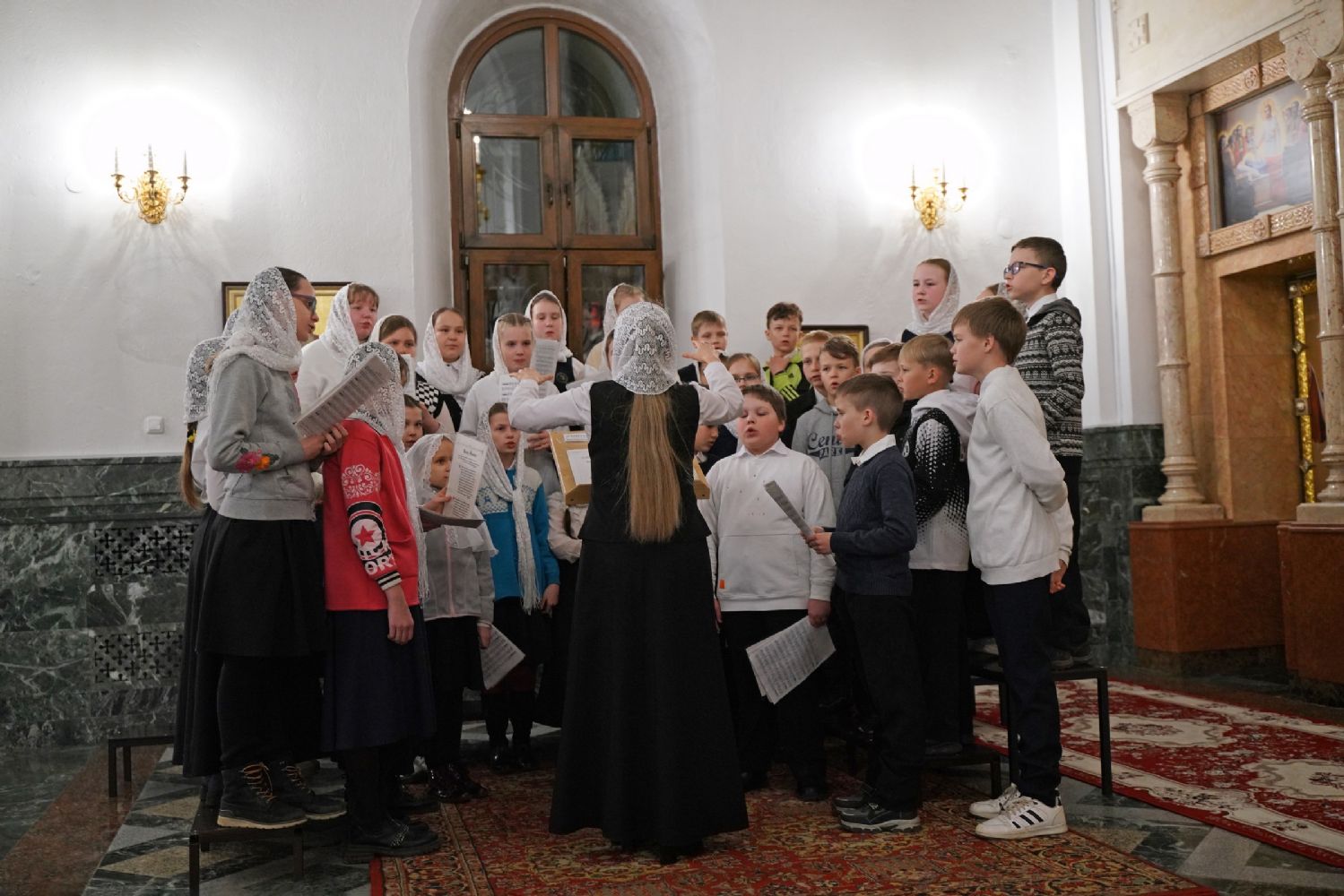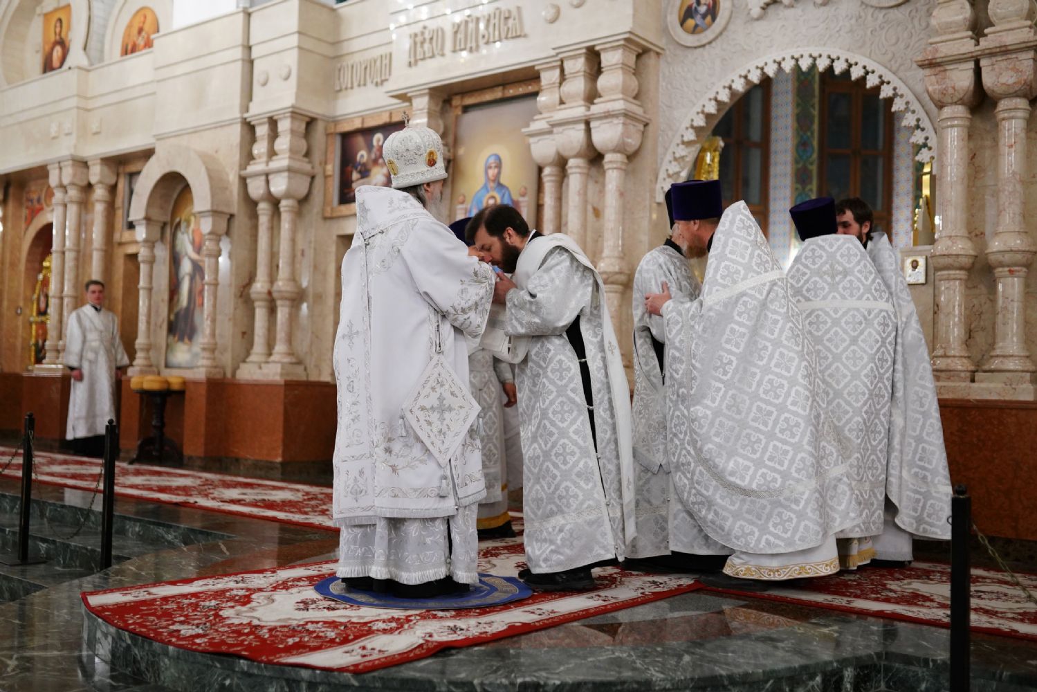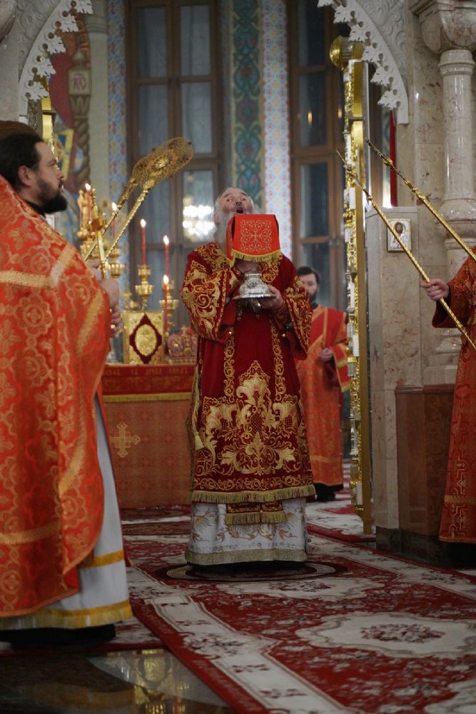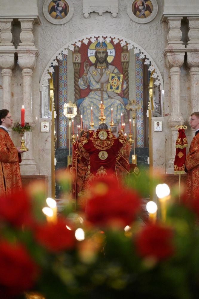 Владыке сослужили ключарь собора протоиерей Сергий Поглазов, клирики собора и протодиакон Михаил Козловский. Богослужебные песнопения исполняли старший и младший составы детско-юношеского хора «Благовест» под управлением регентов Татьяны Черновой и Надежды Поздеевой. Часть песнопений звучала в исполнении хора священно- и церковнослужителей под управлением иерея Евгения Самойлова.
