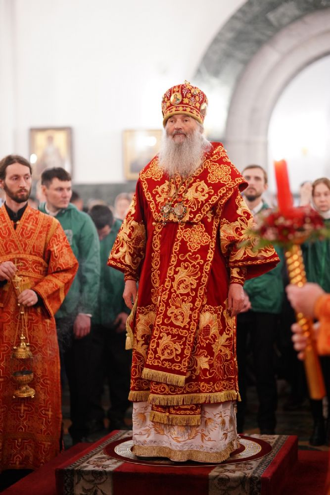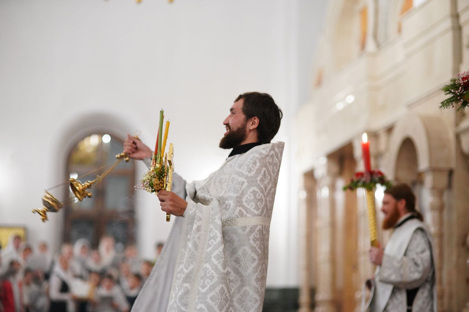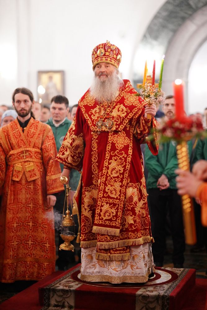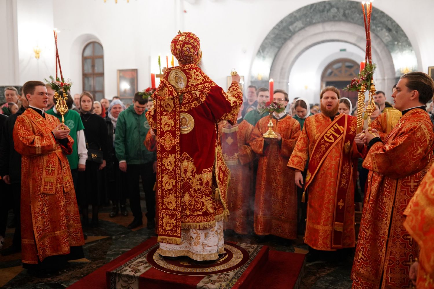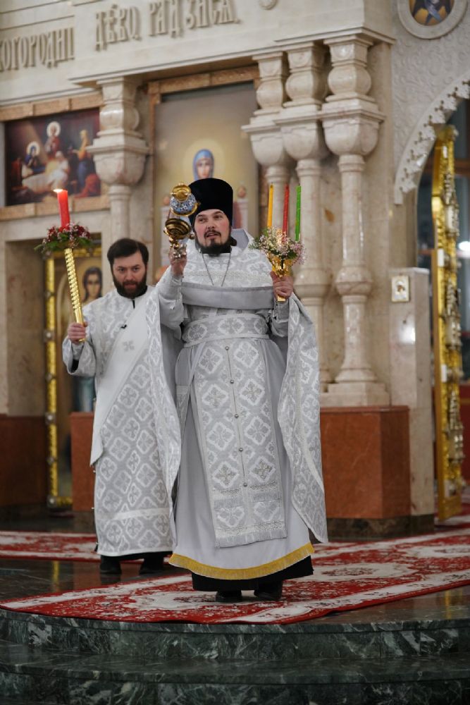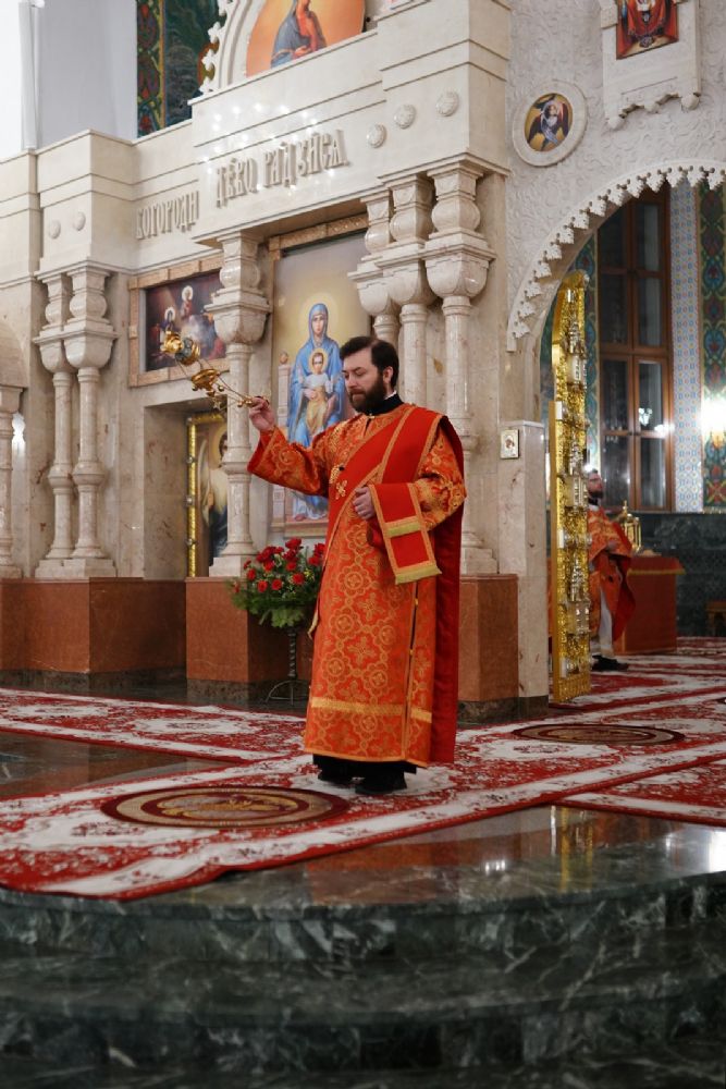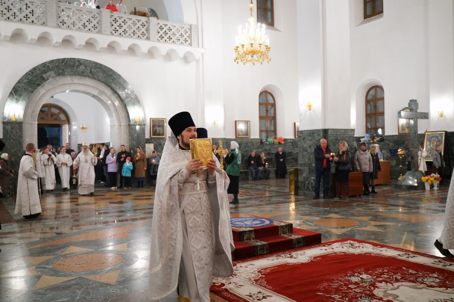 Владыке сослужили ключарь собора протоиерей Сергий Поглазов, клирики собора и протодиакон Михаил Козловский. Богослужебные песнопения исполняли старший и младший составы детско-юношеского хора «Благовест» под управлением регентов Татьяны Черновой и Надежды Поздеевой. Часть песнопений звучала в исполнении хора священно- и церковнослужителей под управлением иерея Евгения Самойлова.