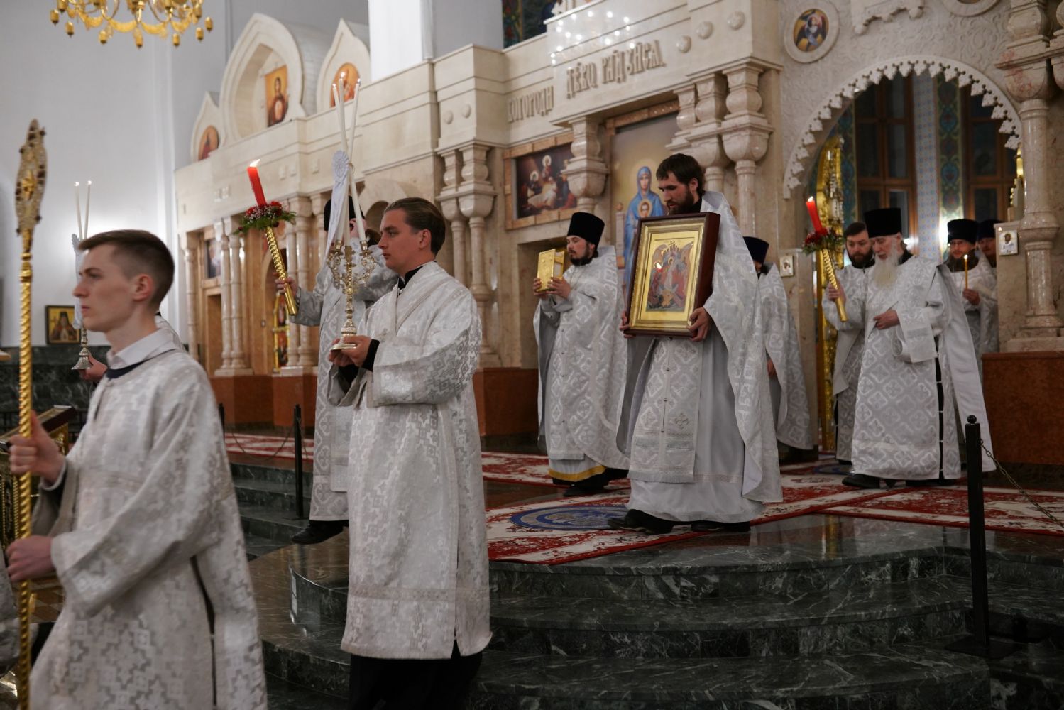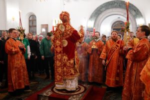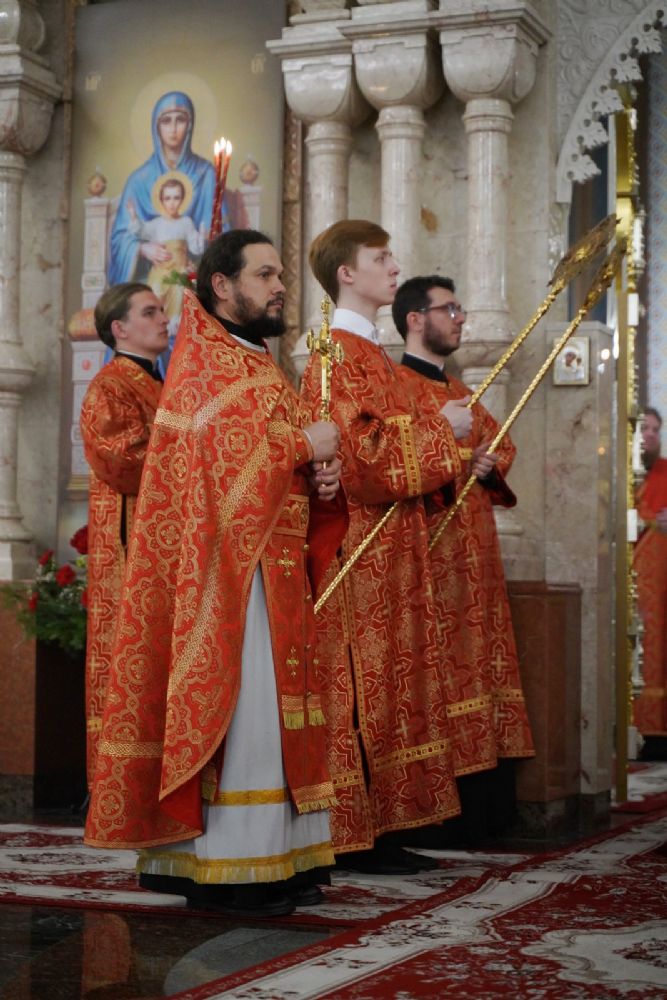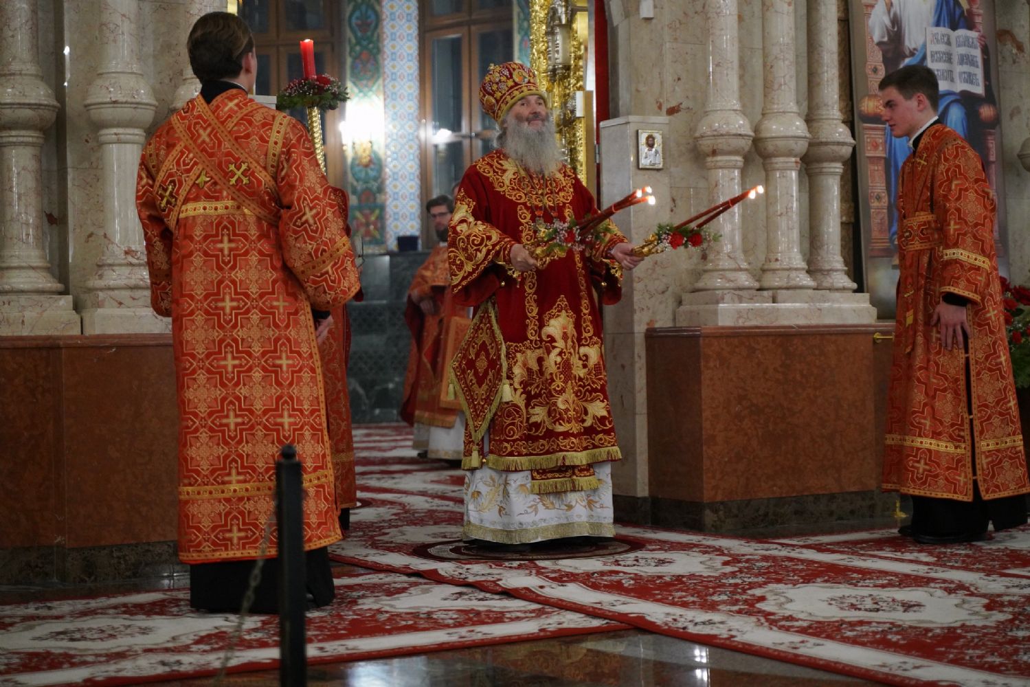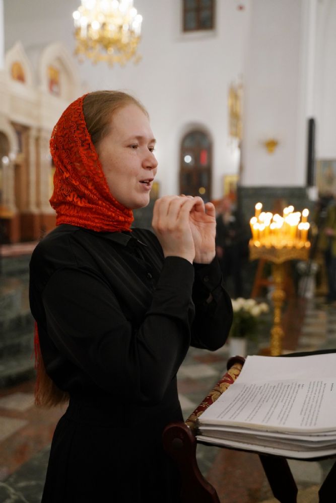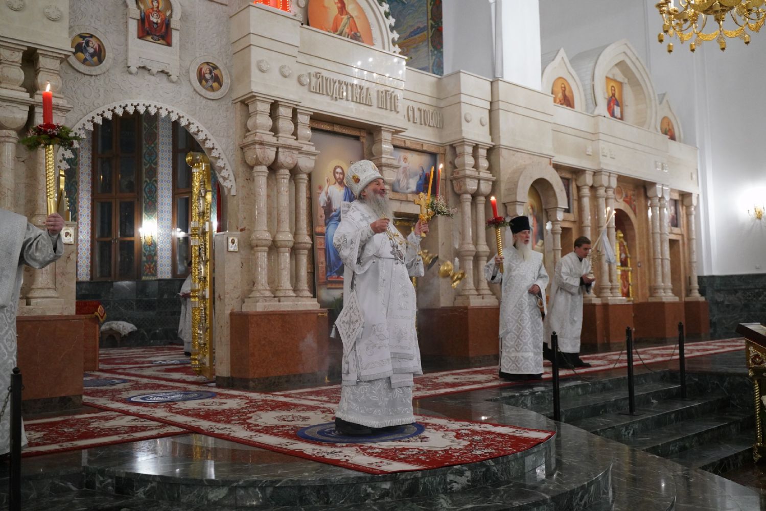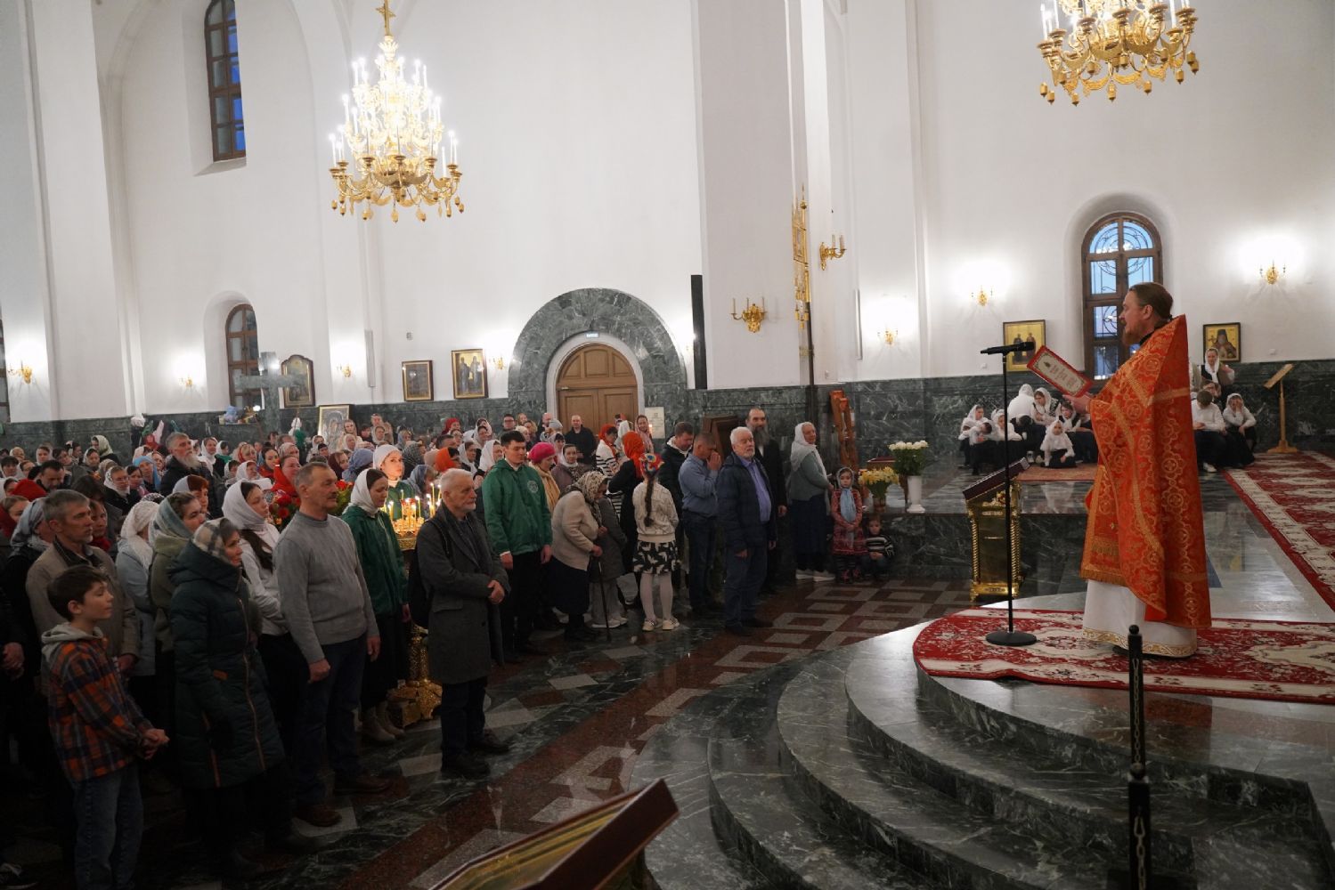 Владыке сослужили ключарь собора протоиерей Сергий Поглазов, клирики собора и протодиакон Михаил Козловский. Богослужебные песнопения исполняли старший и младший составы детско-юношеского хора «Благовест» под управлением регентов Татьяны Черновой и Надежды Поздеевой. Часть песнопений звучала в исполнении хора священно- и церковнослужителей под управлением иерея Евгения Самойлова.