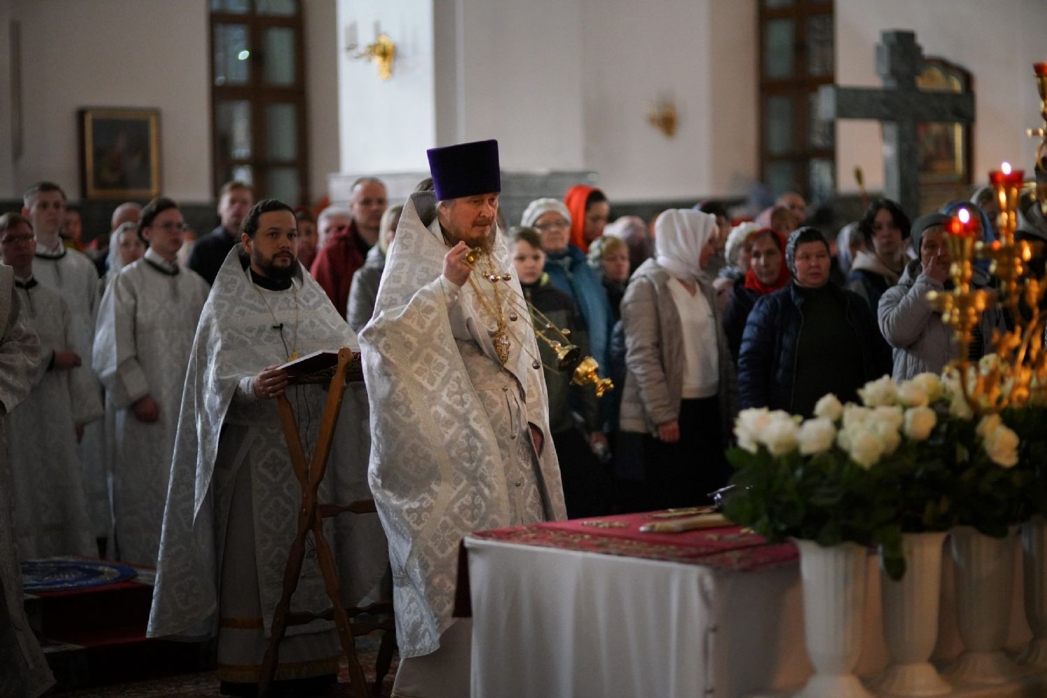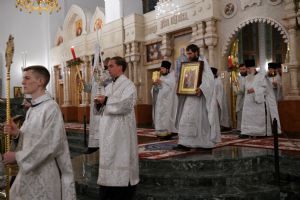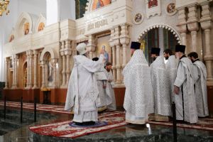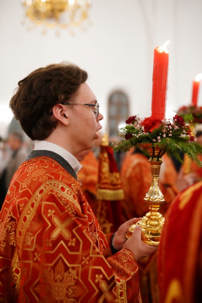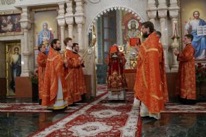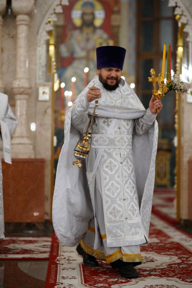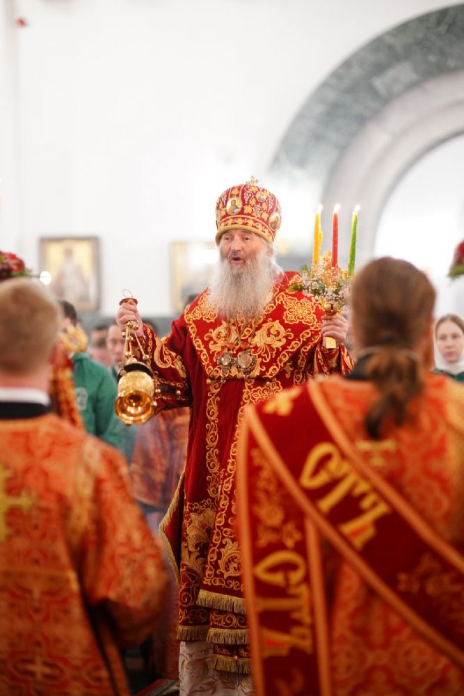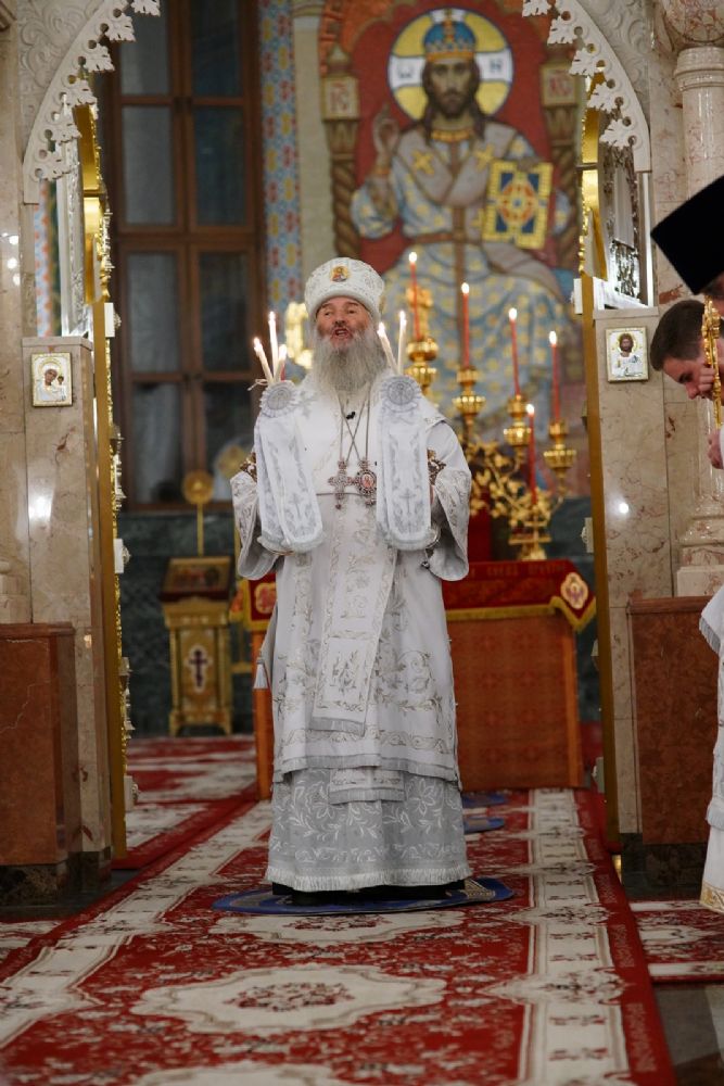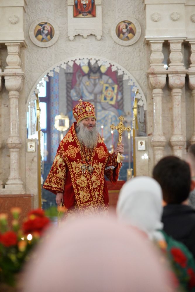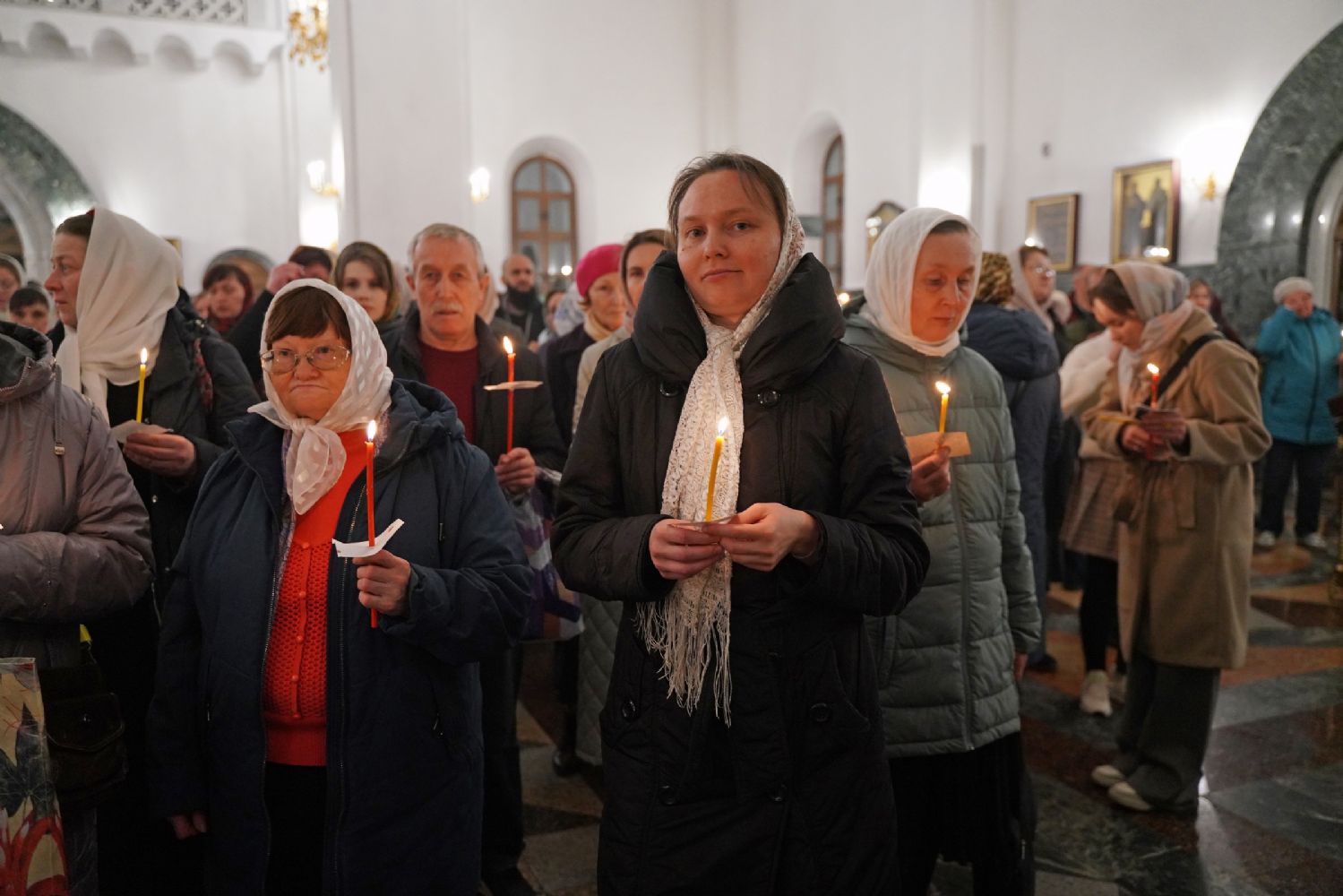 Владыке сослужили ключарь собора протоиерей Сергий Поглазов, клирики собора и протодиакон Михаил Козловский. Богослужебные песнопения исполняли старший и младший составы детско-юношеского хора «Благовест» под управлением регентов Татьяны Черновой и Надежды Поздеевой. Часть песнопений звучала в исполнении хора священно- и церковнослужителей под управлением иерея Евгения Самойлова.