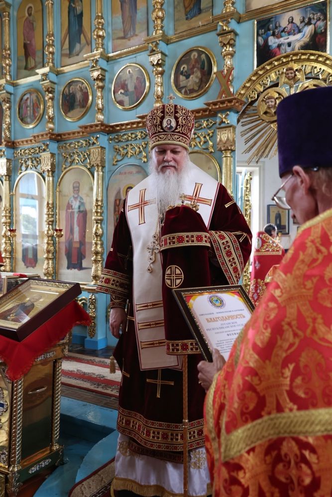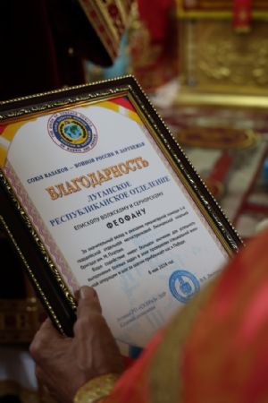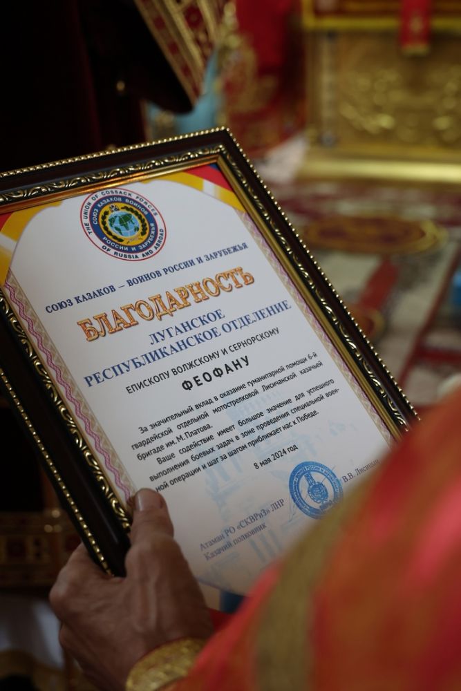Отец Евгений Усков передал владыке Феофану благодарность от Луганского республиканского отделения Союза казаков – воинов России и Зарубежья за значительный вклад в оказание гуманитарной помощи для успешного выполнения боевых задач в зоне проведения СВО.