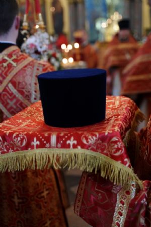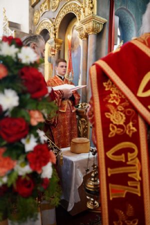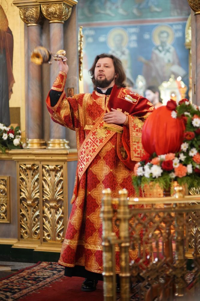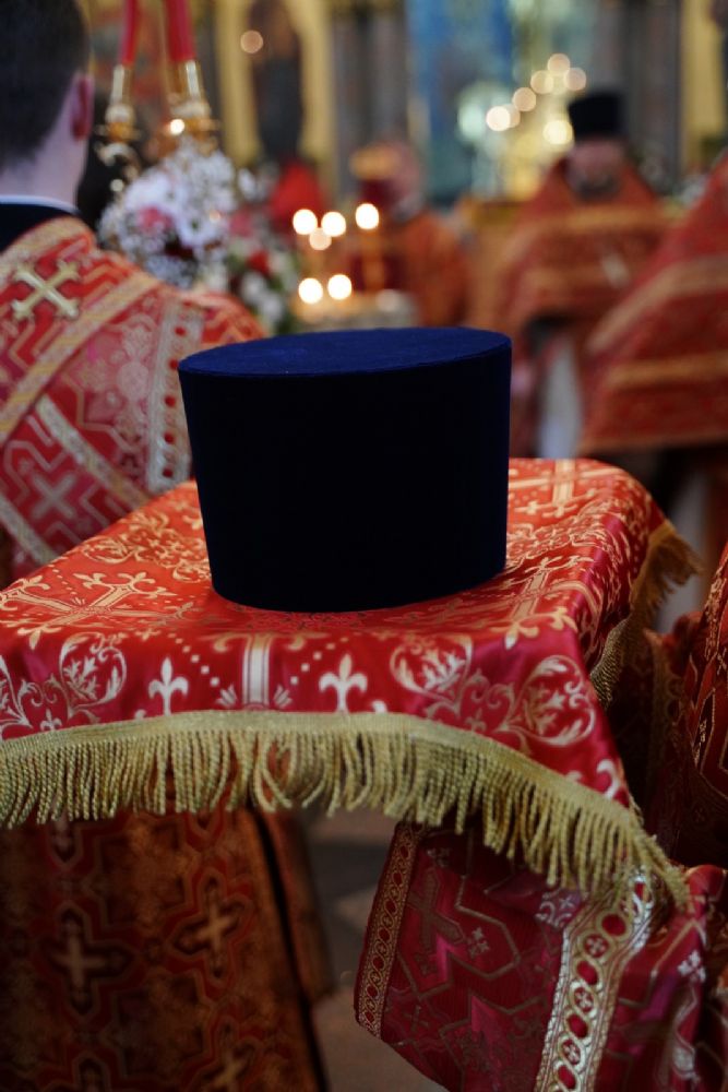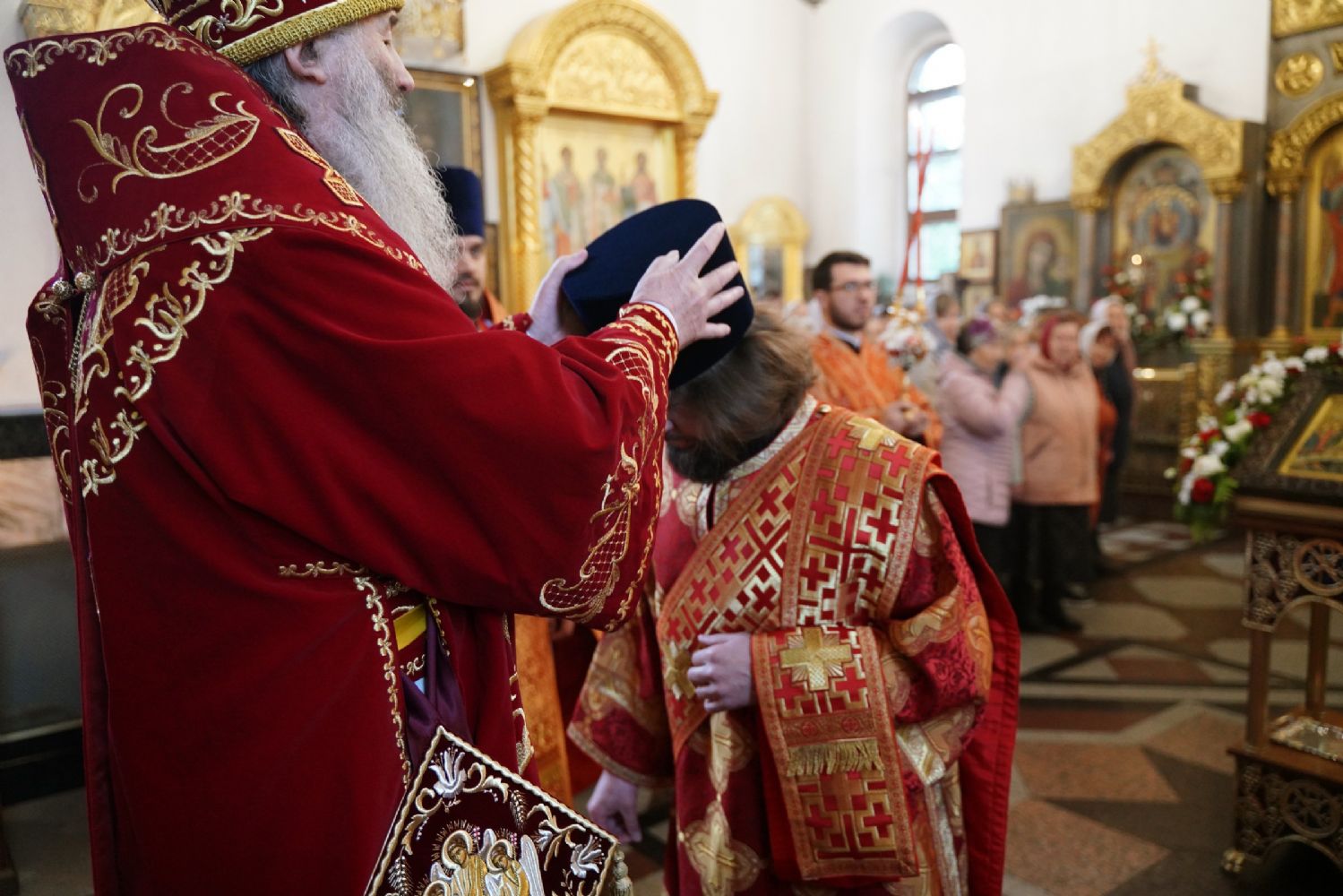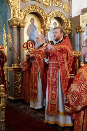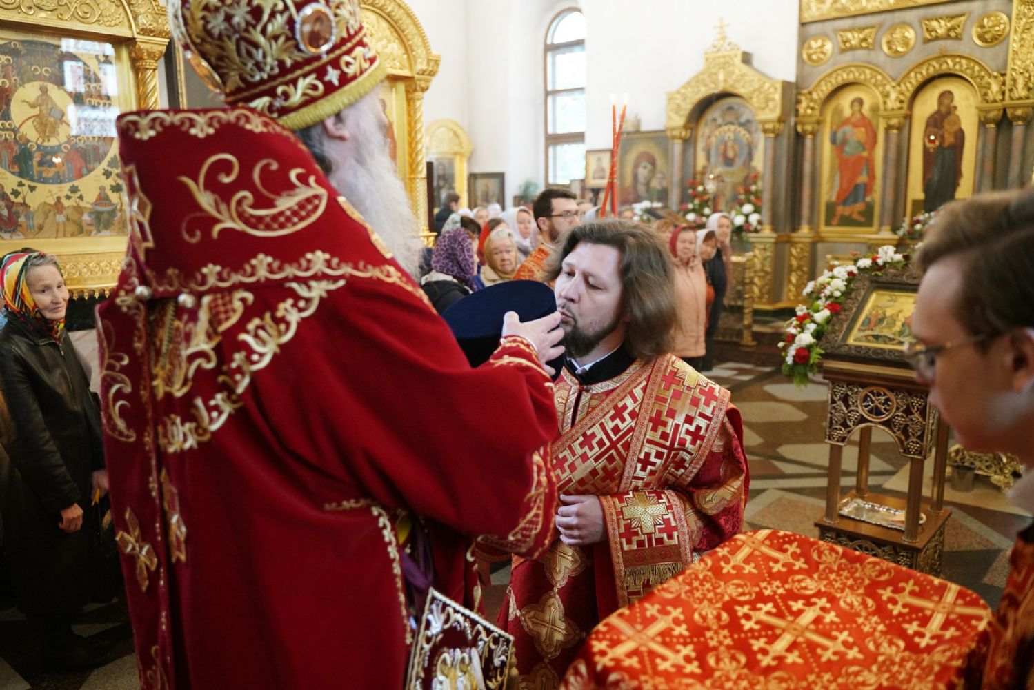 На входе с Евангелием митрополит Иоанн вручил богослужебно-иерархическую награду диакону Александру Мельникову – указом Святейшего Патриарха Кирилла он удостоен права ношения камилавки.