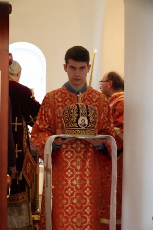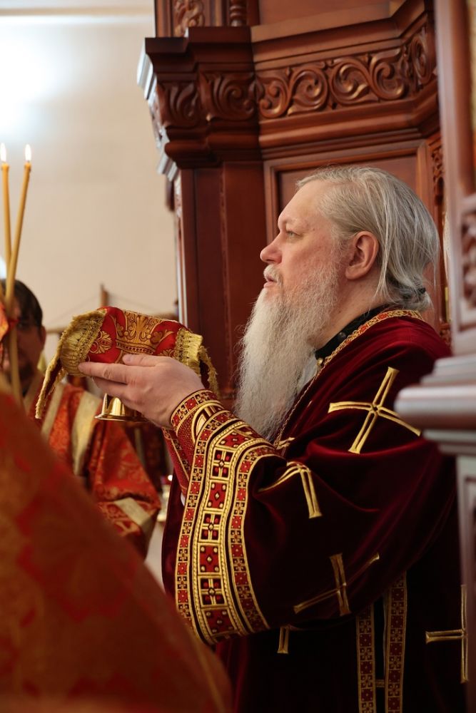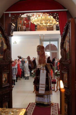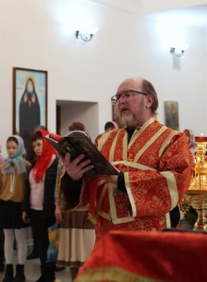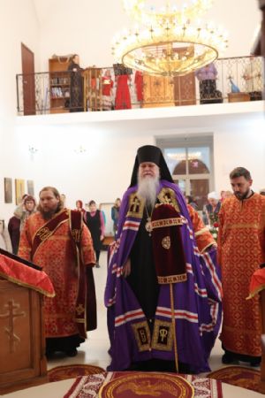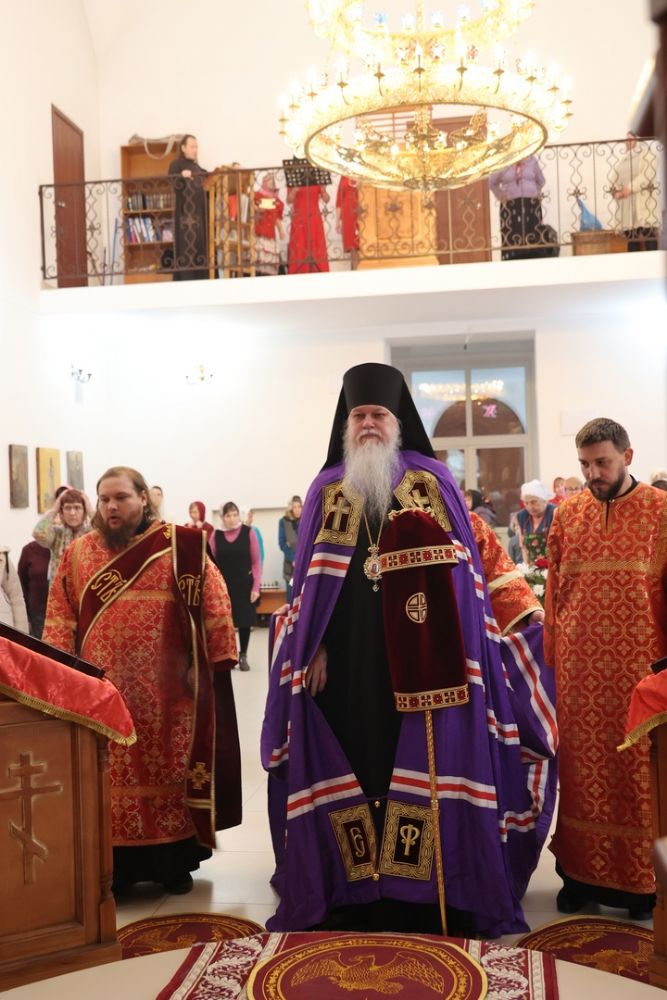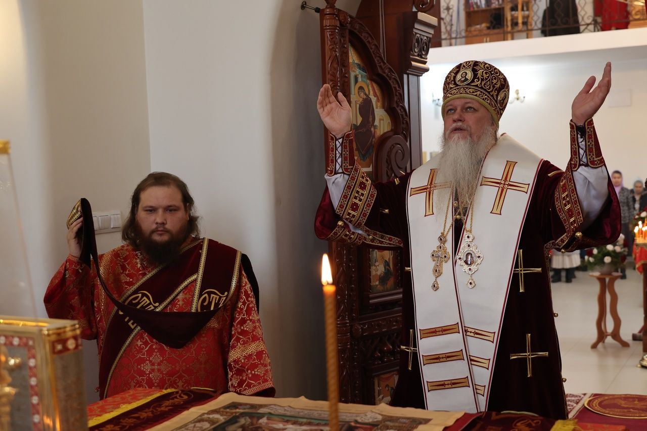 Его Преосвященству сослужили клирик храма иерей Андрей Легостаев и клирик Никольского кафедрального собора диакон Иоанн Захаров. Песнопения исполнял хор храма под руководством Марии Захаровой.