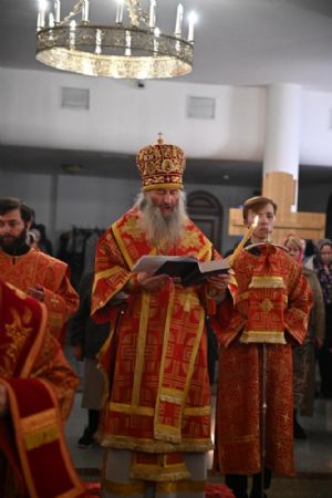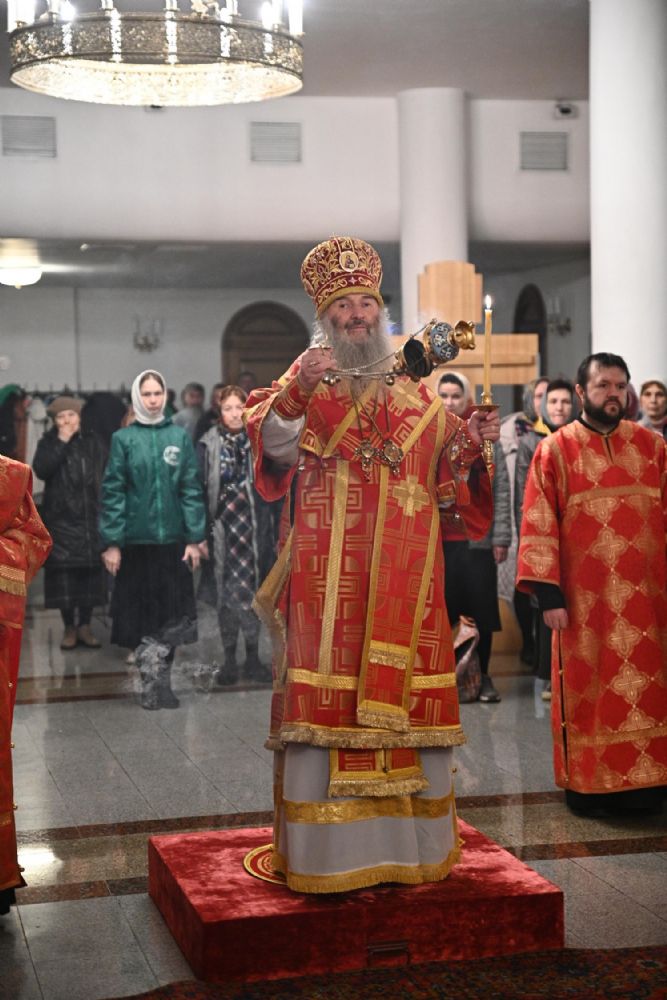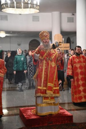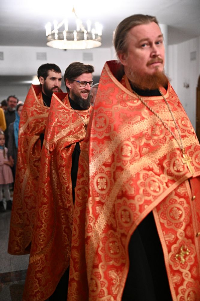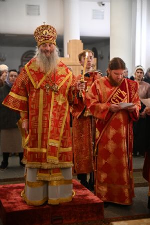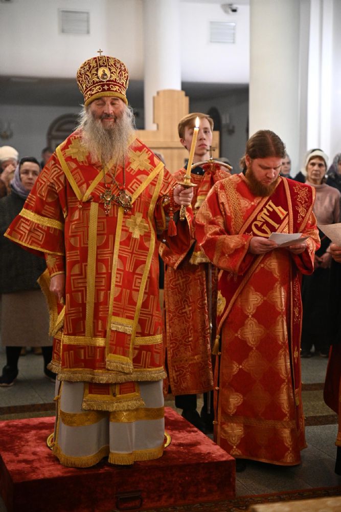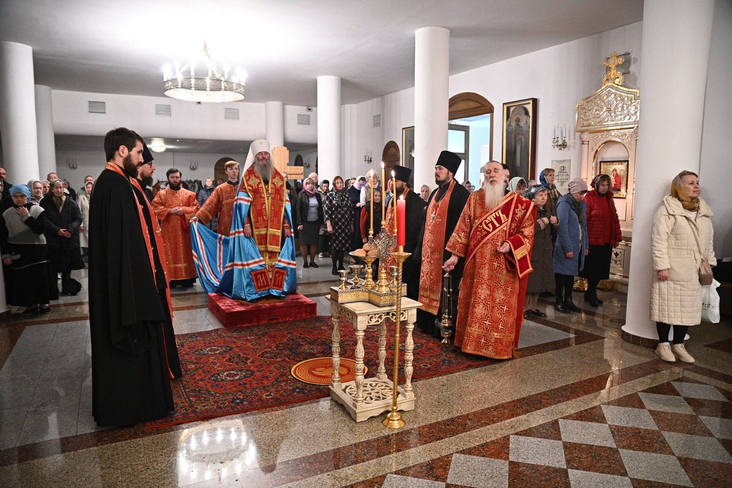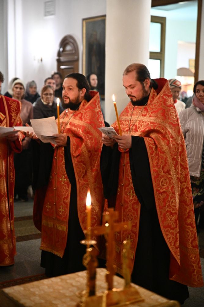 Его Высокопреосвященству сослужили ключарь собора протоиерей Сергий Поглазов, клирики собора иереи Никифор Захаров, Евгений Самойлов, Александр Староверов и Иоанн Милютин, диаконы Андрей Дружинин и Артемий Бобоч, а также протодиакон Михаил Козловский. Песнопения исполнял малый состав хора «Благовест» под управлением Татьяны Черновой.