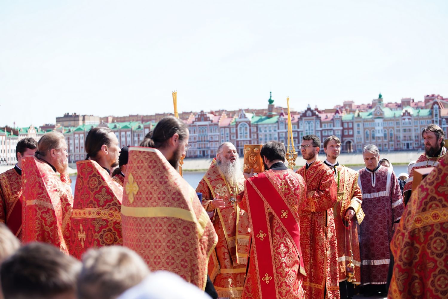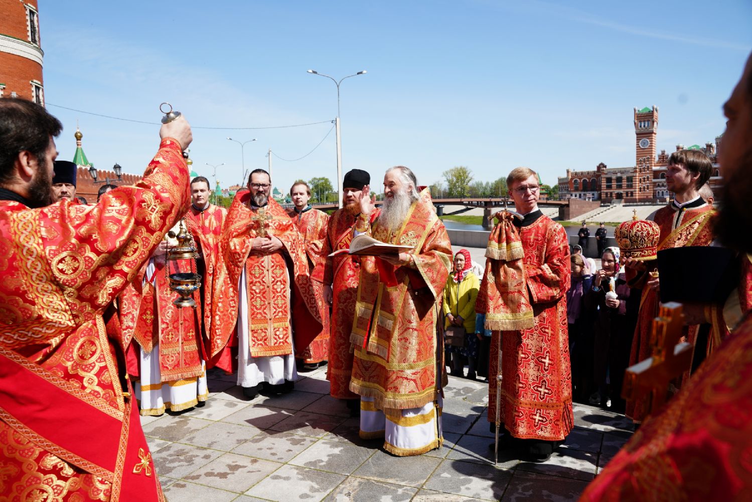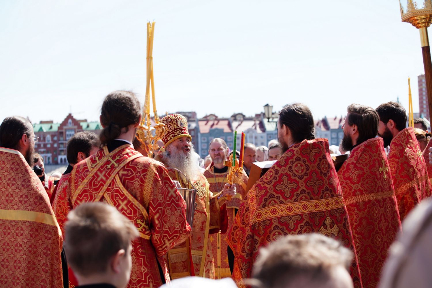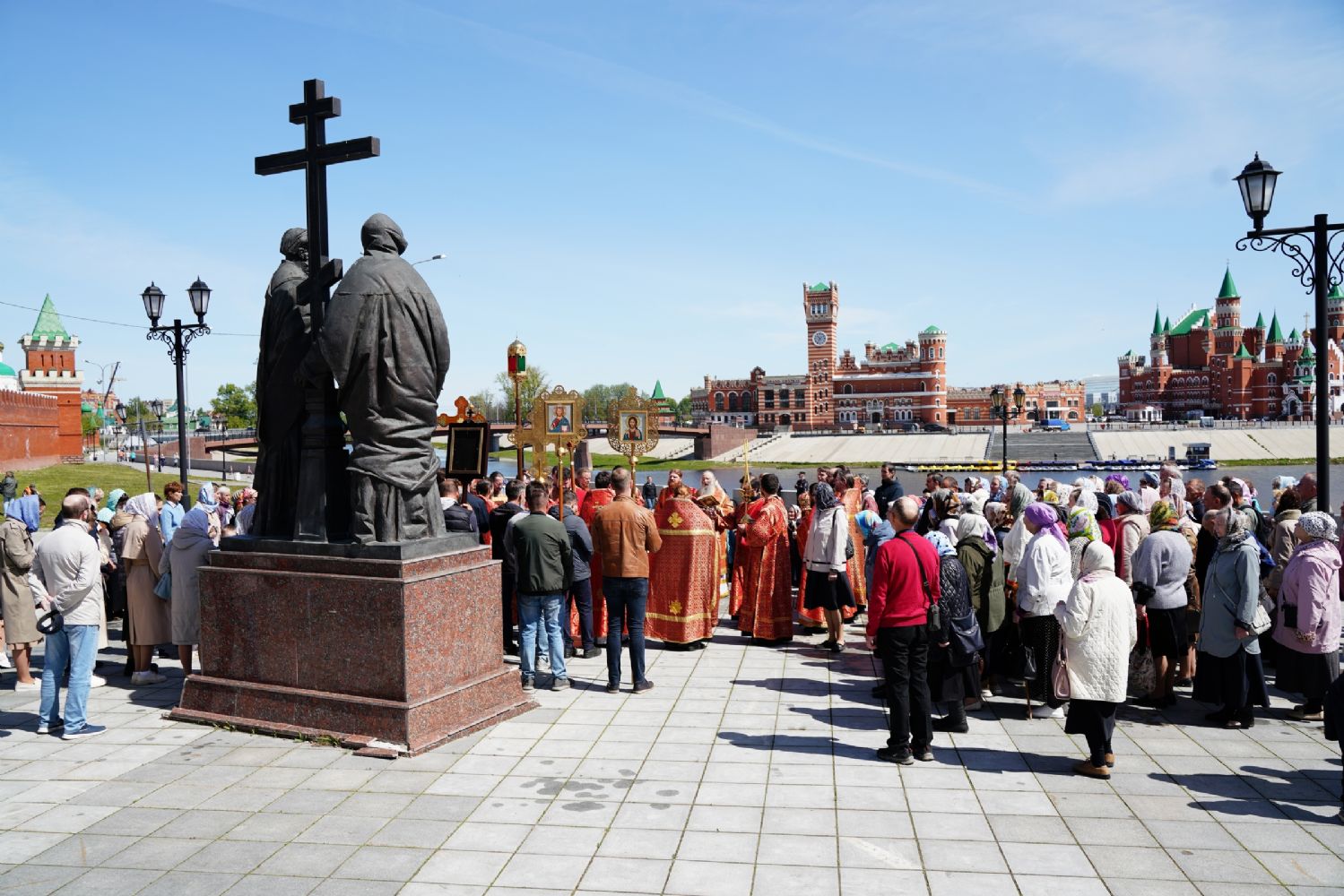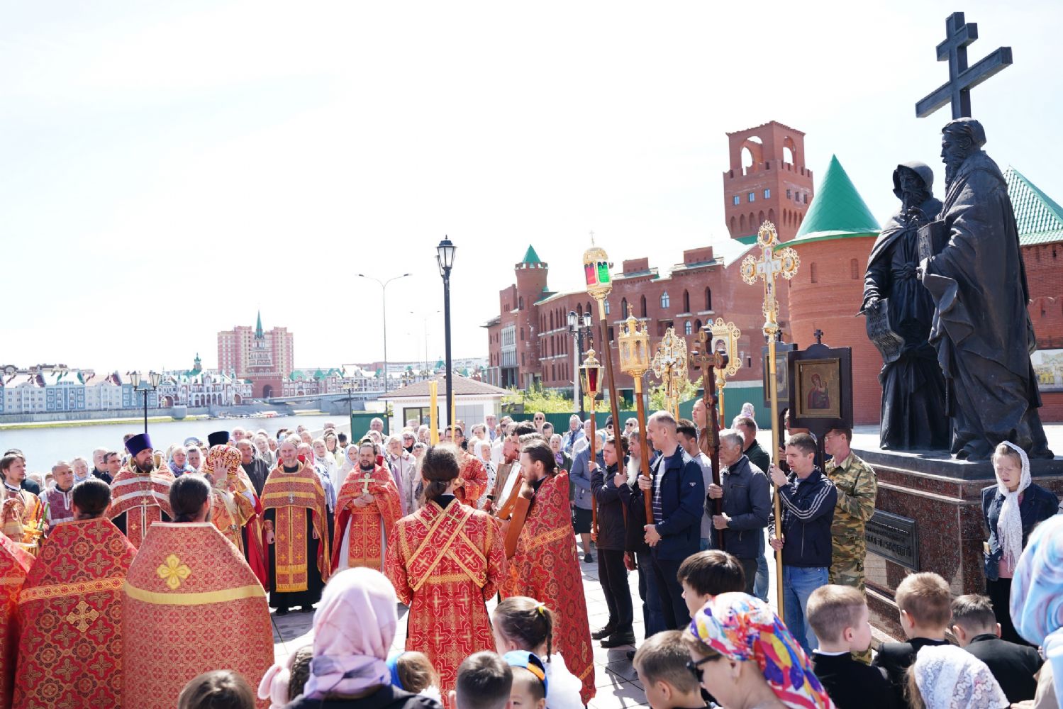 После Божественной литургии священство и прихожане из трех городских храмов – Благовещенского кафедрального собора, Вознесенского собора и Воскресенского собора – с иконами и хоругвями направились по набережной Кокшаги к памятнику святым Кириллу и Мефодию около Музея истории Православия. Крестный ход из Благовещенского собора возглавил митрополит Йошкар-Олинский и Марийский Иоанн.