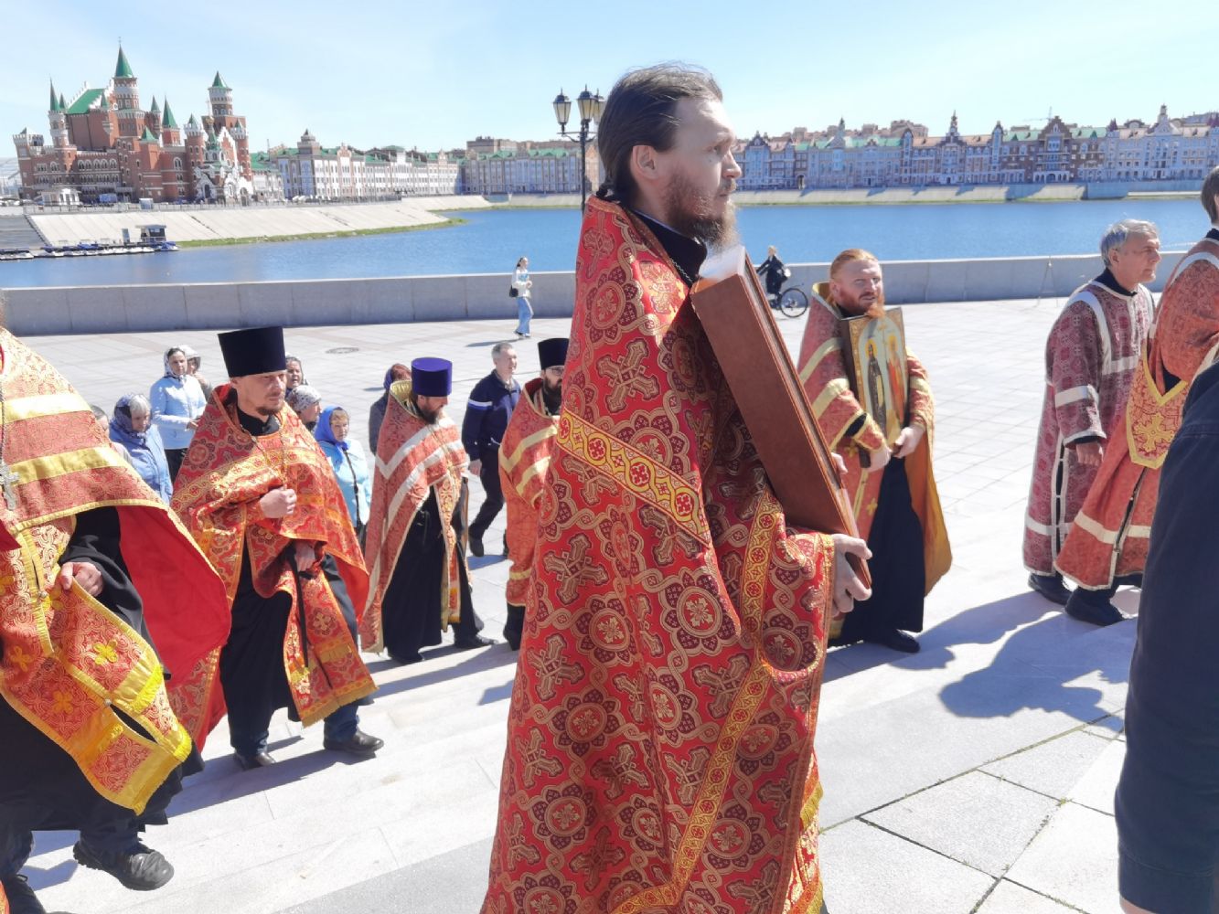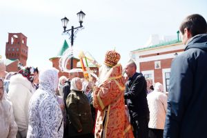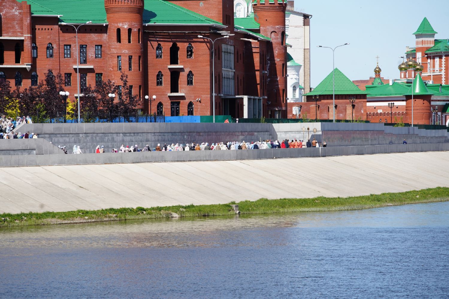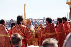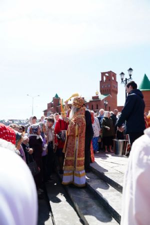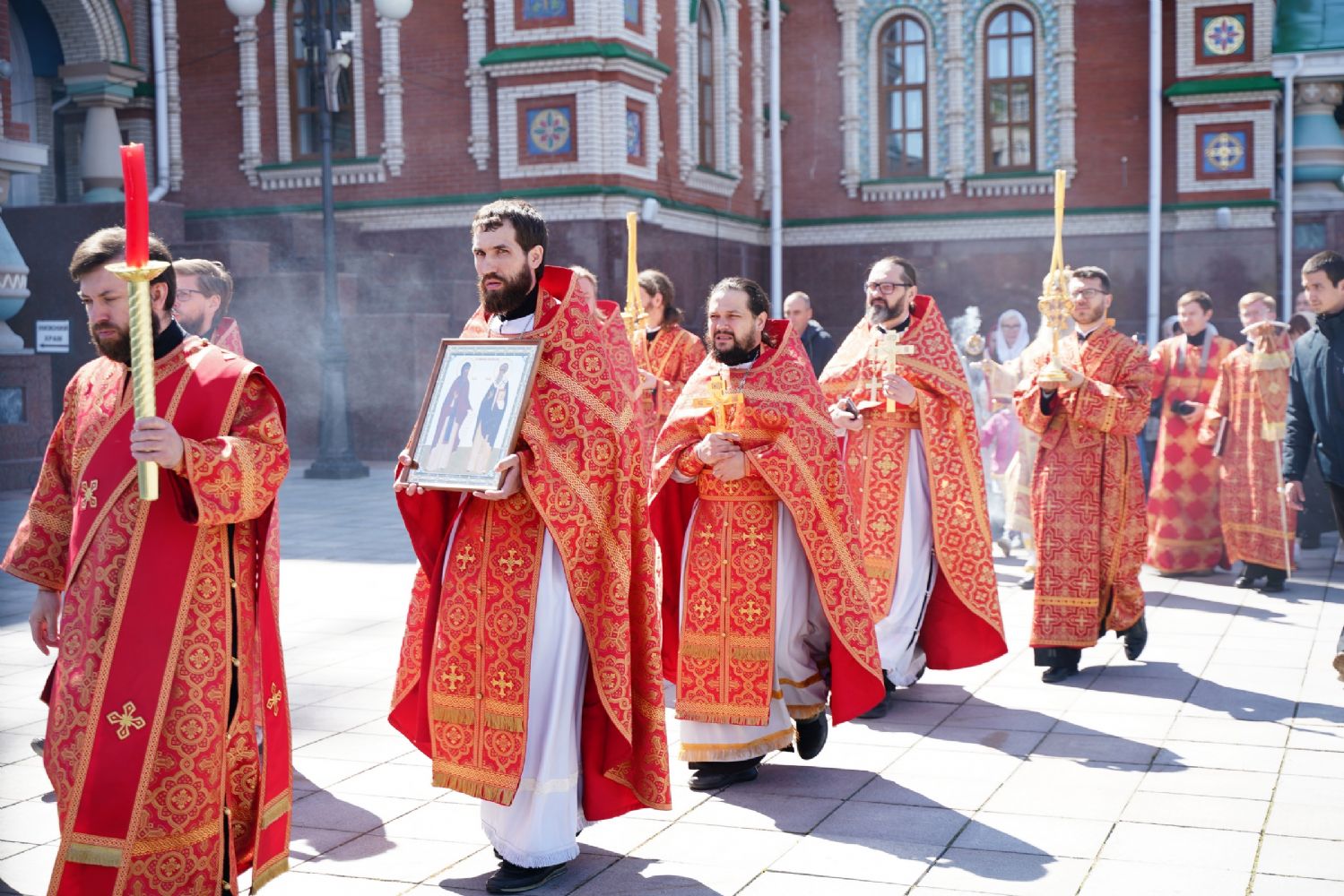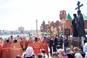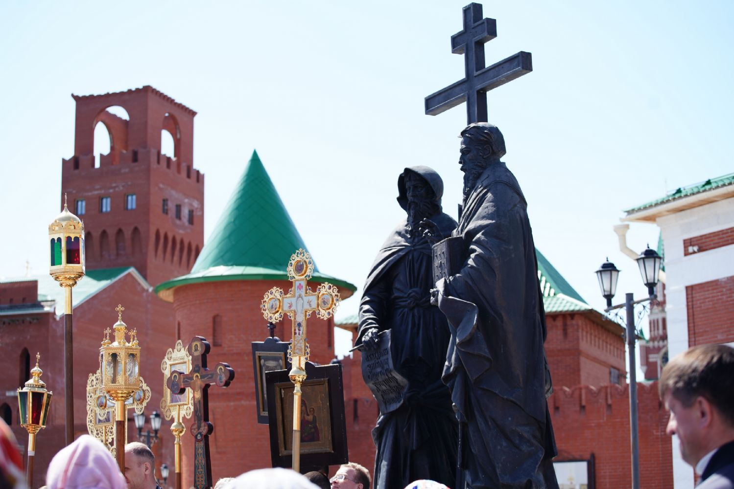 После Божественной литургии священство и прихожане из трех городских храмов – Благовещенского кафедрального собора, Вознесенского собора и Воскресенского собора – с иконами и хоругвями направились по набережной Кокшаги к памятнику святым Кириллу и Мефодию около Музея истории Православия. Крестный ход из Благовещенского собора возглавил митрополит Йошкар-Олинский и Марийский Иоанн.