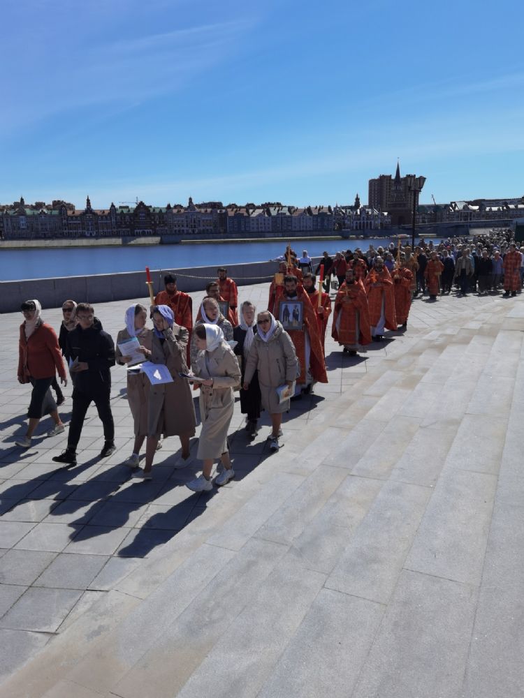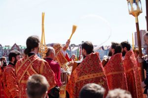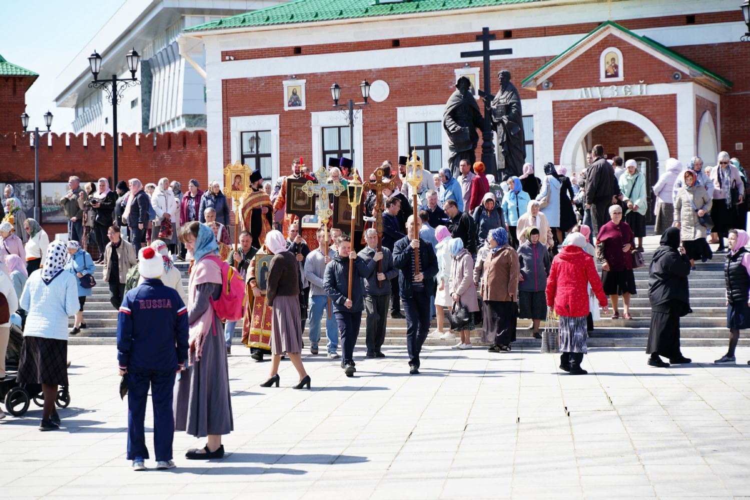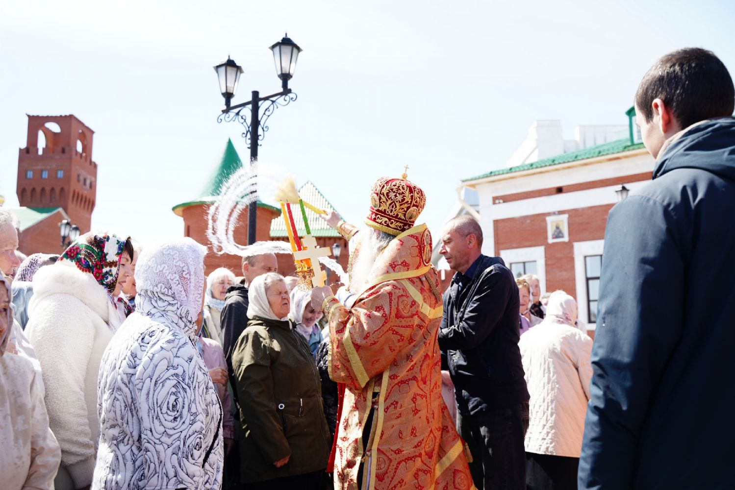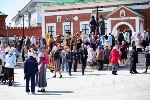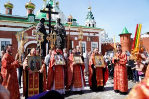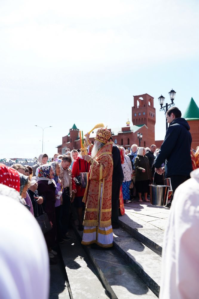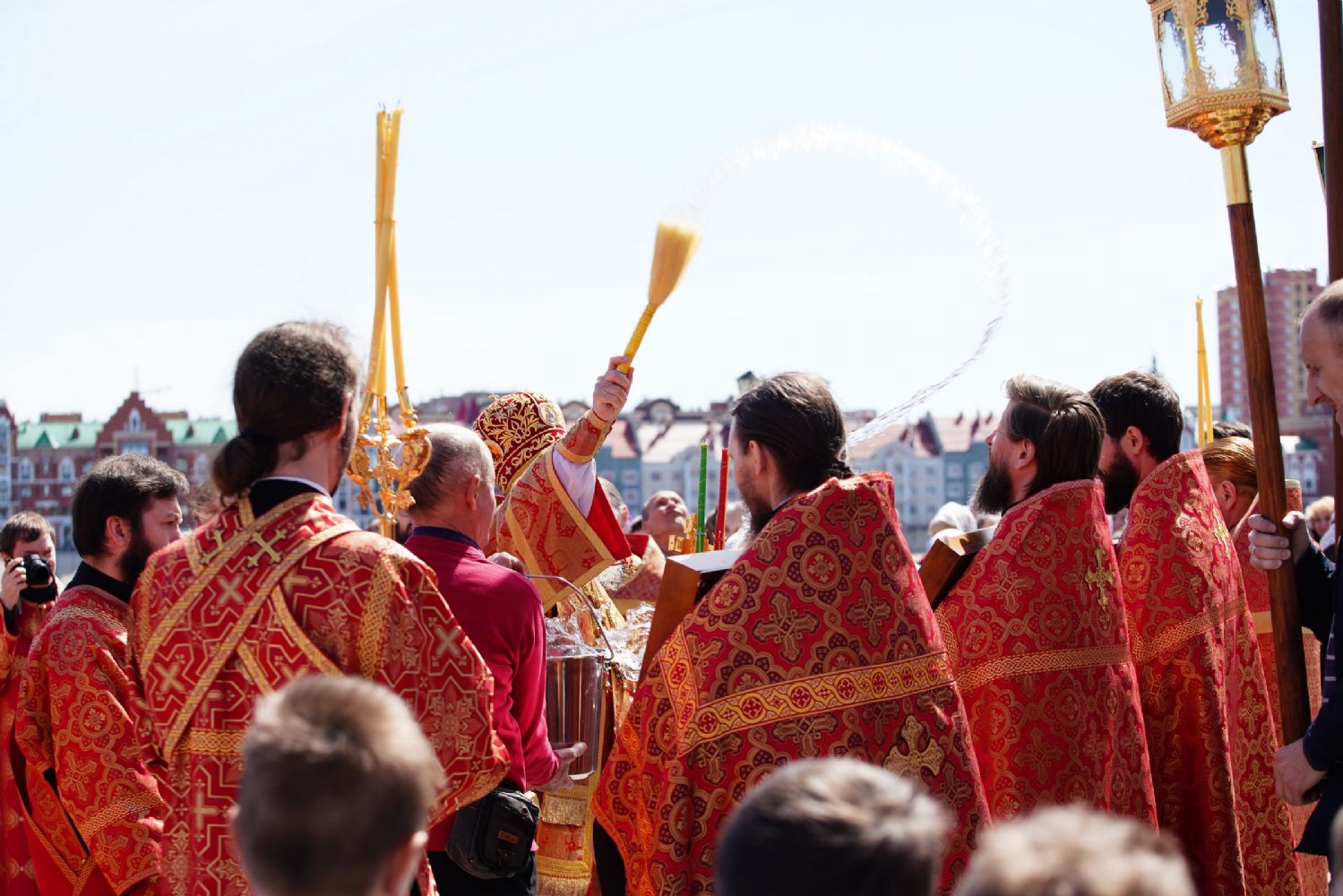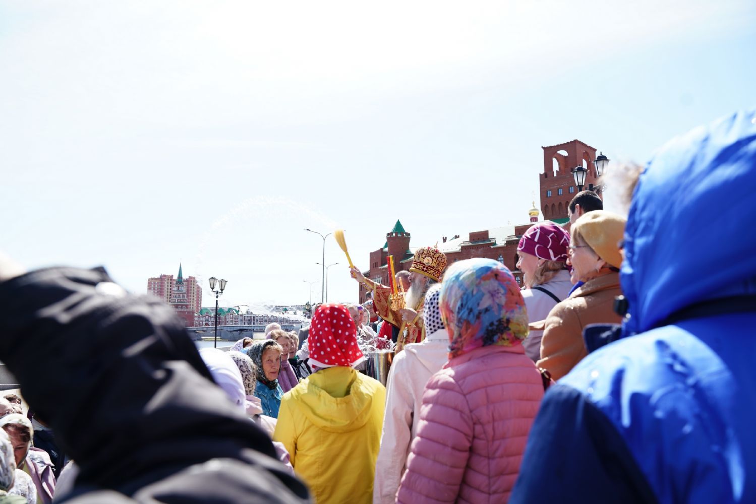 После Божественной литургии священство и прихожане из трех городских храмов – Благовещенского кафедрального собора, Вознесенского собора и Воскресенского собора – с иконами и хоругвями направились по набережной Кокшаги к памятнику святым Кириллу и Мефодию около Музея истории Православия. Крестный ход из Благовещенского собора возглавил митрополит Йошкар-Олинский и Марийский Иоанн.