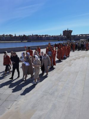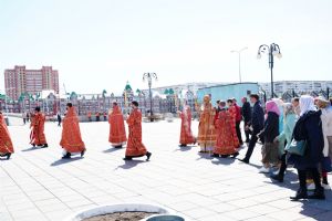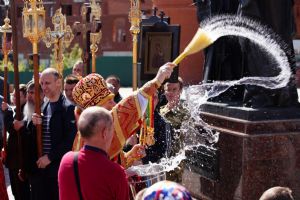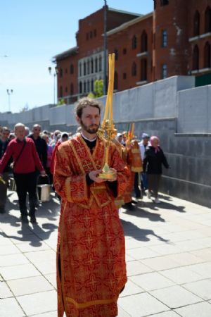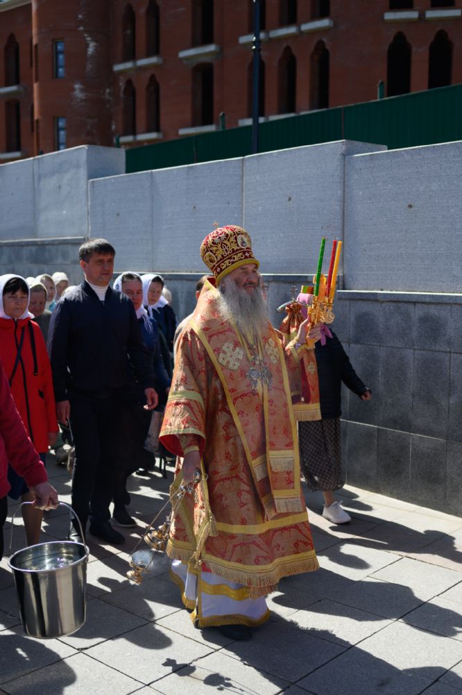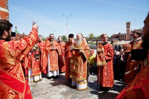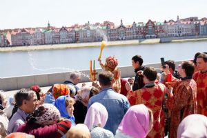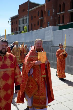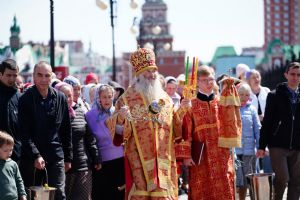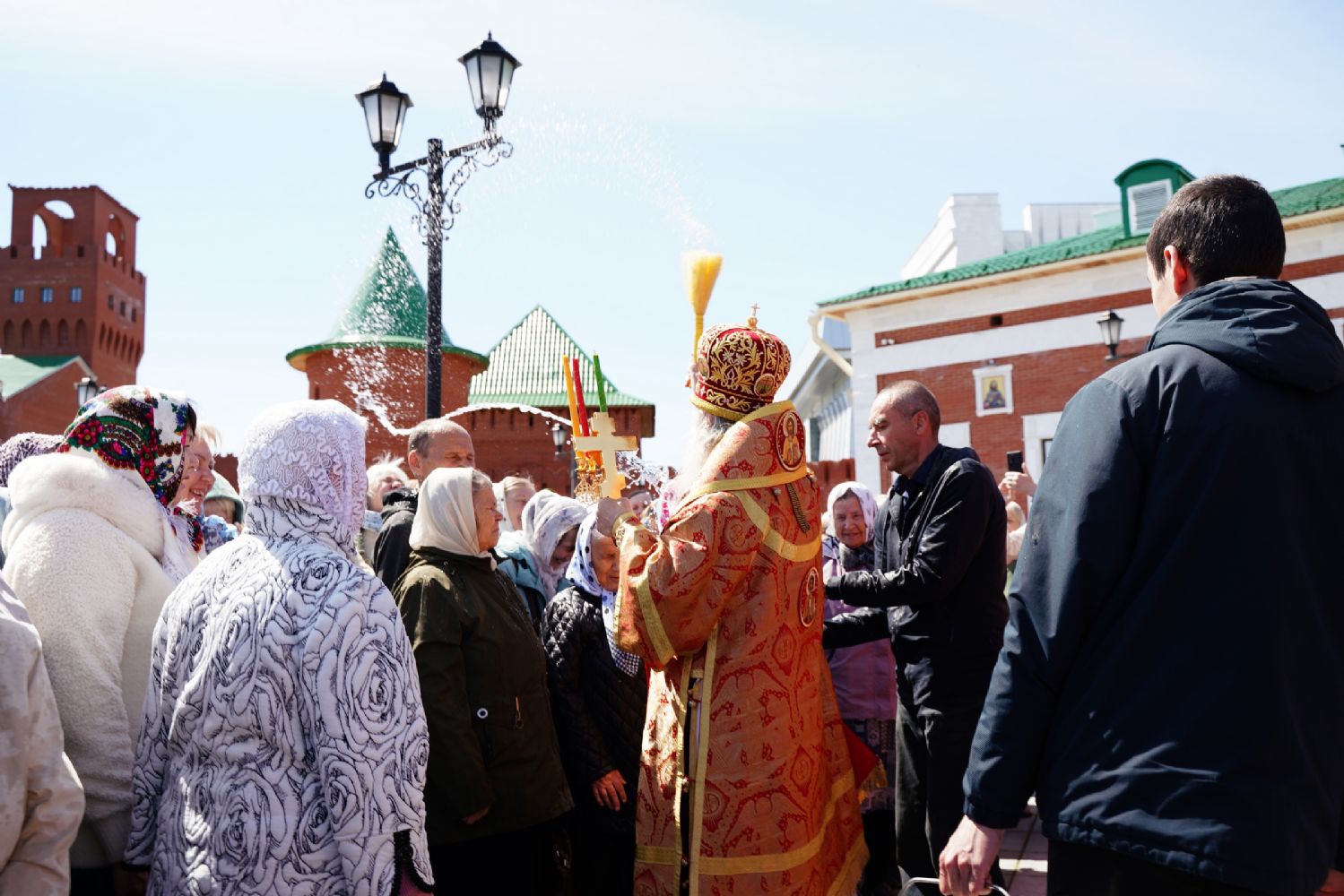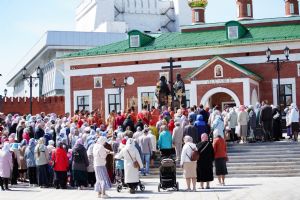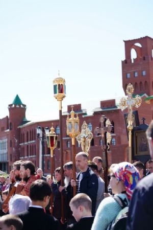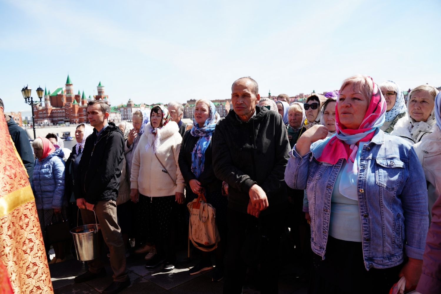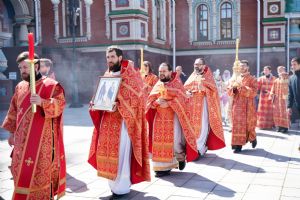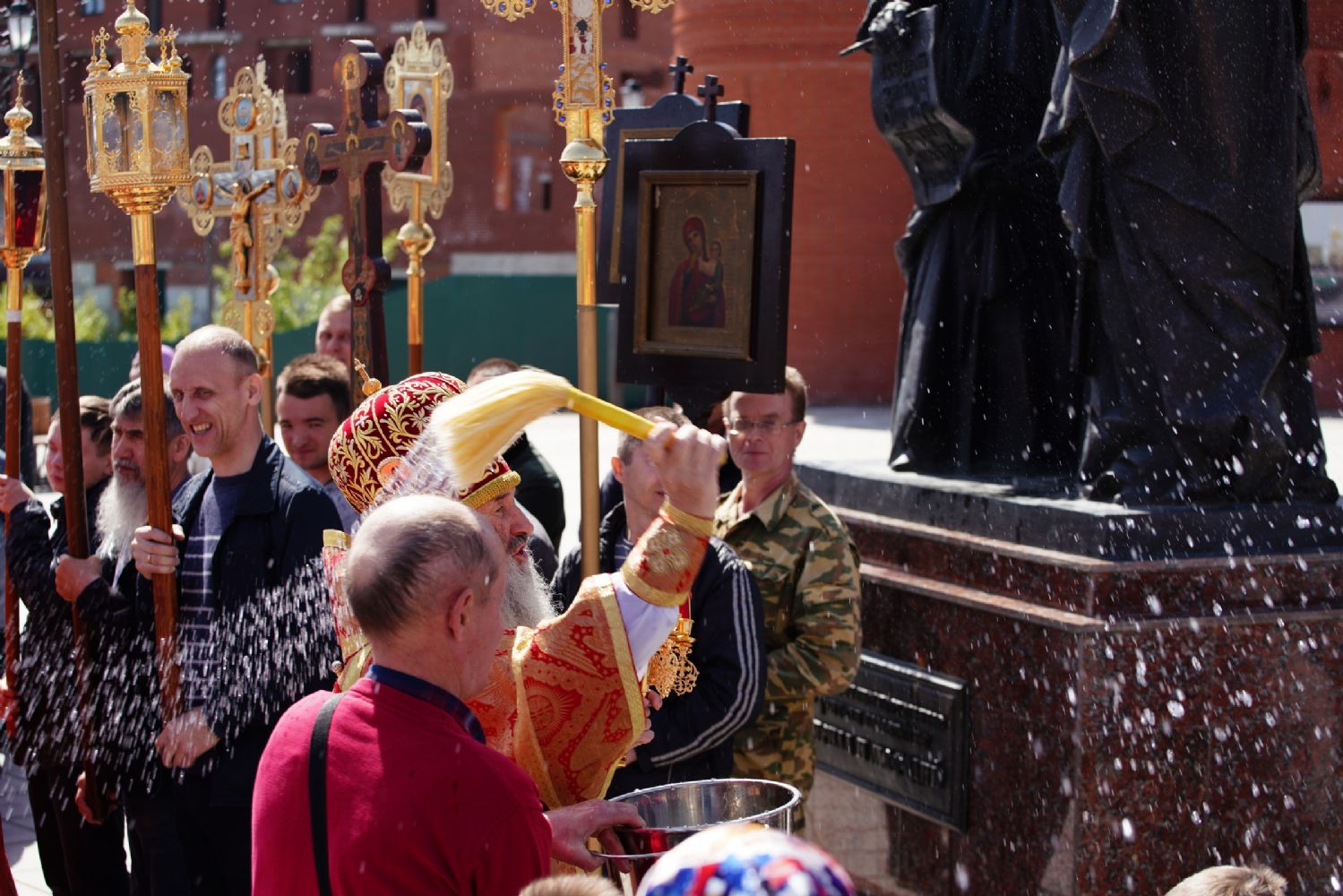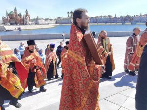 После Божественной литургии священство и прихожане из трех городских храмов – Благовещенского кафедрального собора, Вознесенского собора и Воскресенского собора – с иконами и хоругвями направились по набережной Кокшаги к памятнику святым Кириллу и Мефодию около Музея истории Православия. Крестный ход из Благовещенского собора возглавил митрополит Йошкар-Олинский и Марийский Иоанн.