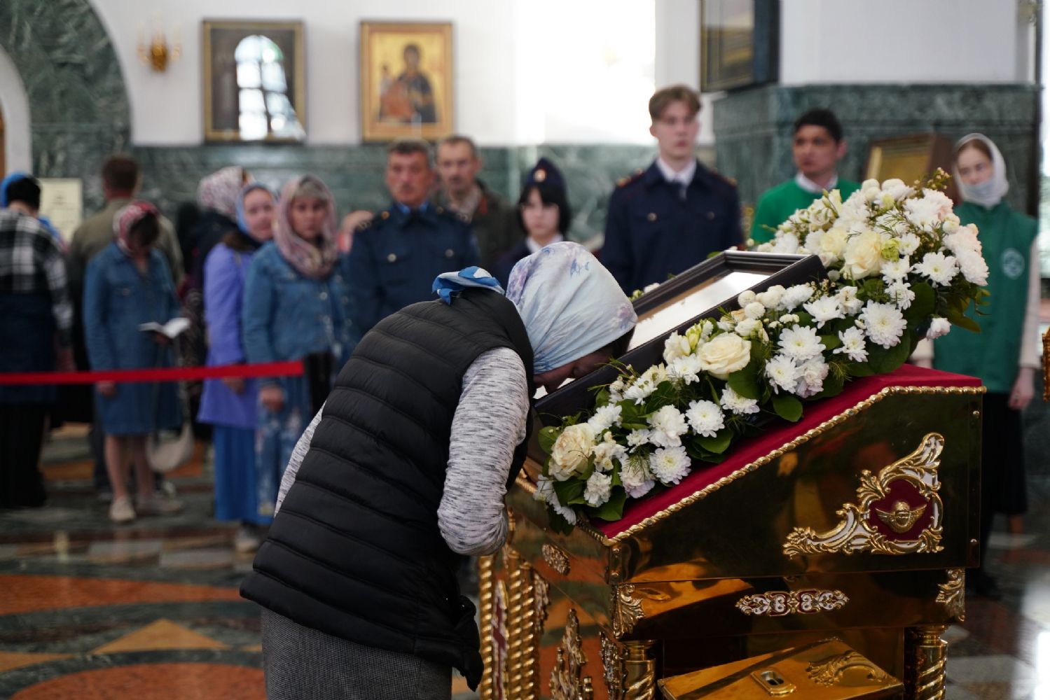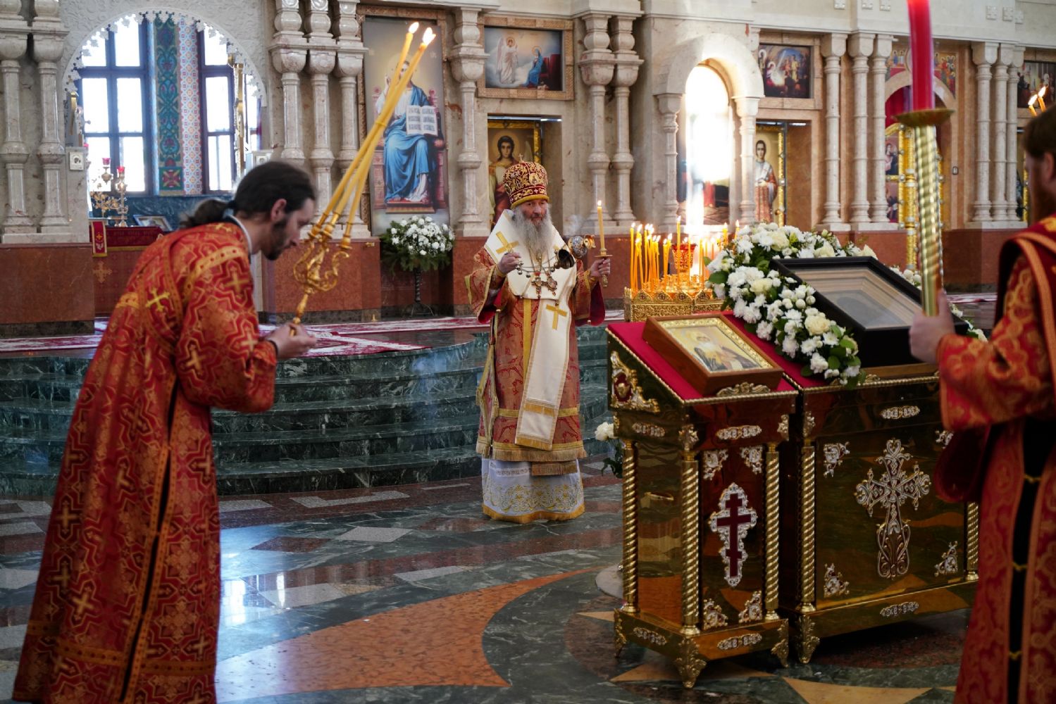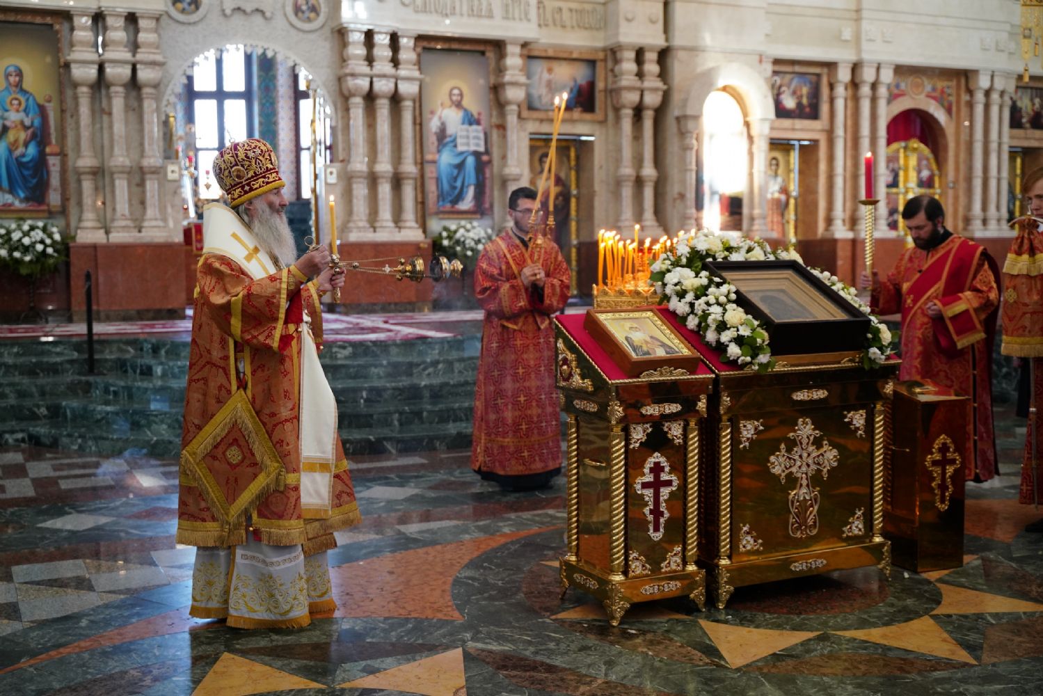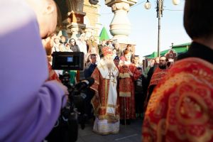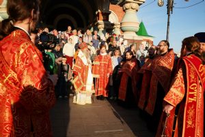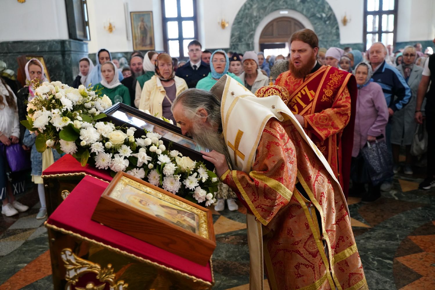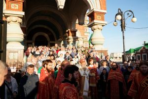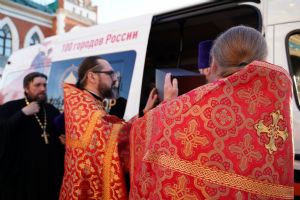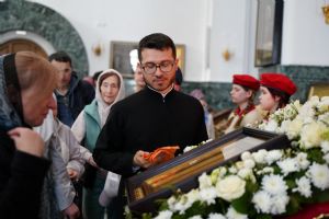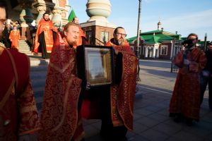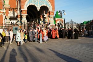 По окончании богослужения в центре храма было совершено славление Пресвятой Богородице, после чего священники пронесли икону к спецавтомобилю – святыня отправилась далее – в Киров.