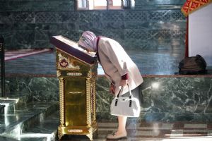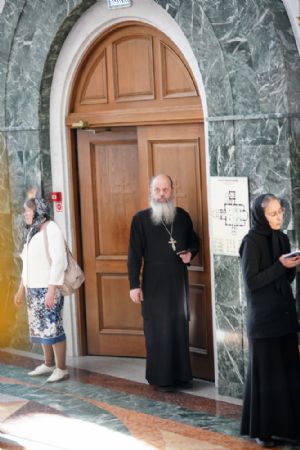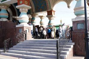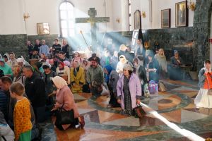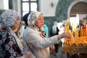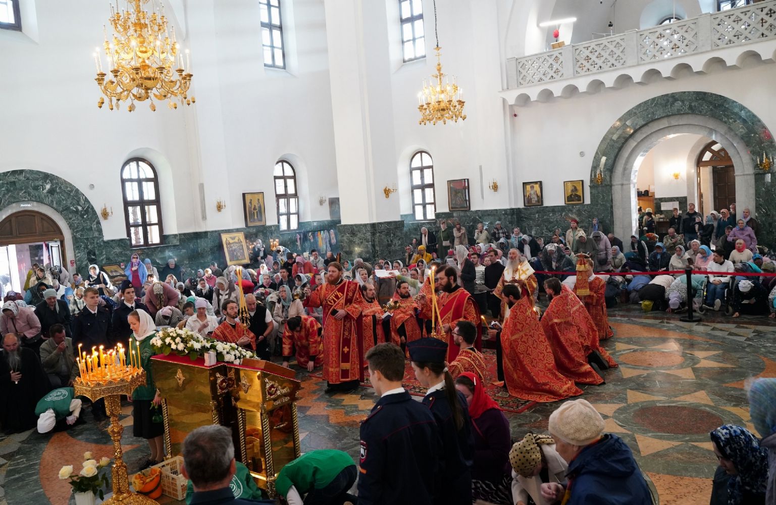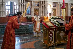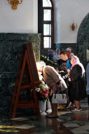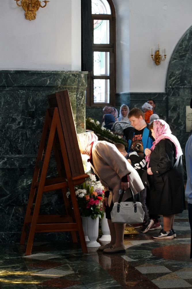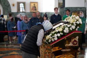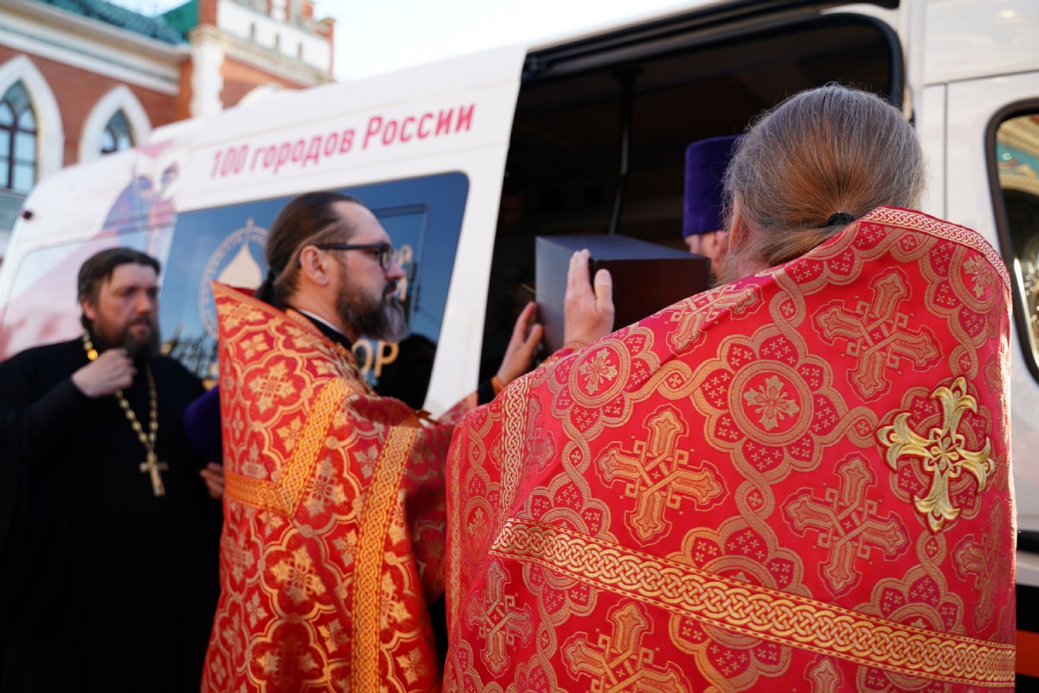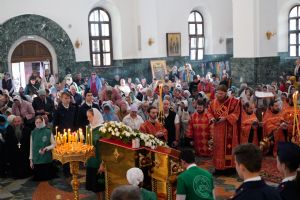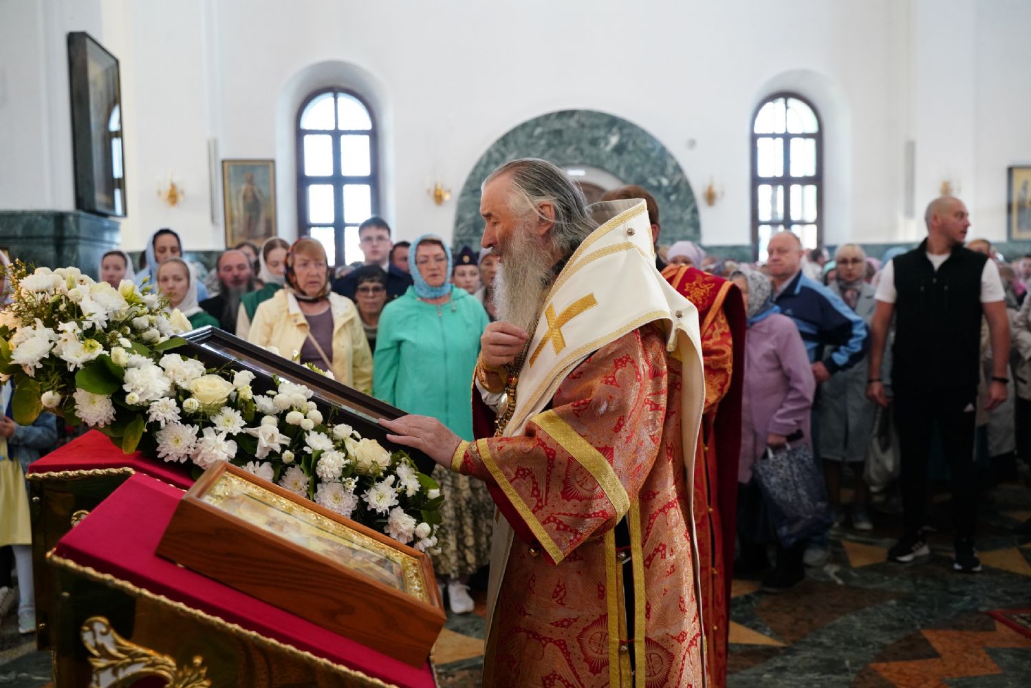 По окончании богослужения в центре храма было совершено славление Пресвятой Богородице, после чего священники пронесли икону к спецавтомобилю – святыня отправилась далее – в Киров.