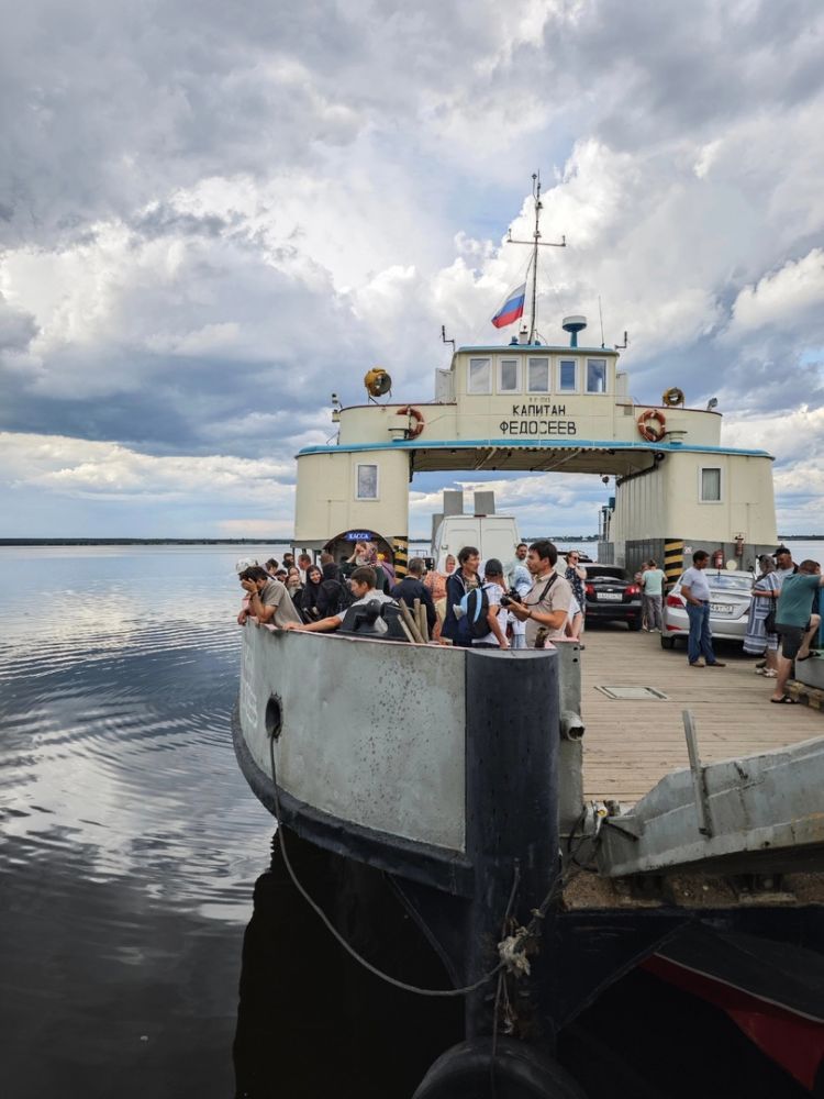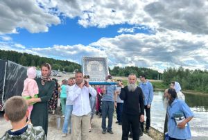 Далее верующие обошли с Владимирской иконой крестным ходом вокруг храма и с молитвами двинулись на берег Волги. Здесь они погрузились на паром и переправились на другую сторону – к поселку Юрино, где их радостно встретили прихожане Михаило-Архангельского храма во главе с настоятелем протоиереем Николаем Барсуковым.