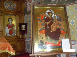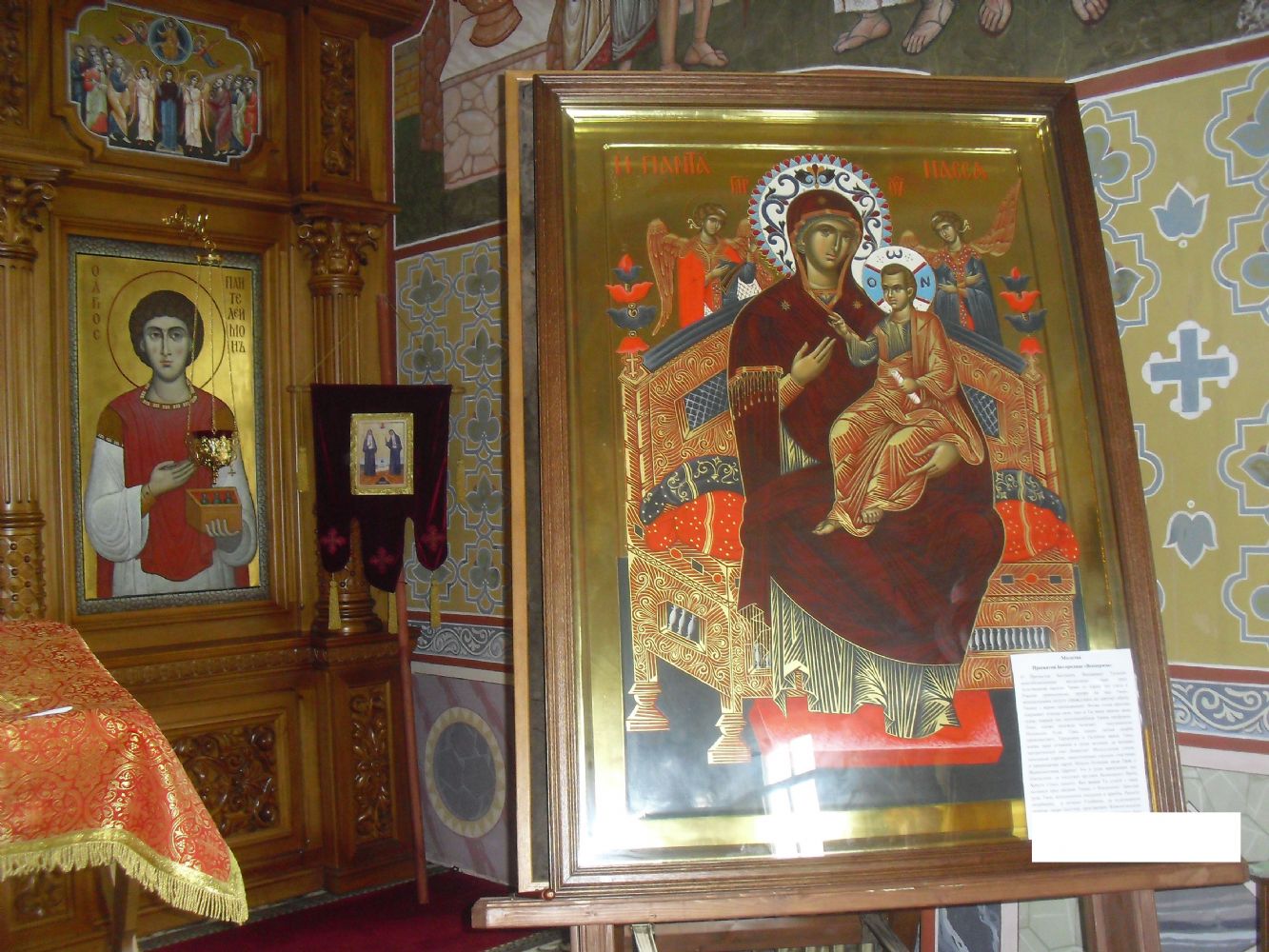Затем иеродиакон Роман ведет нас в монастырский корпус, в котором находится храм в честь великомученика и целителя Пантеилимона. Настенные росписи храма посвящены святым целителям – вмч. Пантеилимону, свт. Луке Крымскому, всем врачам-бессребреникам. В храме хранится список почитаемой иконы Божией Матери «Всецарица», написанный на горе Афон.