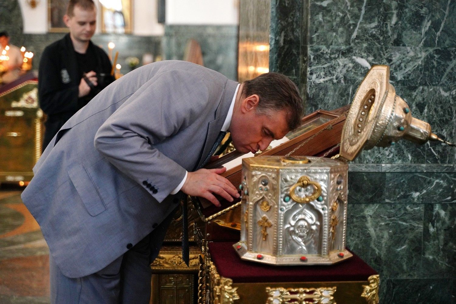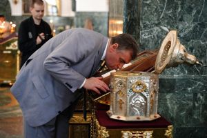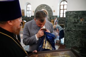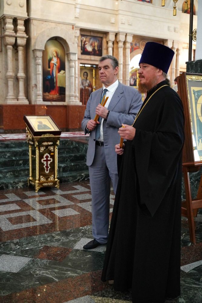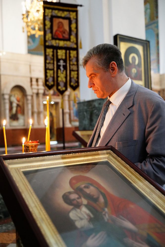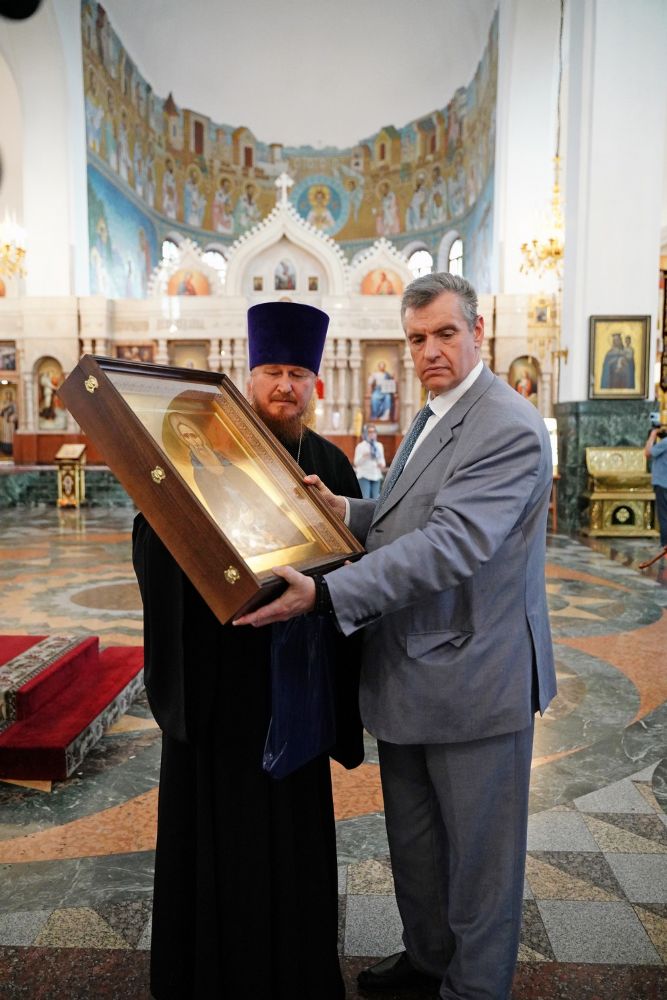Леонид Эдуардович приложился к иконам и мощам, поставил свечи. В дар собору гость преподнес образ преподобного Сергия Радонежского. А отец Сергий Поглазов подарил на память Леониду Слуцкому небольшую икону Божией Матери «Мироносицкая» и фотоальбом о храмах и святынях Марий Эл, выпущенный к 30-летию Йошкар-Олинской епархии.