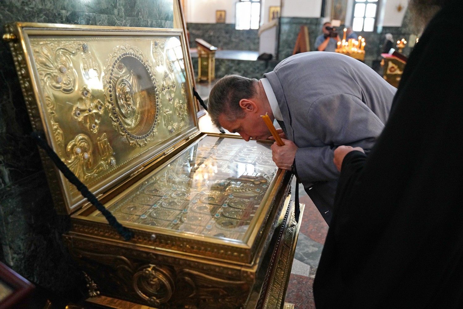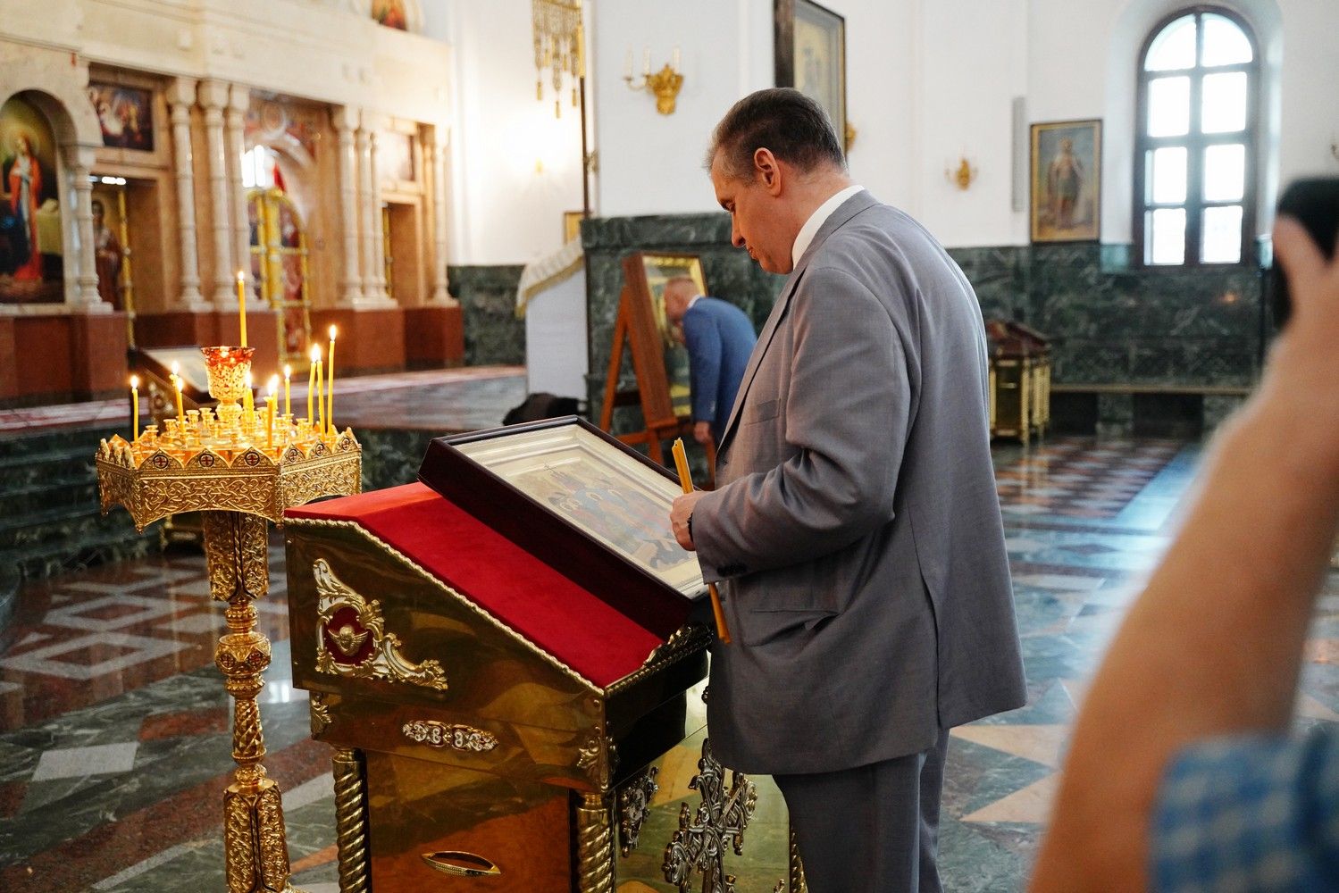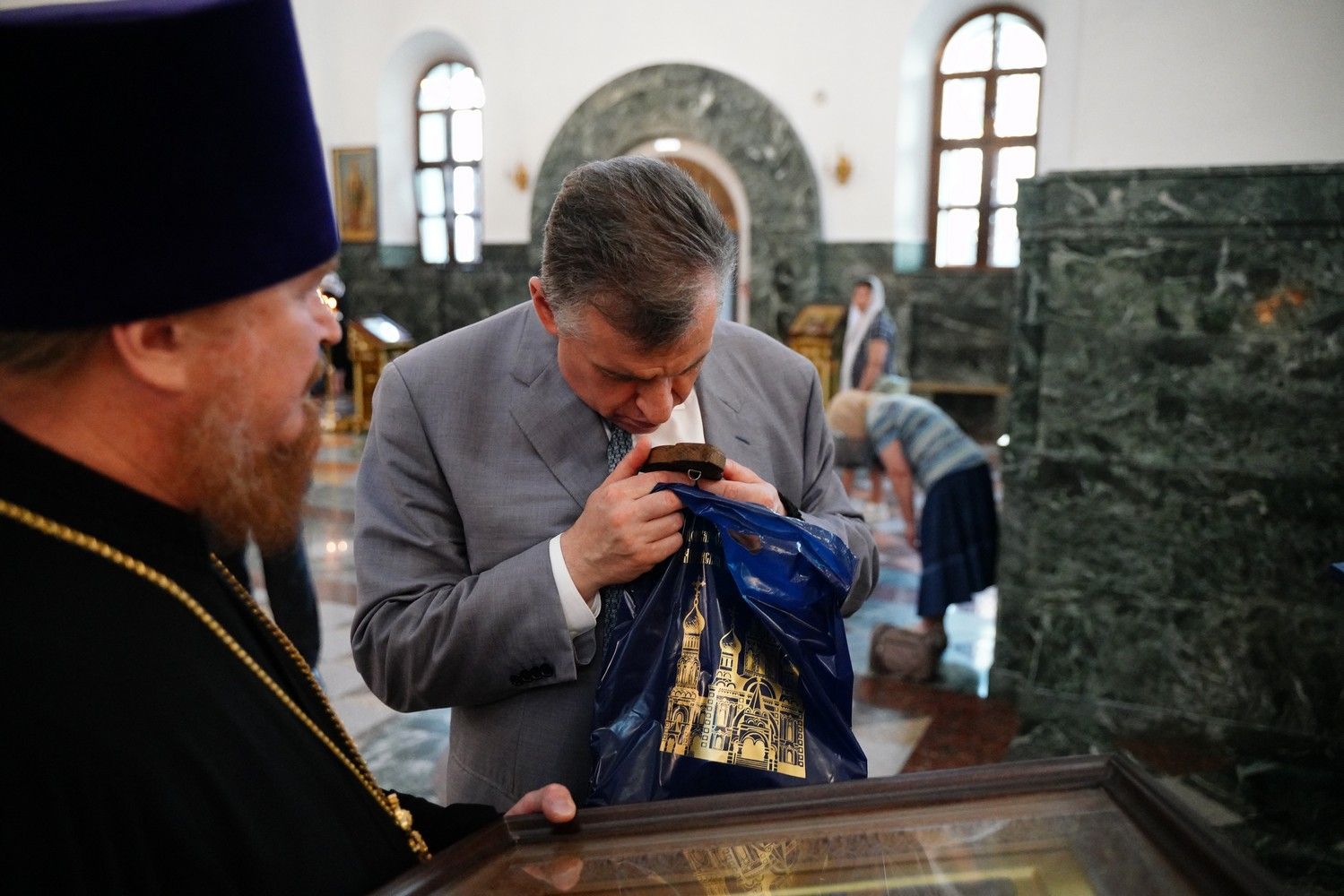 Леонид Эдуардович приложился к иконам и мощам, поставил свечи. В дар собору гость преподнес образ преподобного Сергия Радонежского. А отец Сергий Поглазов подарил на память Леониду Слуцкому небольшую икону Божией Матери «Мироносицкая» и фотоальбом о храмах и святынях Марий Эл, выпущенный к 30-летию Йошкар-Олинской епархии.