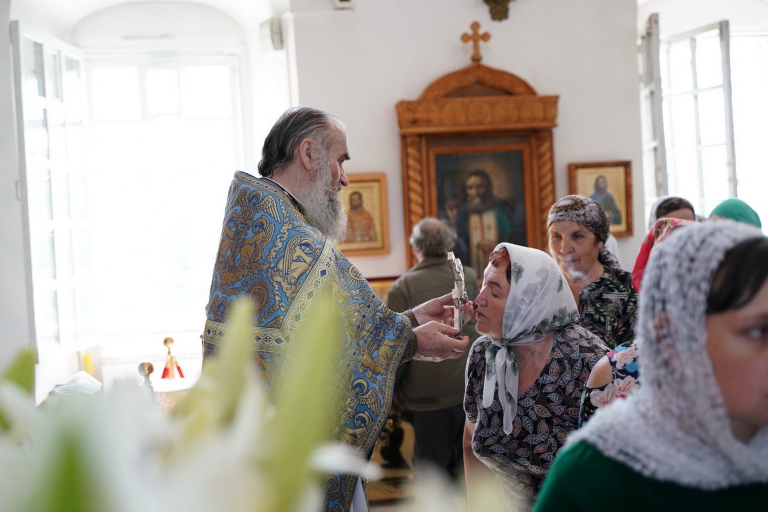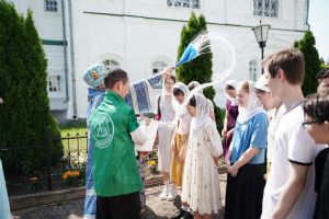 По традиции престольных праздников, после Литургии прошел крестный ход вокруг храма пасхальным чином с чтением Евангелия и кроплением святой водой. Затем владыка обратился к собравшимся с проповедью.