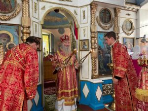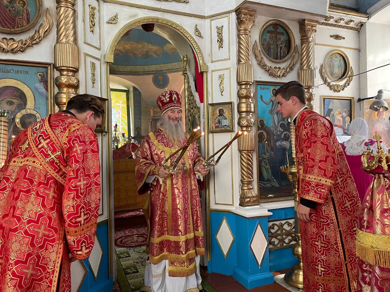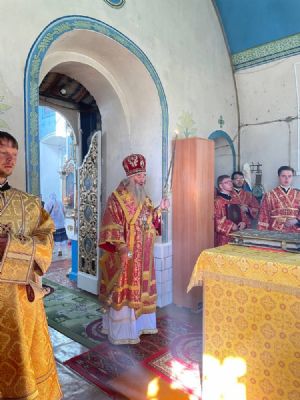 Владыке сослужили секретарь Йошкар-Олинского епархиального управления иерей Димитрий Дьяков, настоятель храма игумен Никодим (Актанаев), протодиакон Михаил Козловский и клирик Вознесенского собора г. Йошкар-Олы диакон Владимир Лихачев. Песнопения исполнял сводный хор под управлением Ангелины Соловьевой.