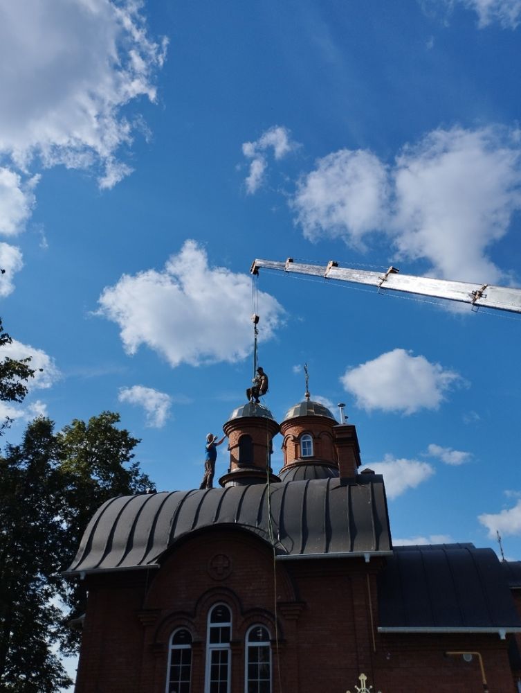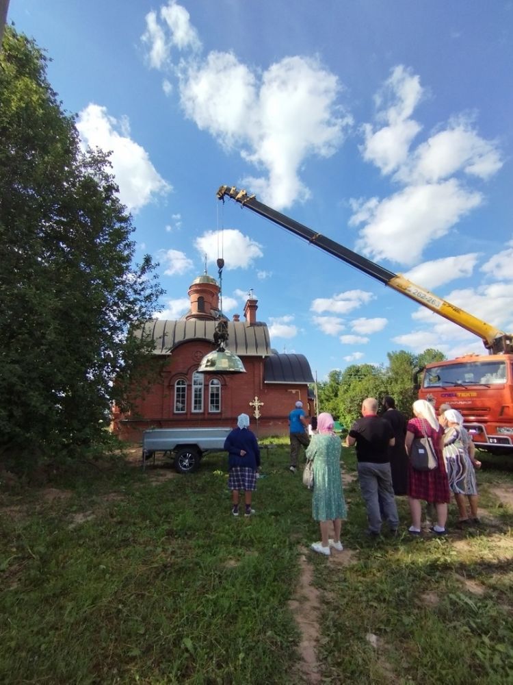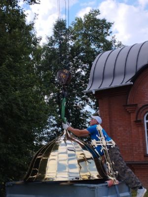 На радостное событие – освящение купола с крестом и установку его на крестильню – собралось немало жителей села. Чин освящения совершил настоятель храма иерей Никита Смирнов. После водосвятного молебна батюшка окропил святой водой купол, крест и всех присутствующих. Далее рабочие с помощью подъемного крана установили купол на здание, закрепили его и водрузили сверху крест.