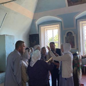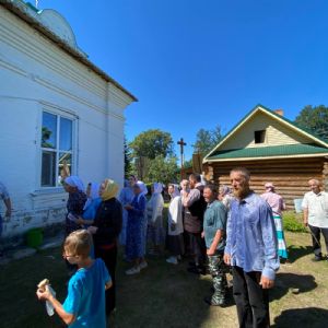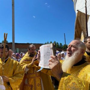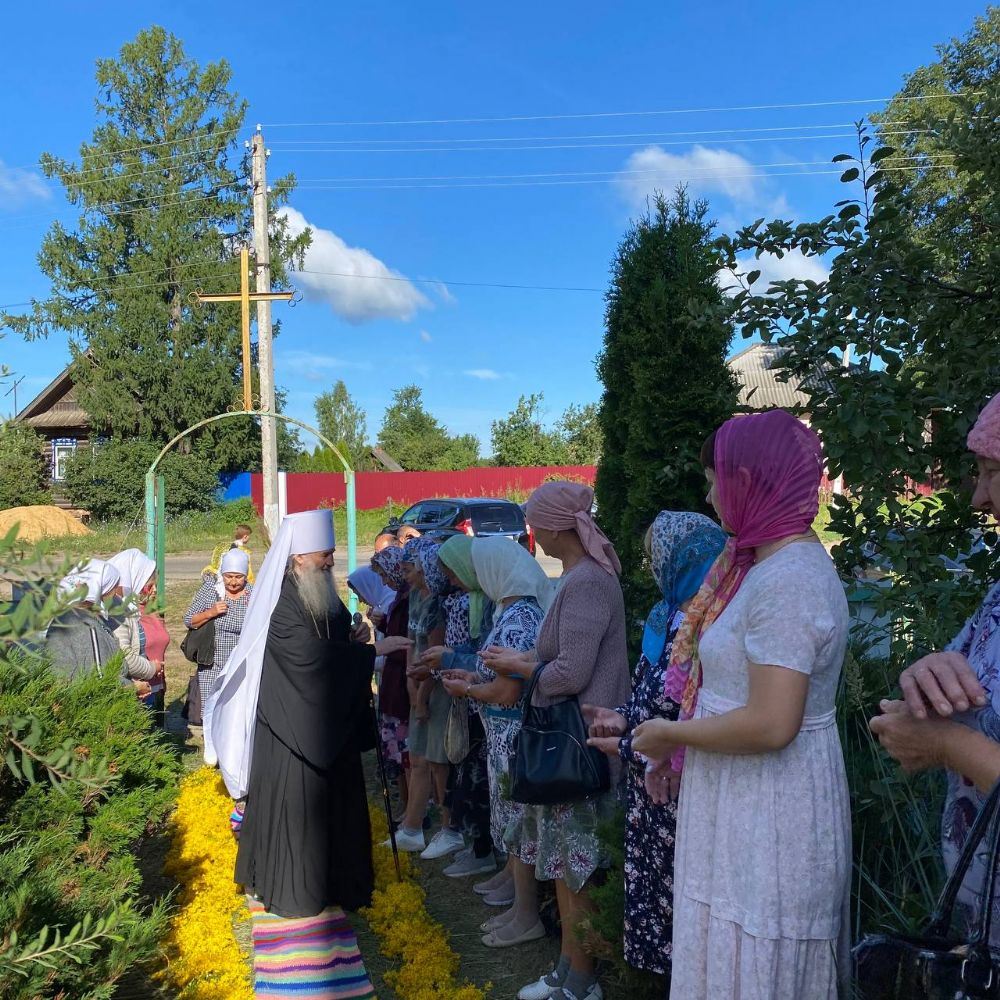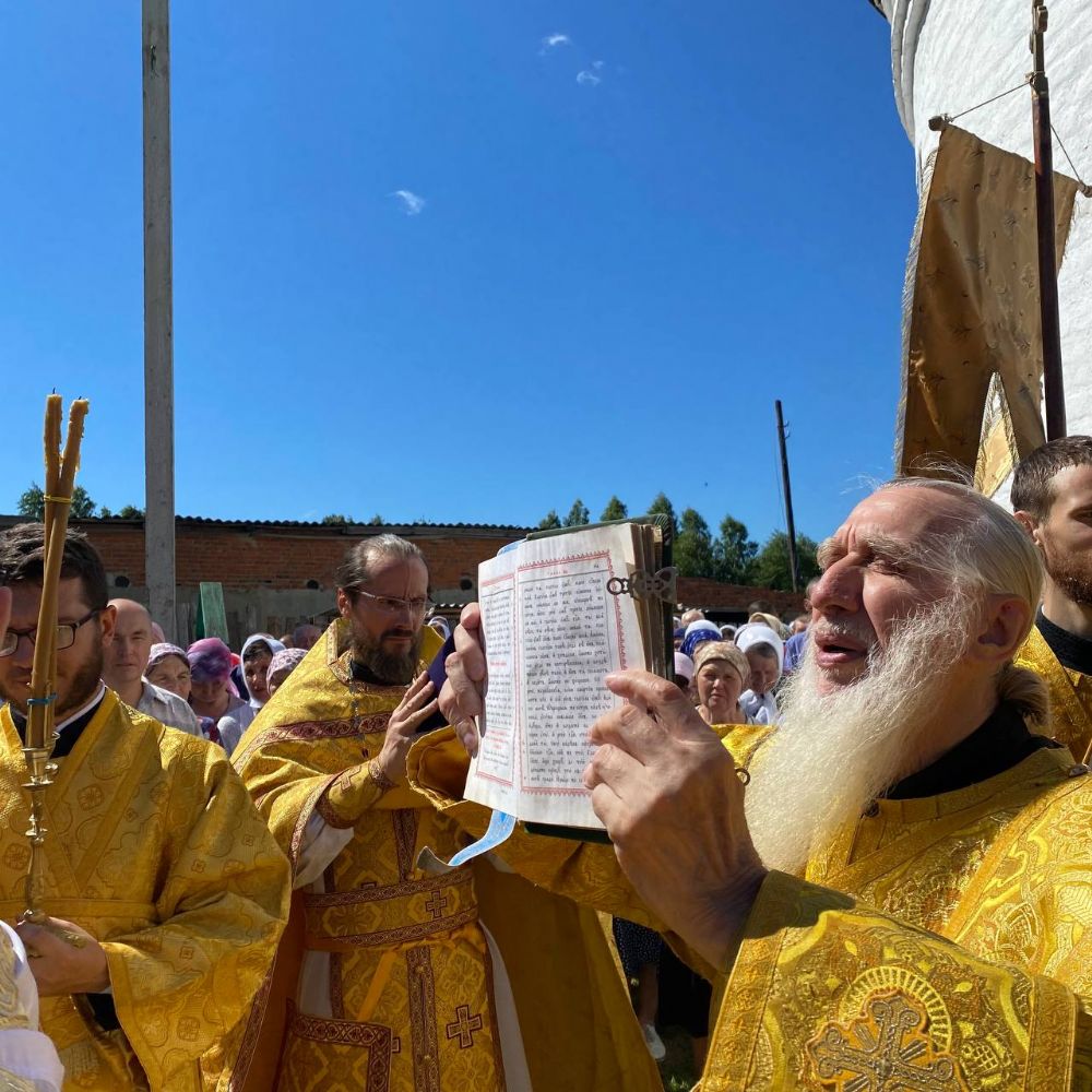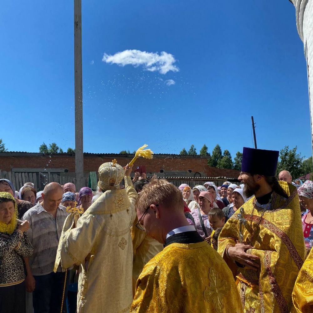 По традиции престольных праздников после Литургии прошел крестный ход вокруг храма, владыка щедро окропил всех святой водой.