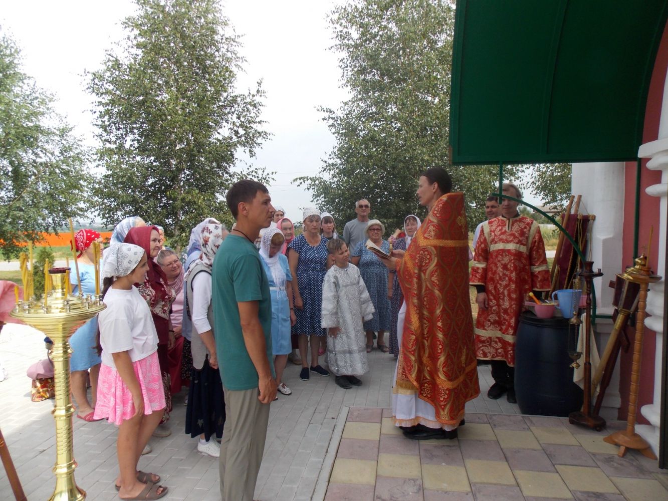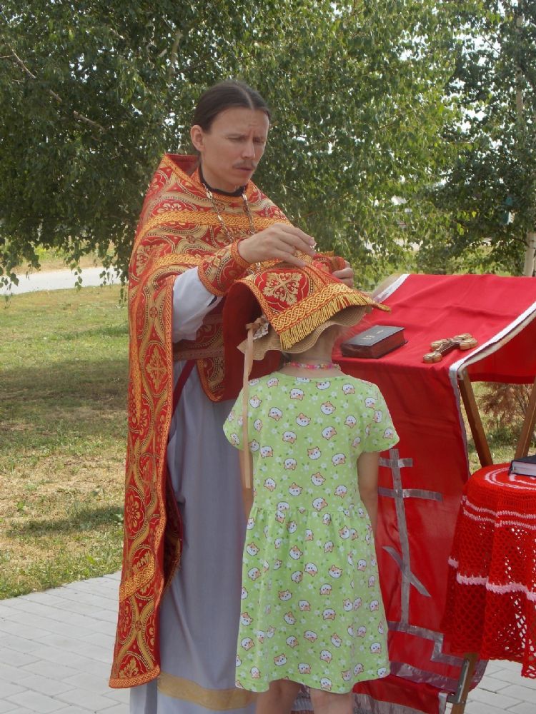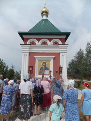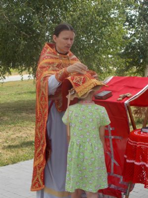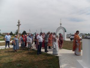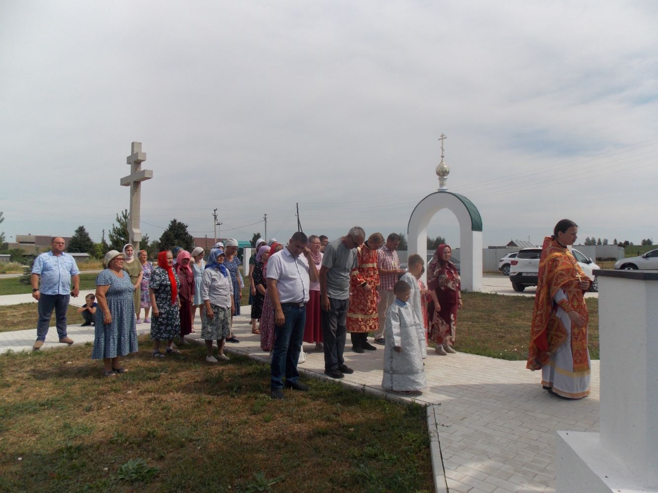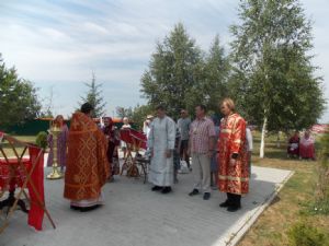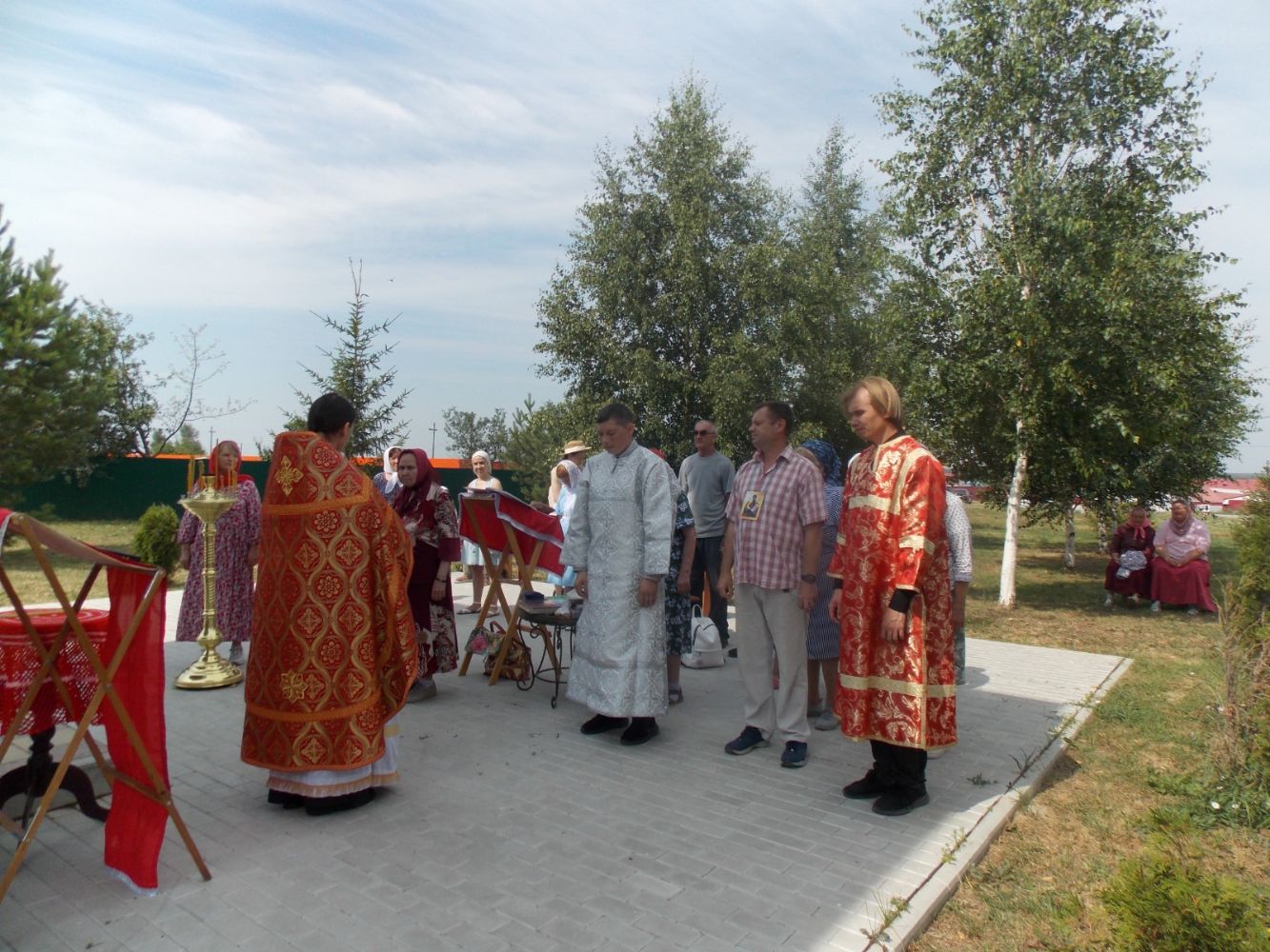 После Литургии прошел крестный ход вокруг часовни со чтением Евангелия и кроплением святой водой. Батюшка отслужил молебен и литию у мемориала воинам, павшим в годы Великой Отечественной войны.