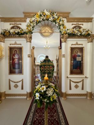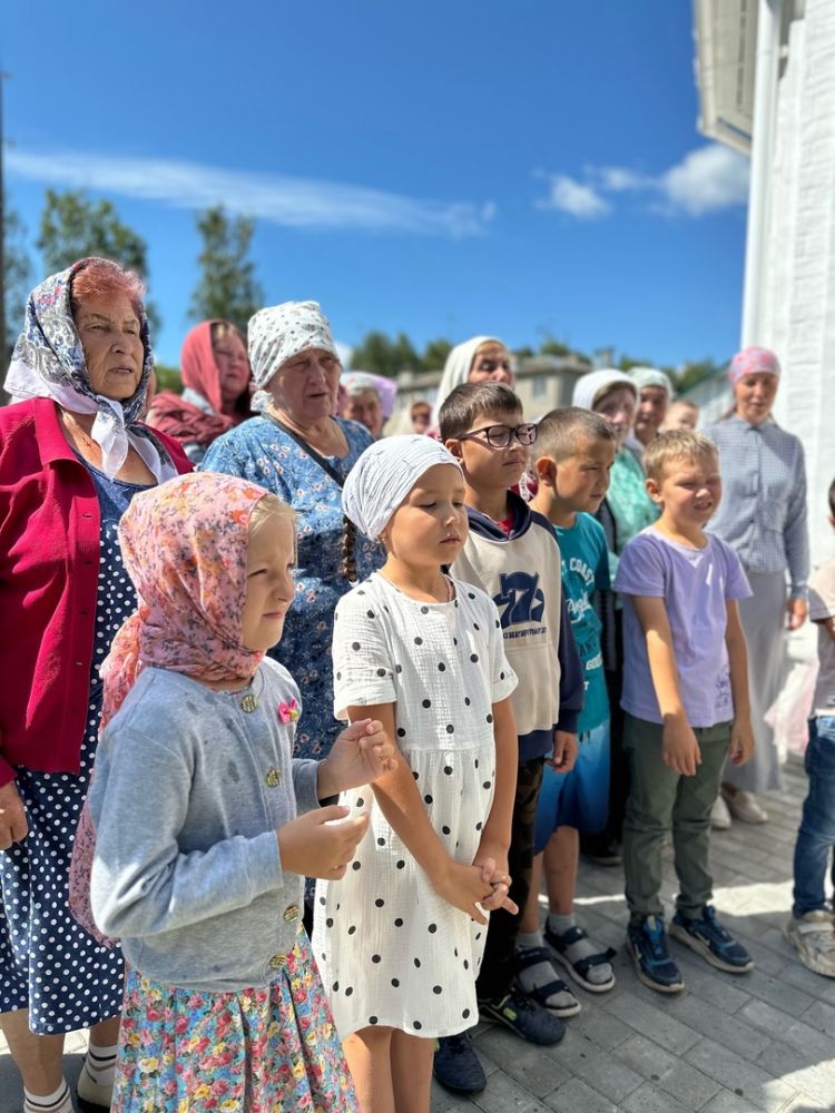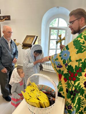 После Литургии вокруг храма прошел праздничный крестный ход со чтением Евангелия и кроплением святой водой. Всем присутствующим были вручены небольшие памятные подарки.