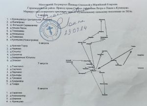 Маршрут крестного хода на карте по форме напоминает крест – каждый день верующие со чтимыми образами Казанской Божией Матери, Николая Чудотворца, апостолов Петра и Павла, блаженной Матроны Московской, пророка Илии и других святых выходили с утра из Петропавловского храма с. Кузнецово и, обойдя ряд населенных пунктов, к вечеру возвращались туда же. Таким образом, за четыре дня были охвачены все деревни Кузнецовского сельского поселения.