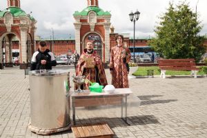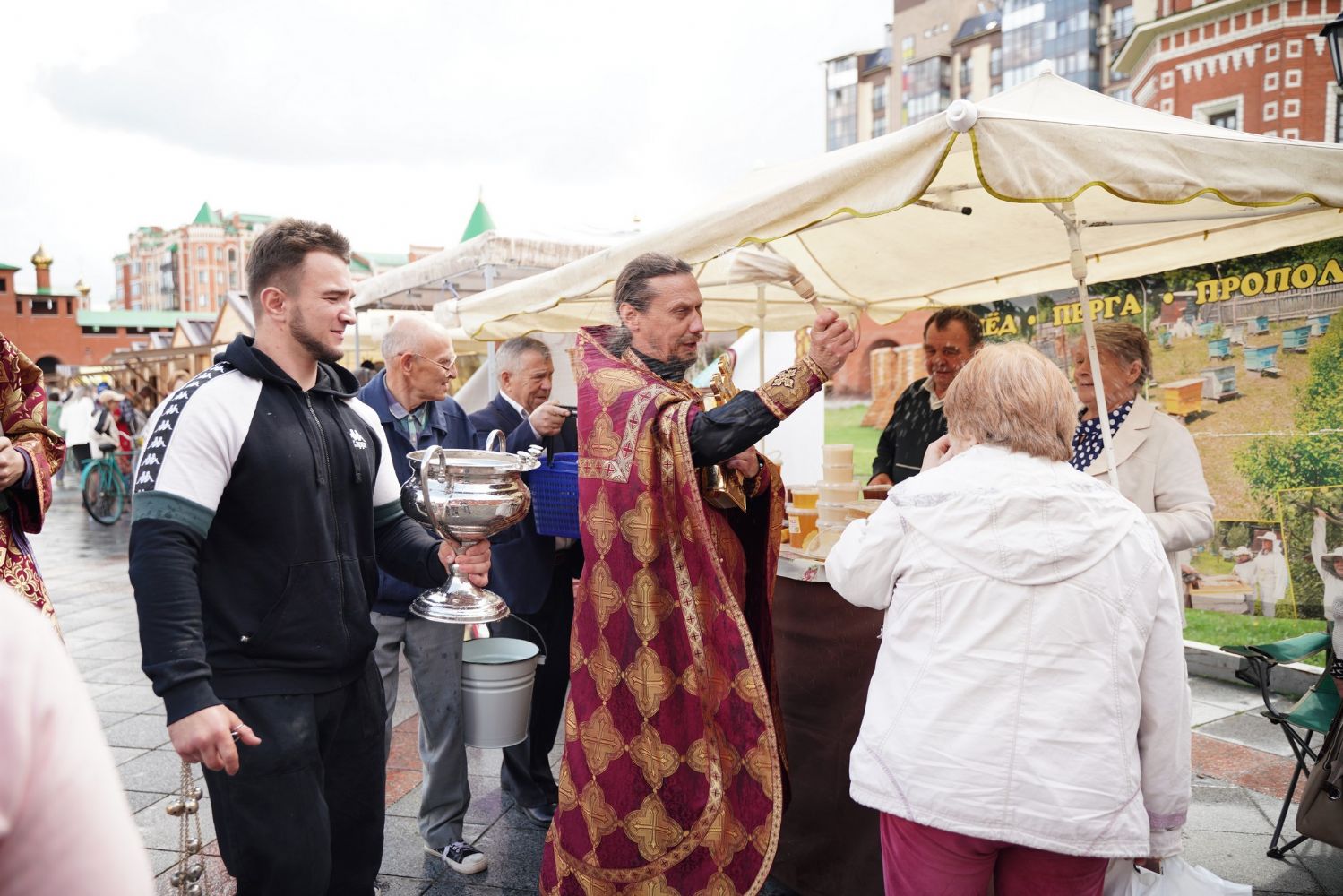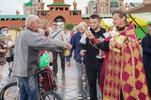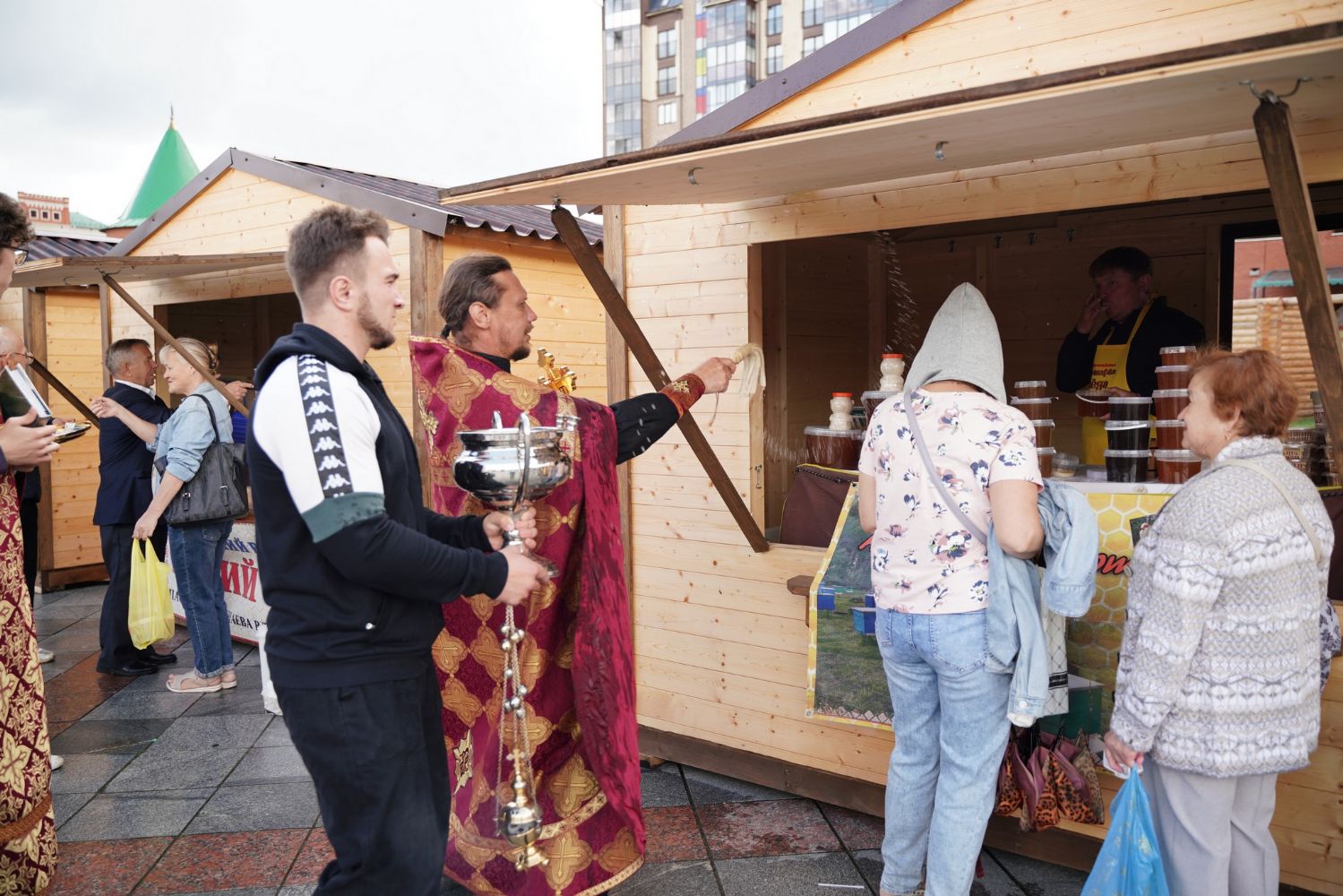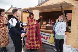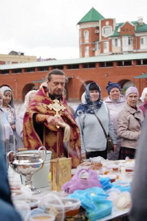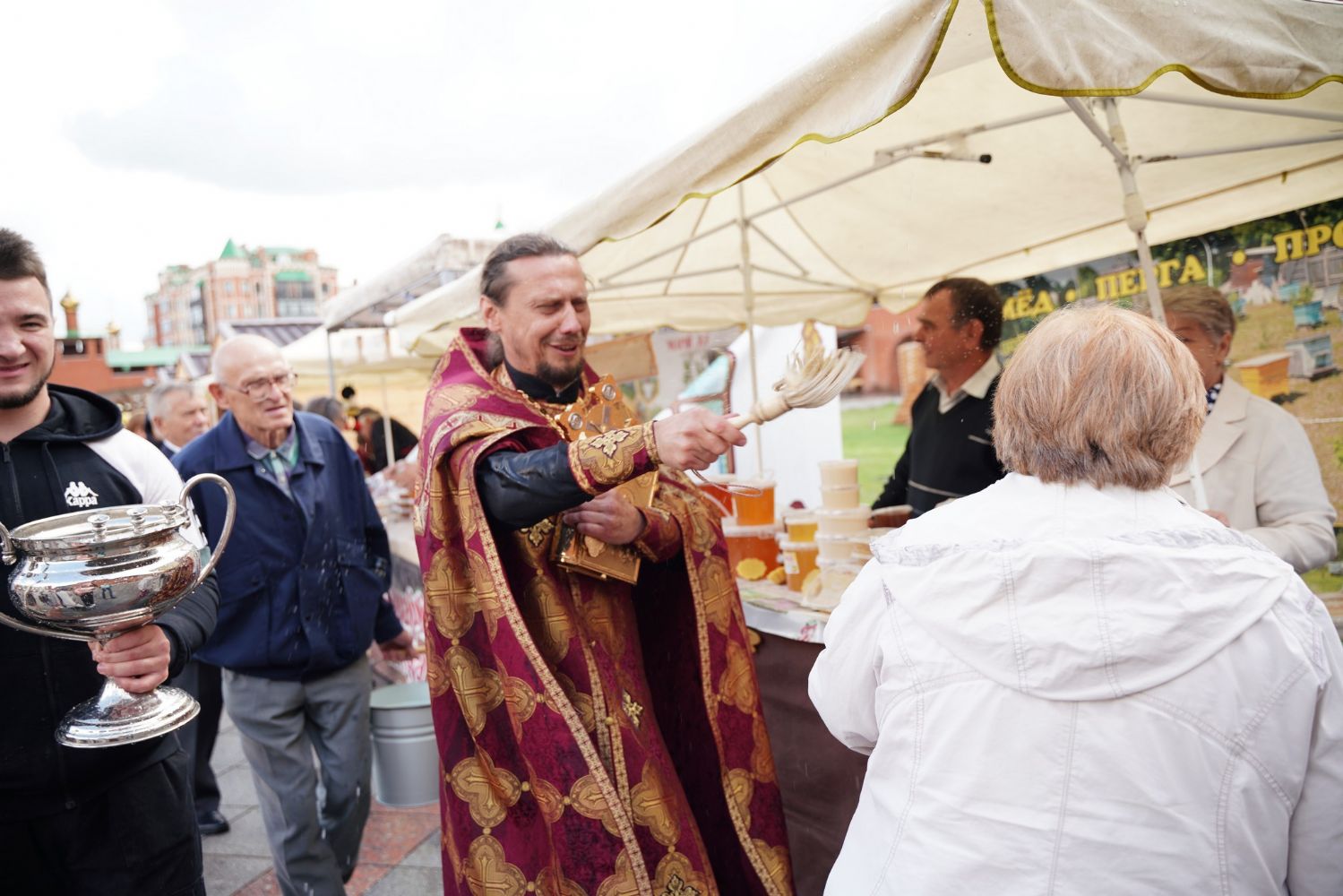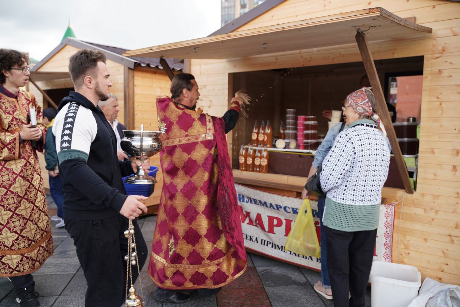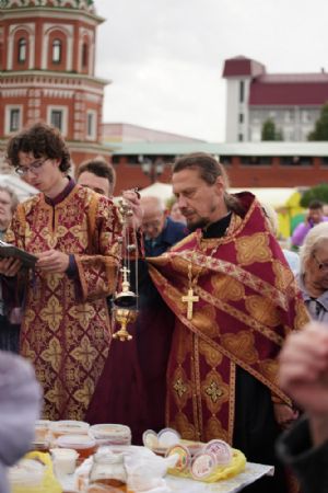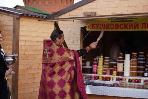 На открытии ярмарки настоятель Воскресенского собора г. Йошкар-Олы иерей Андрей Кочаков совершил водосвятный молебен, после чего обошел все торговые места и окропил святой водой мед и собравшихся людей.
