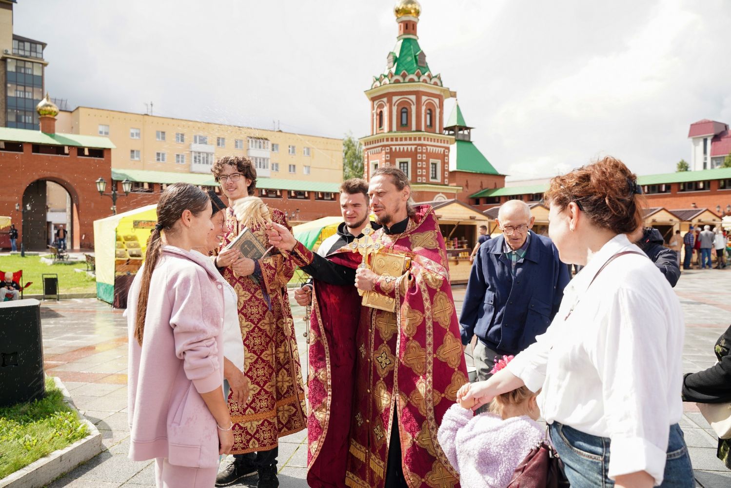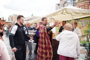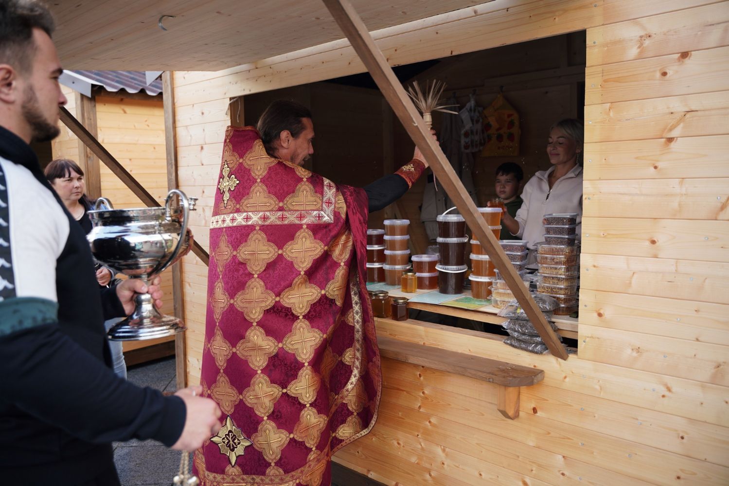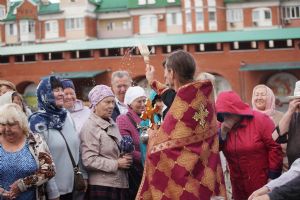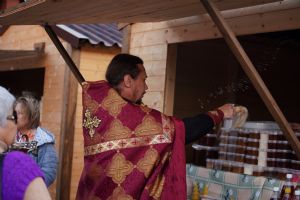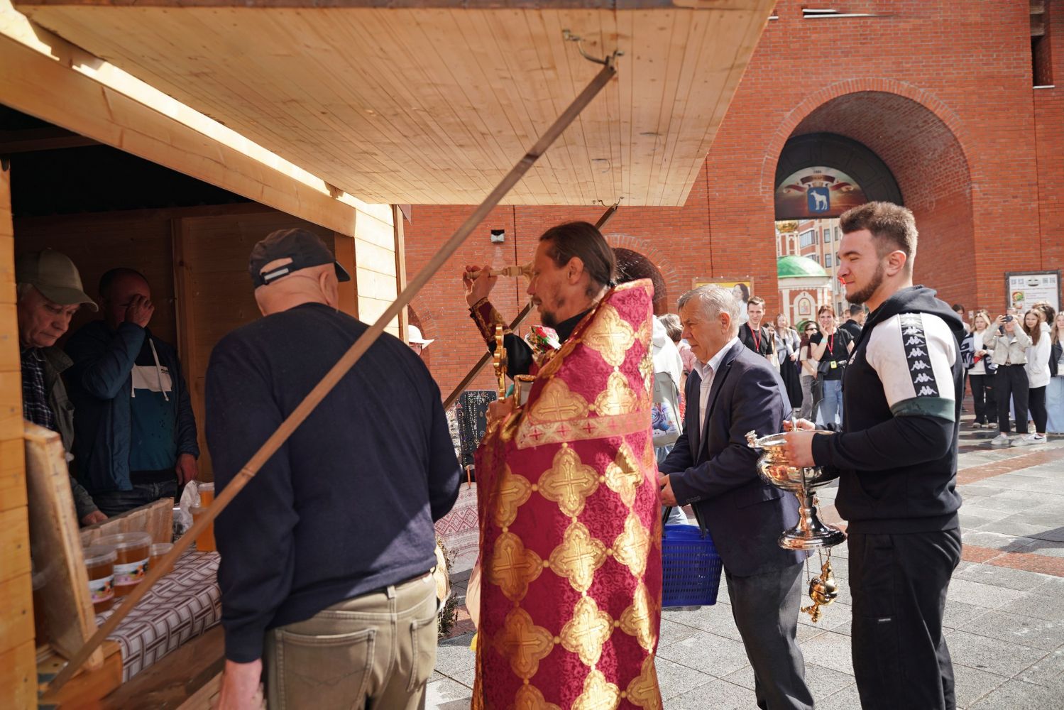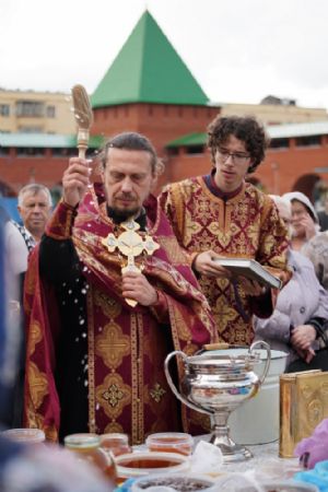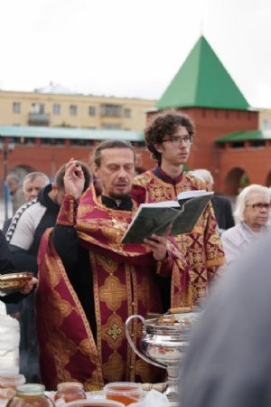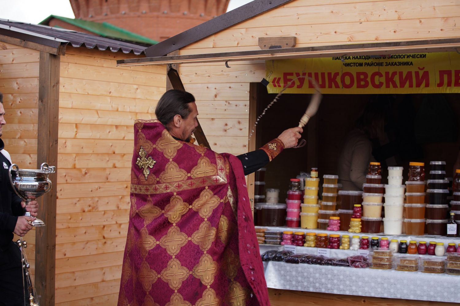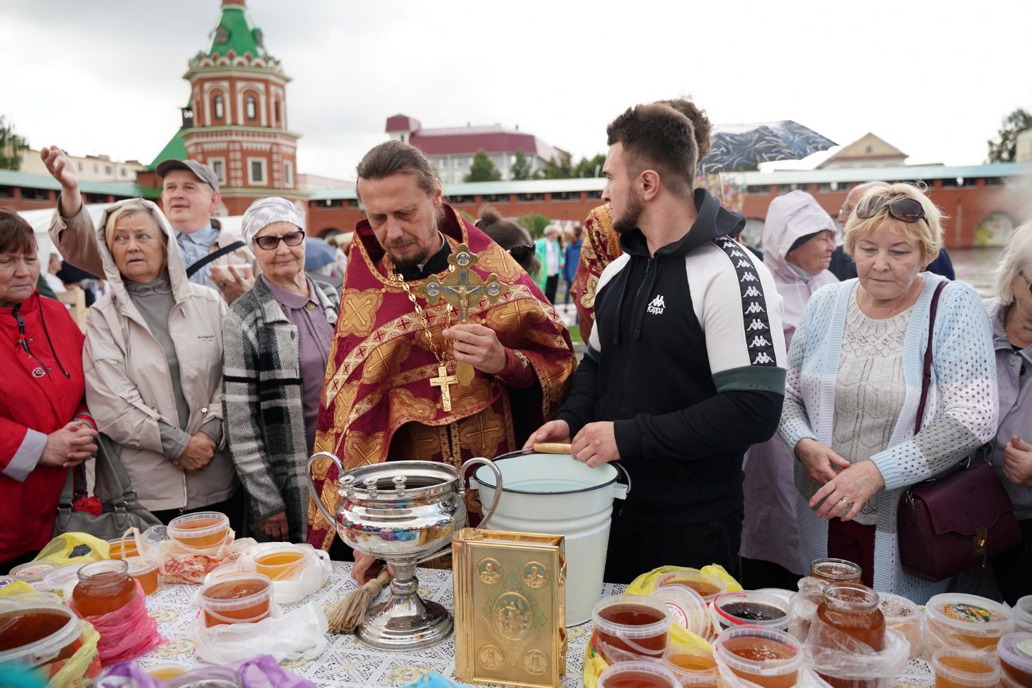 На открытии ярмарки настоятель Воскресенского собора г. Йошкар-Олы иерей Андрей Кочаков совершил водосвятный молебен, после чего обошел все торговые места и окропил святой водой мед и собравшихся людей.