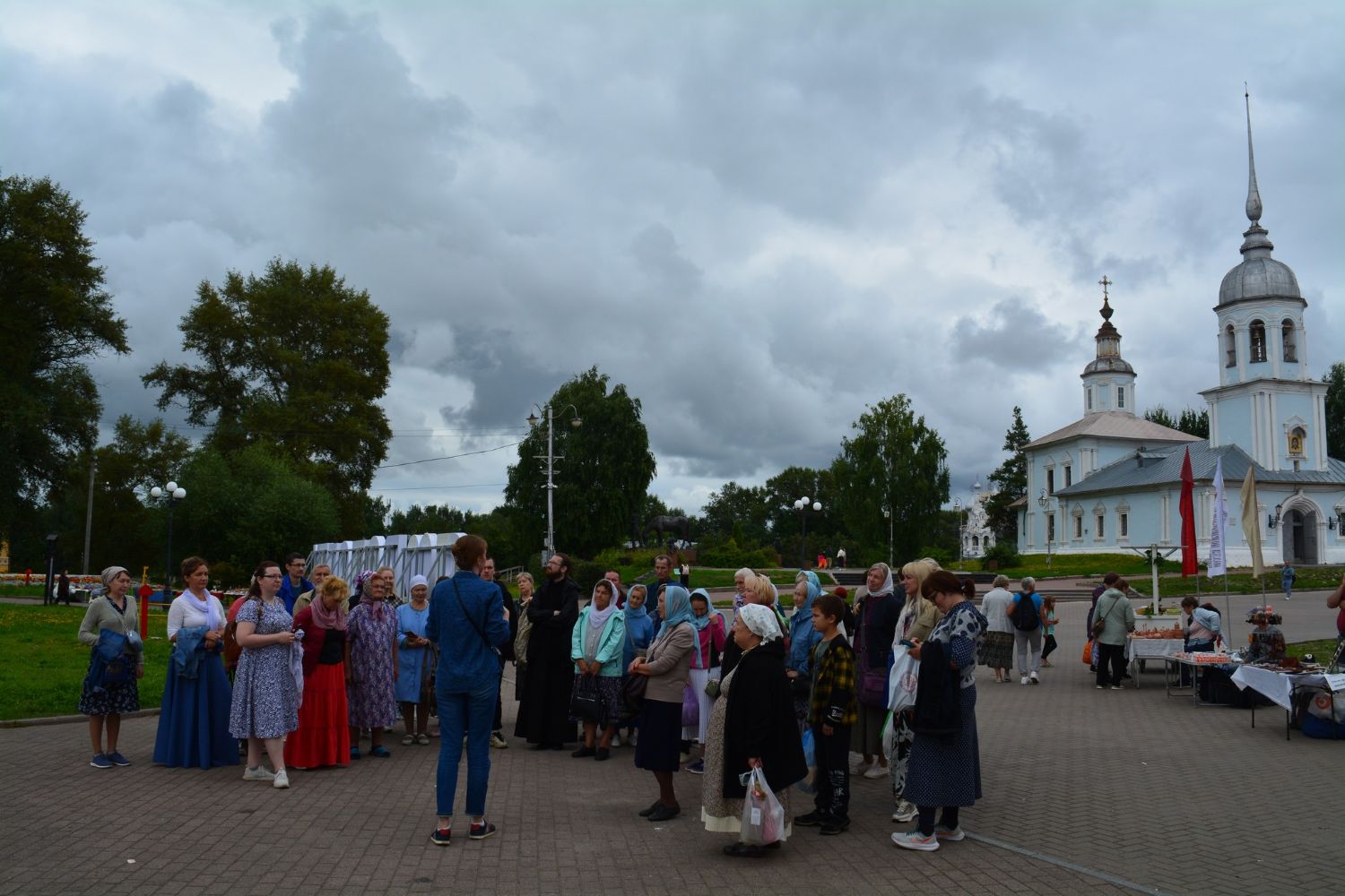 На следующий день участники поездки после Литургии отправились на экскурсию по храмам и монастырям Вологды: посетили место упокоения основателя города – преподобного Герасима Вологодского, поклонились мощам праведного Александра Баданина, Вологодского, и чудотворному образу Божией Матери «Семистрельная». В храме на Лазаревском кладбище, где хранятся эти святыни, настоятель подарил всем экскурсантам иконки праведного Александра и брошюры с жизнеописанием святого с акафистом. Далее паломники посетили Воскресенский кафедральный собор Вологды, где поклонились мощам Заоникиевских святых и другим святыням, а затем отправились на экскурсию по древнему Софийскому собору. Завершился день экскурсией по Спасо-Прилуцкому Димитриеву мужскому монастырю, где все имели возможность поклониться надгробиям преподобных Димитрия и Игнатия Прилуцких и князя Димитрия Угличского.