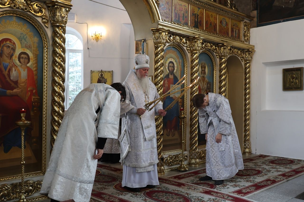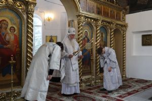 Архипастырю сослужили клирики собора, песнопения исполнял народный хор под управлением регента Марии Захаровой.
