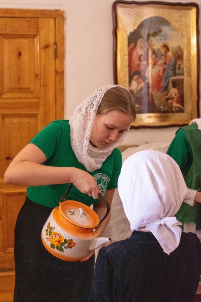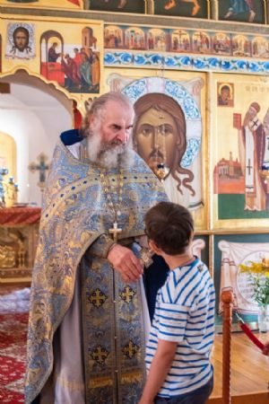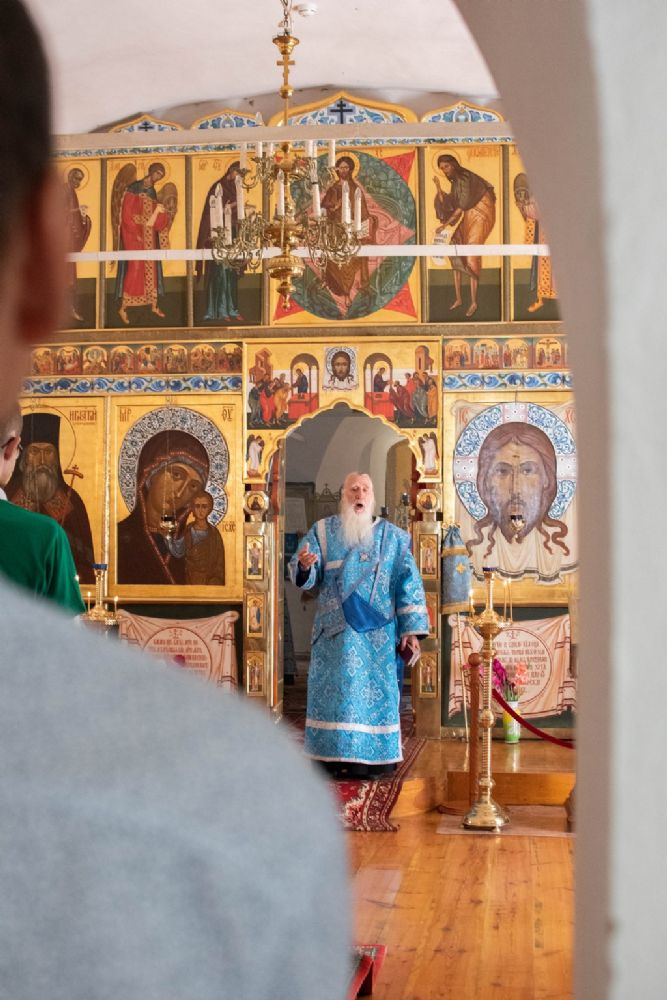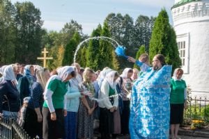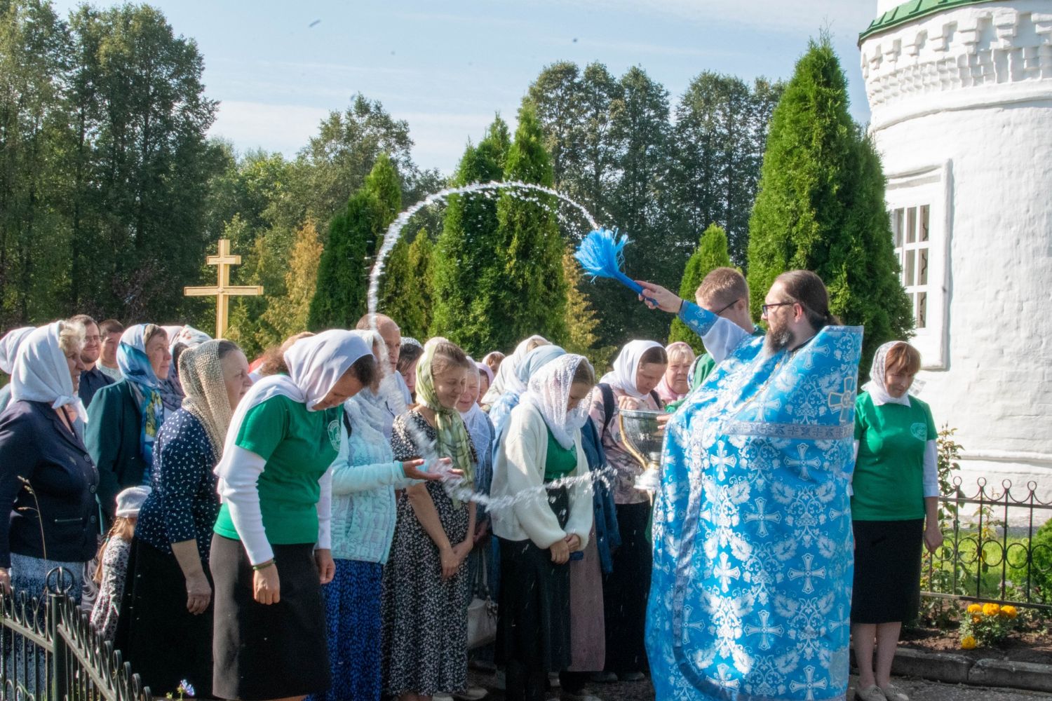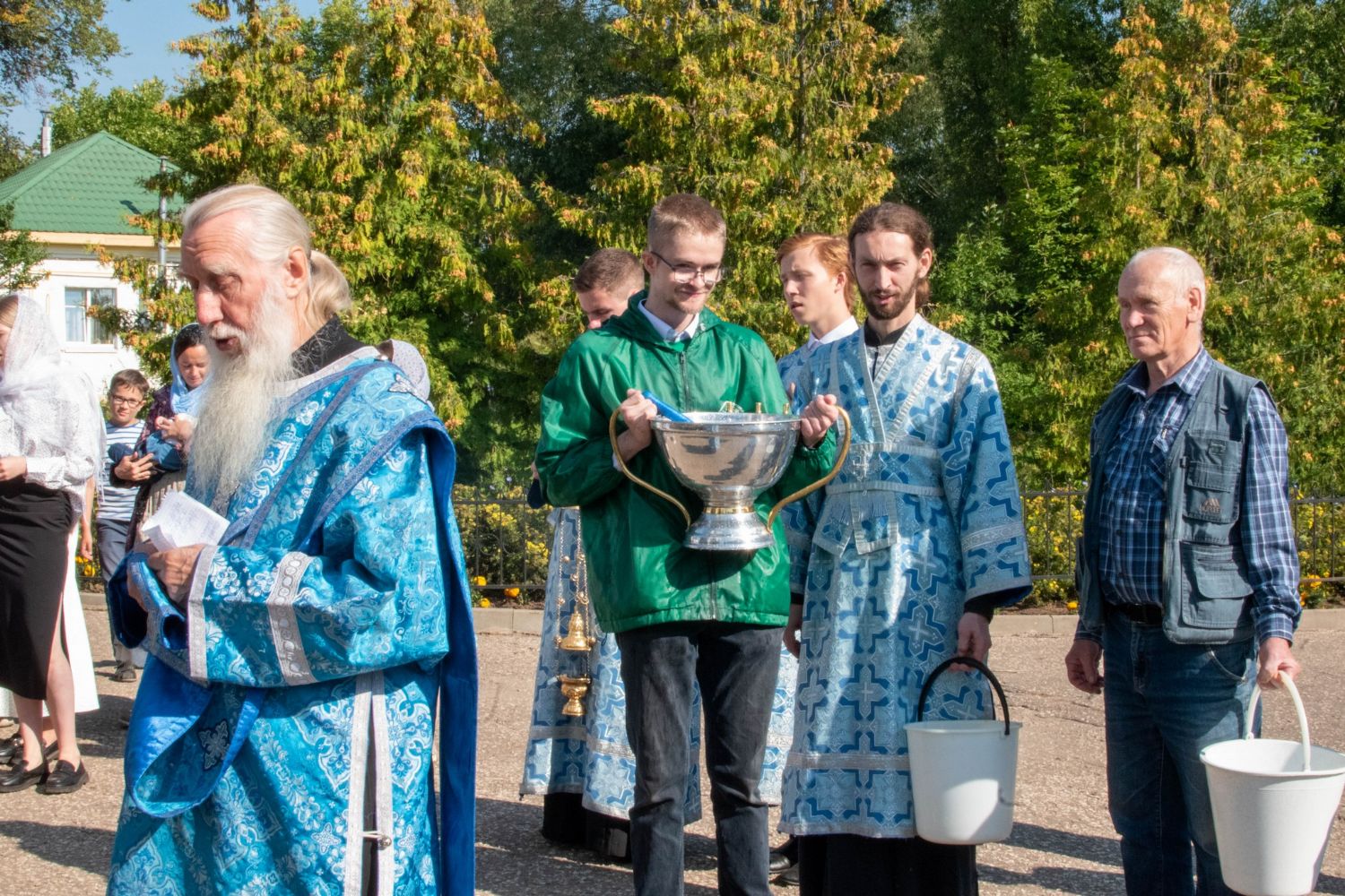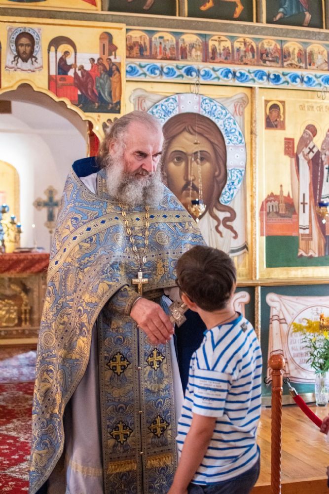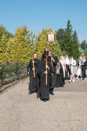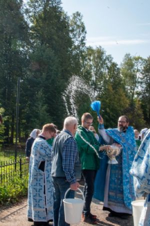 После Литургии, по традиции престольных праздников, прошел крестный ход вокруг храма с кроплением святой водой и чтением Евангелия и молитвы перед Нерукотворенным Образом Спасителя.
