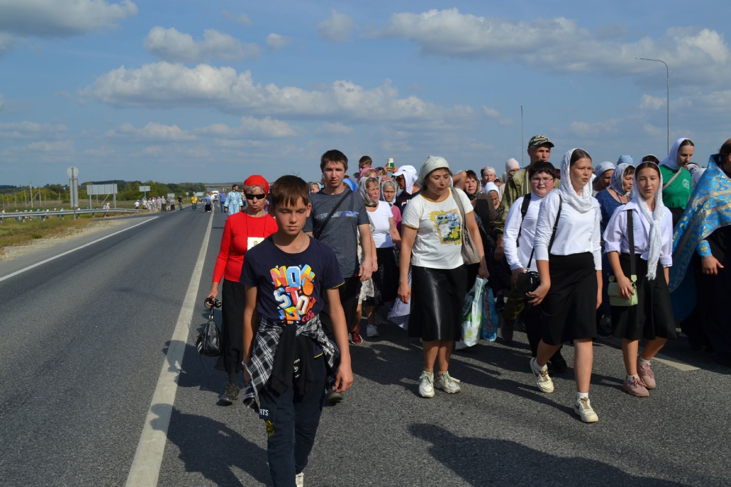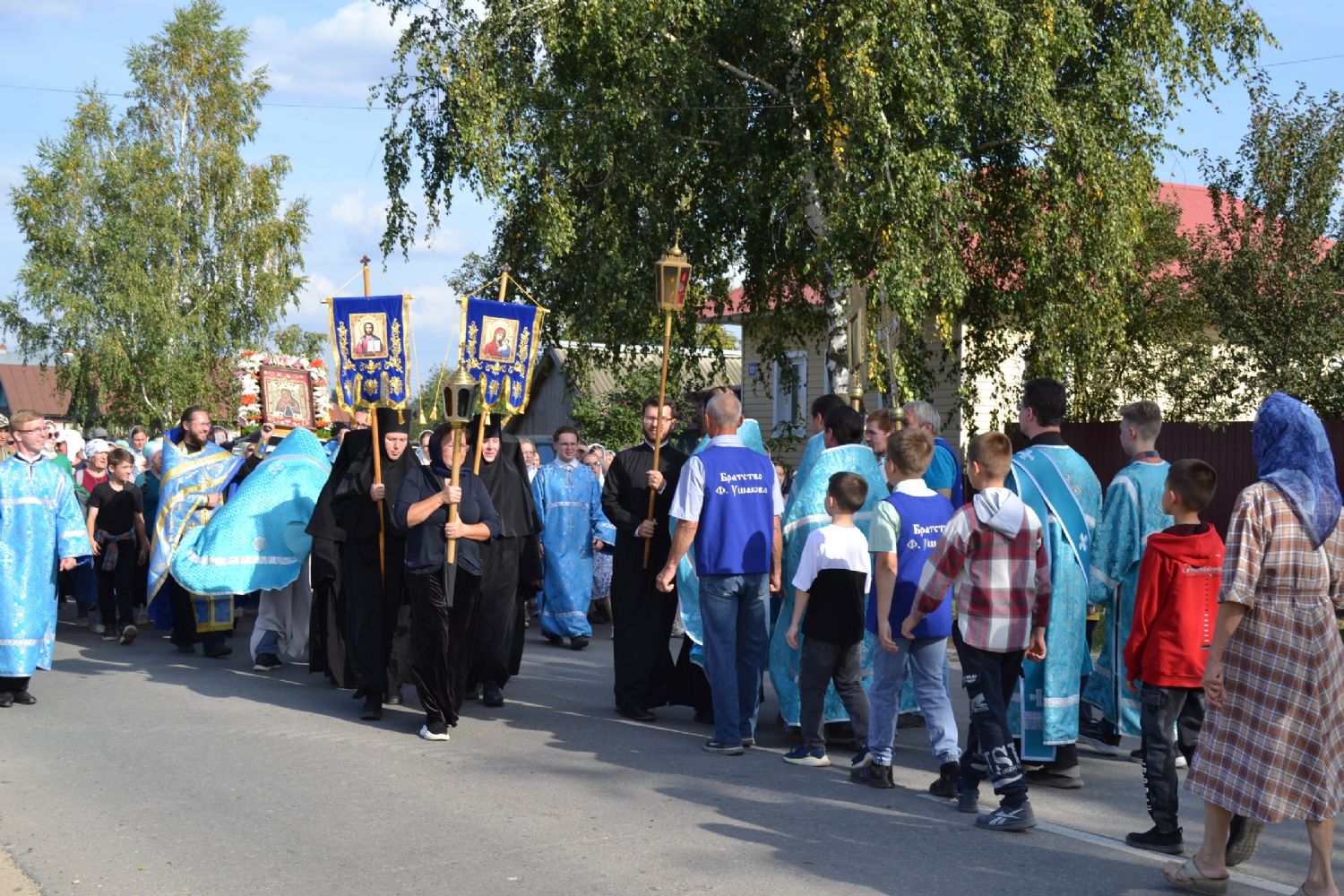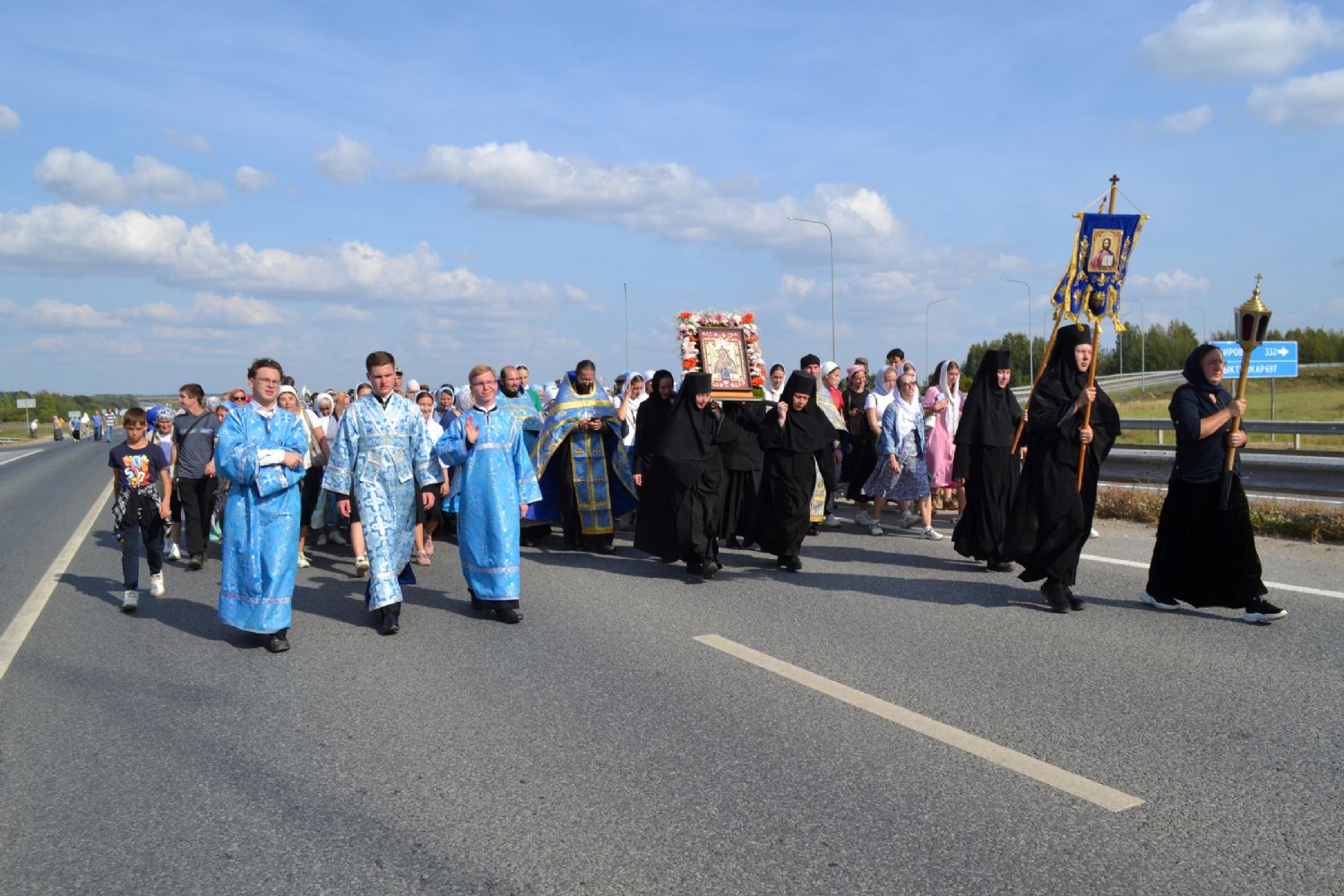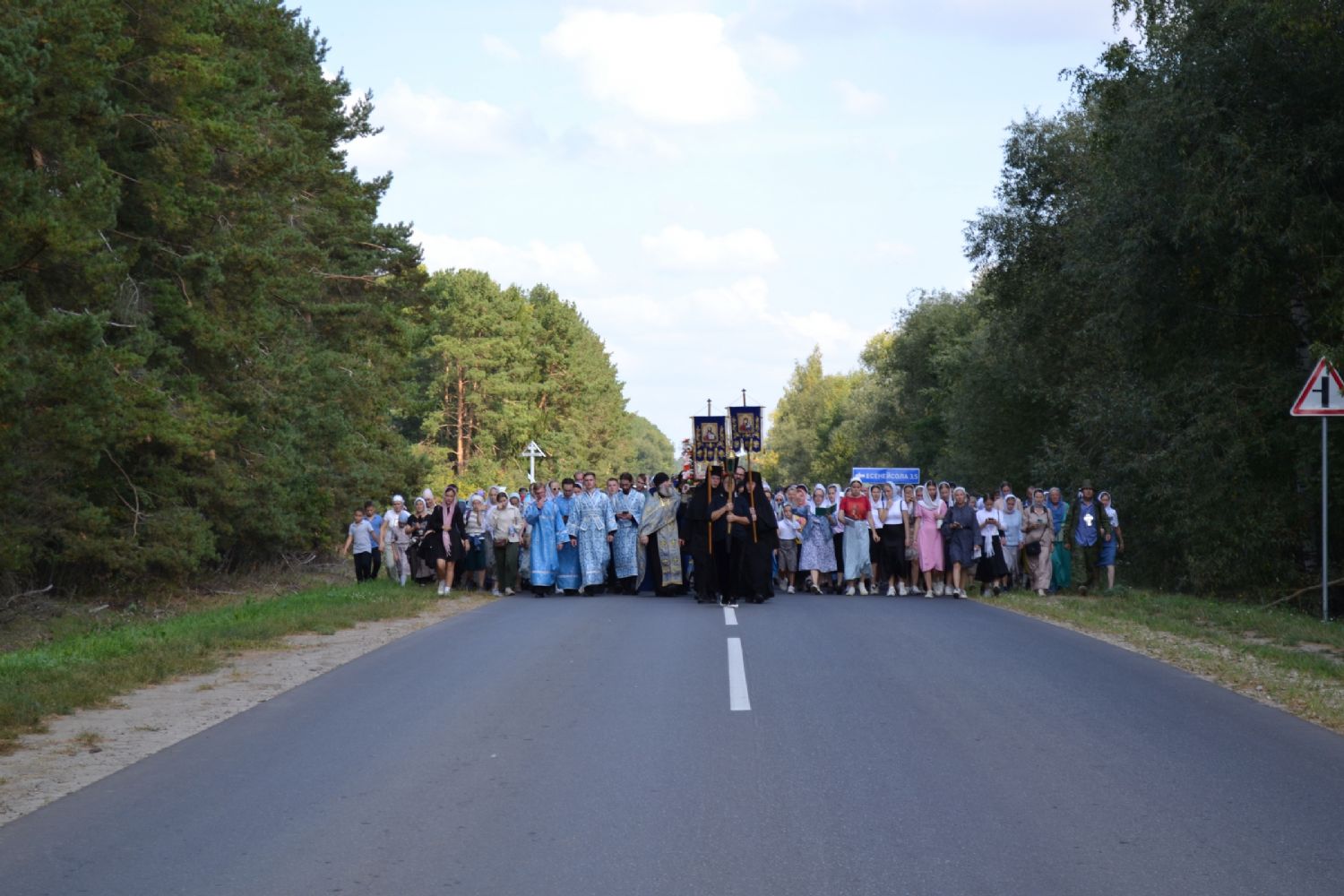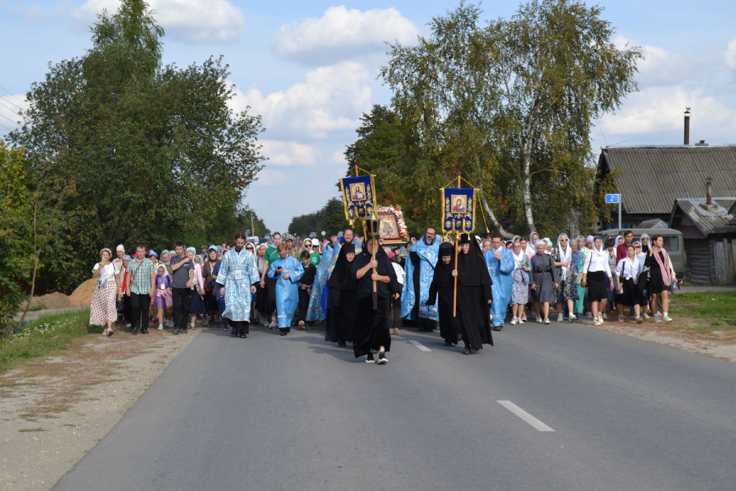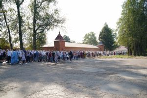 После трапезы верующие, обойдя крестным ходом с Мироносицкой иконой Божией Матери вокруг храма, двинулись к селу Семеновка, пройдя по пути через села Ким, Юшково, Кузнецово, Данилово. На подходе к Семеновке крестоходцев радостно встретили священнослужители и прихожане храма Рождества Пресвятой Богородицы.