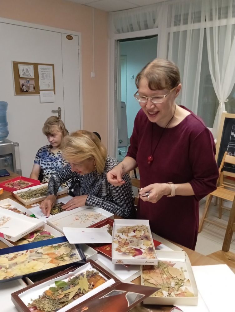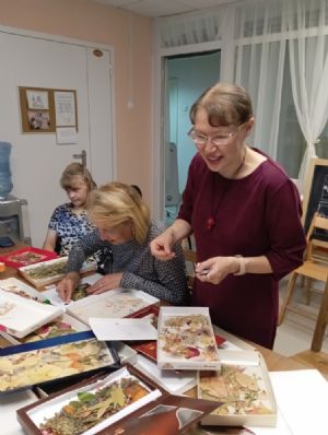 Затем собравшимся было предложено украсить икону праздника цветами в технике флористики. Флористика – это создание работ из засушенных цветов, листьев, лепестков, трав. Педагог показала приемы работ в этой технике, а также продемонстрировала свои работы, выполненные в технике флористики. Это были иллюстрации к японской поэзии, так как флористика или «ошибана» – древнейшее традиционное японское искусство.