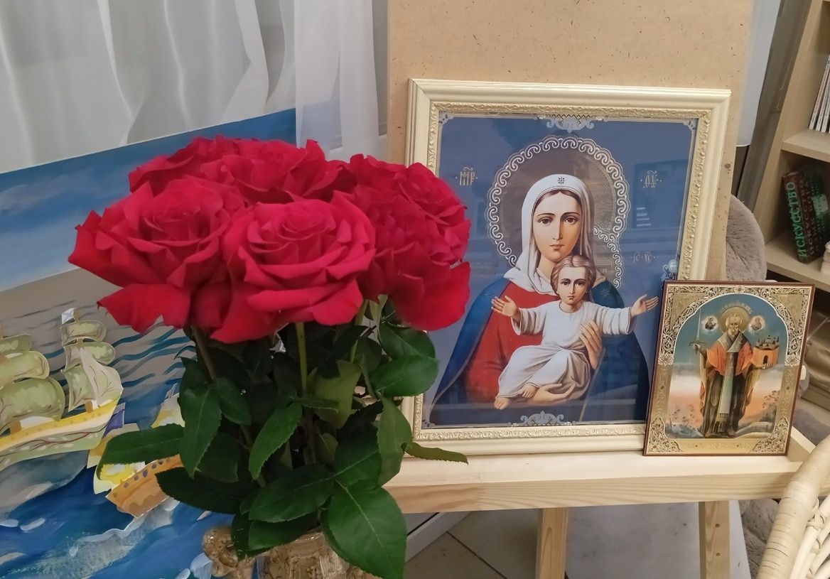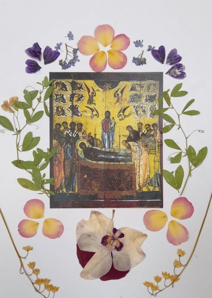 Эти и другие цветы были использованы в работе. Участники творческого занятия украсили икону Пресвятой Богородицы цветами, напоминающими о Ее красоте, духовном совершенстве.