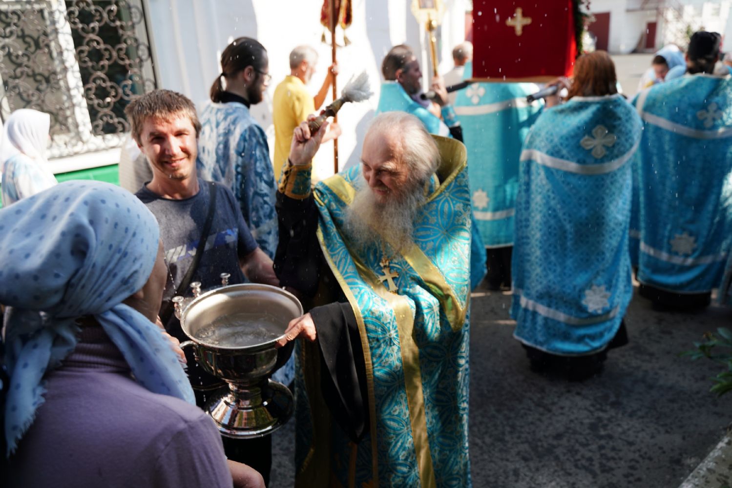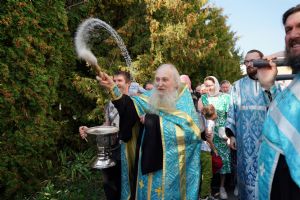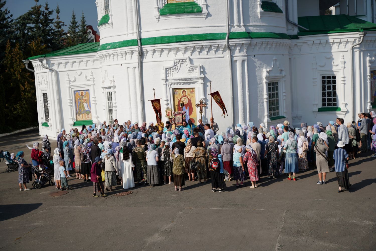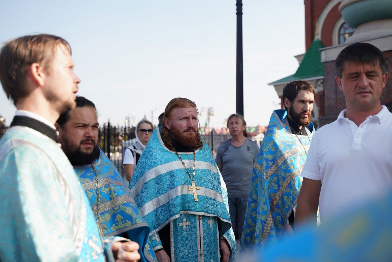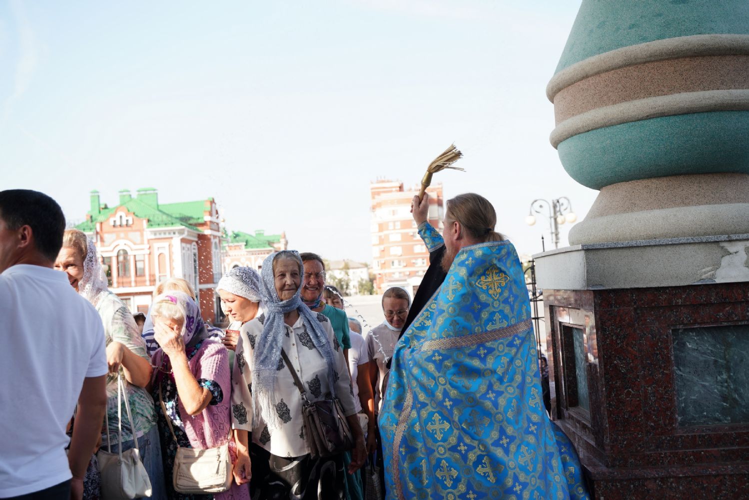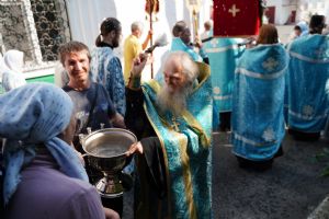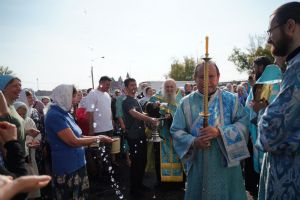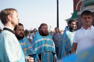 Вначале верующие во главе с настоятелем Вознесенского собора протоиереем Евгением Кутыревым обошли крестным ходом вокруг храма со чтением Евангелия и кроплением святой водой.